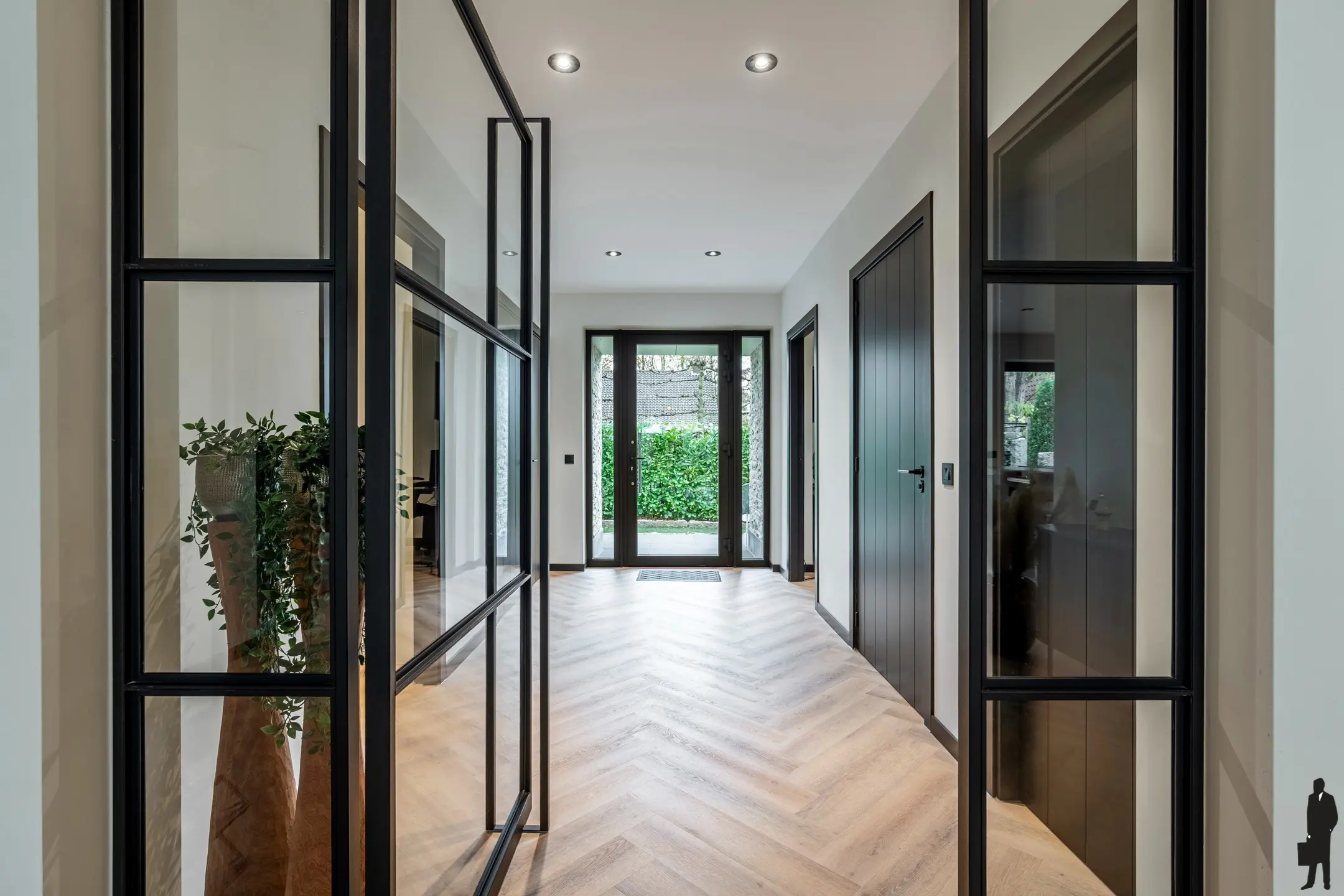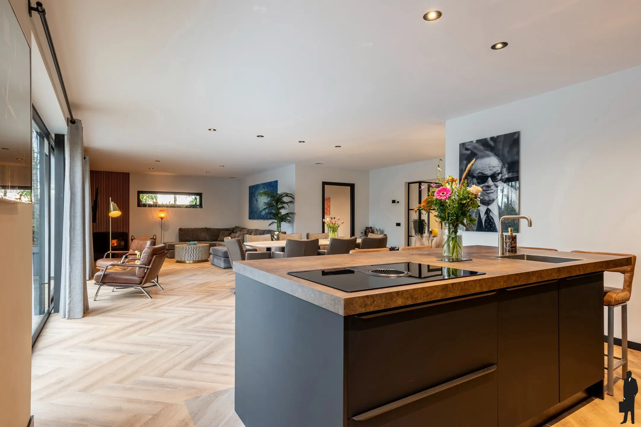 Via de stalen deuren in de hal kom je in de ruime leefruimte van circa 70m².