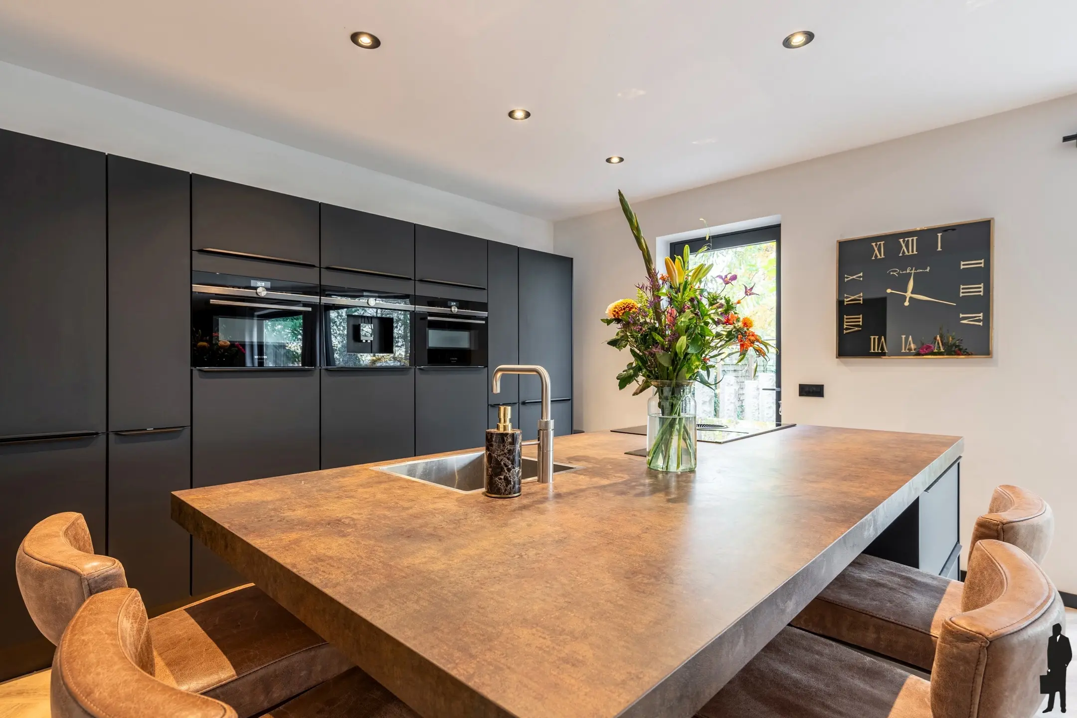 De open keuken heeft een kookeiland met daarin een inductiekookplaat met afzuigsysteem een vaatwasser en een Quooker.