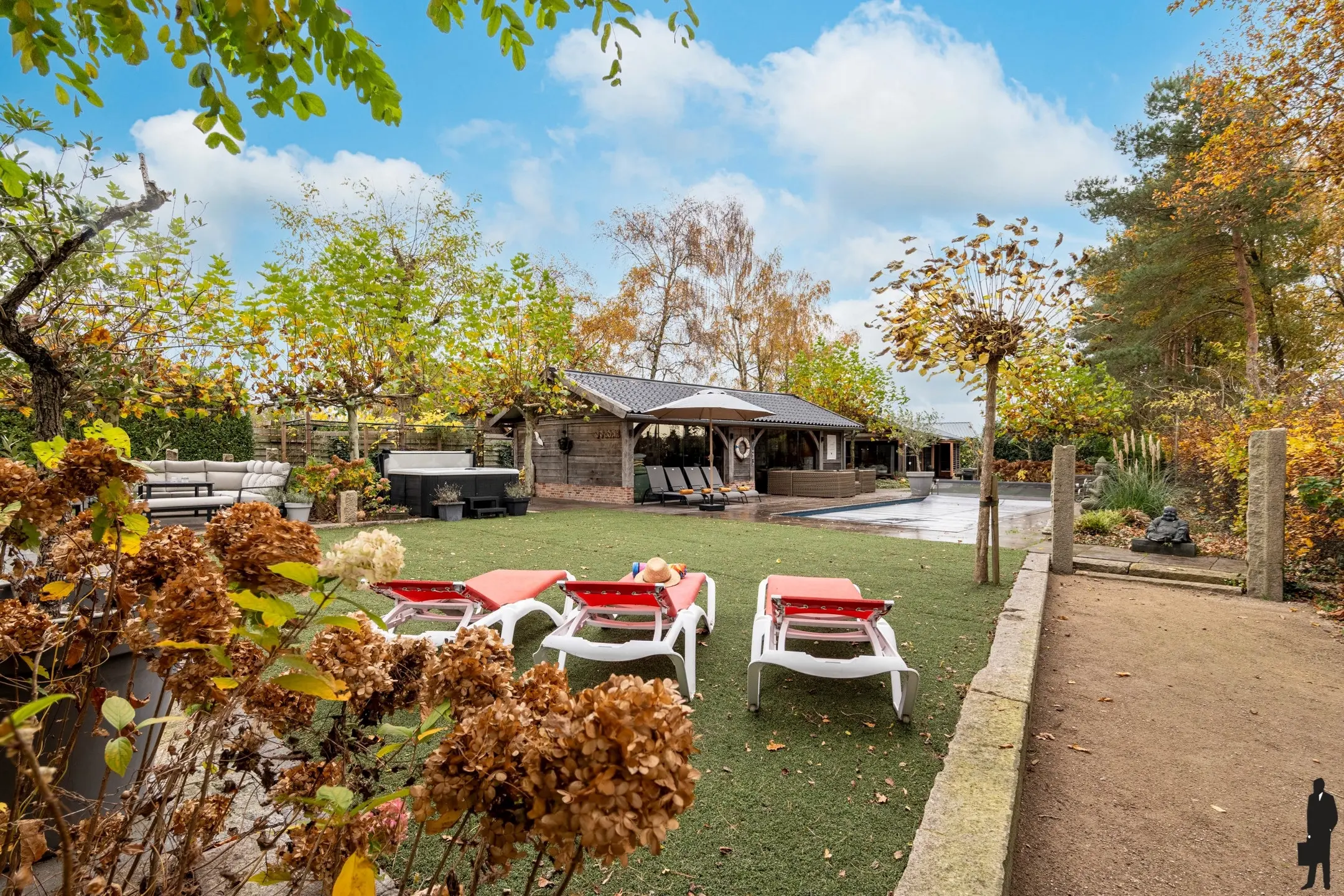 De privacy biedende tuin is geheel aangelegd, heeft meerdere terrassen en is voorzien van een verwarmd (warmtepomp) zwembad met buitendouche.