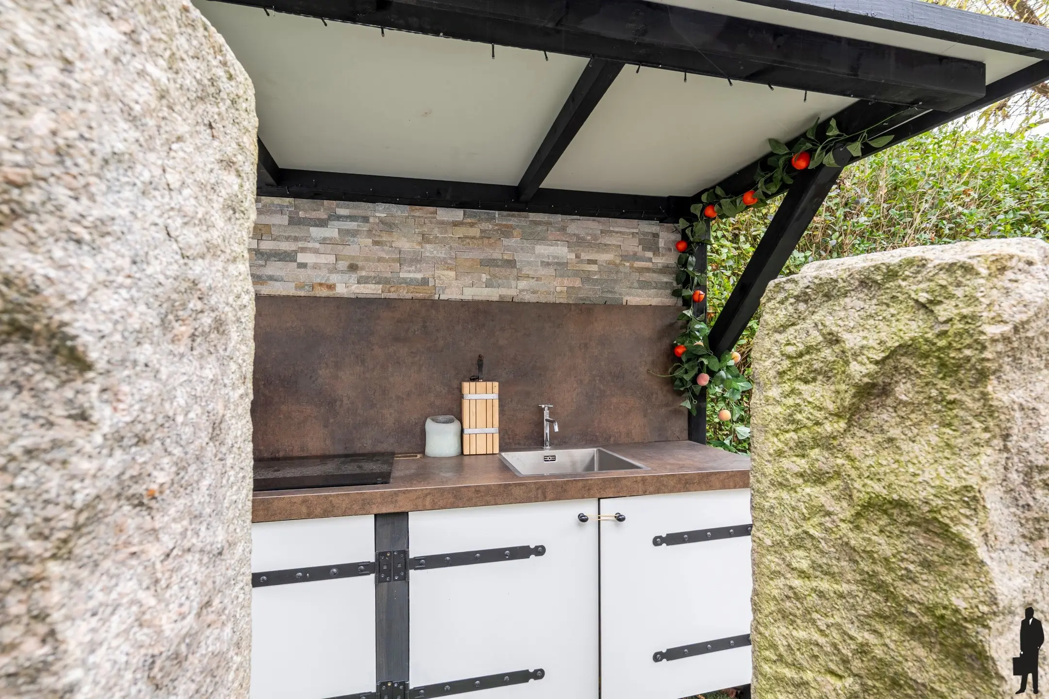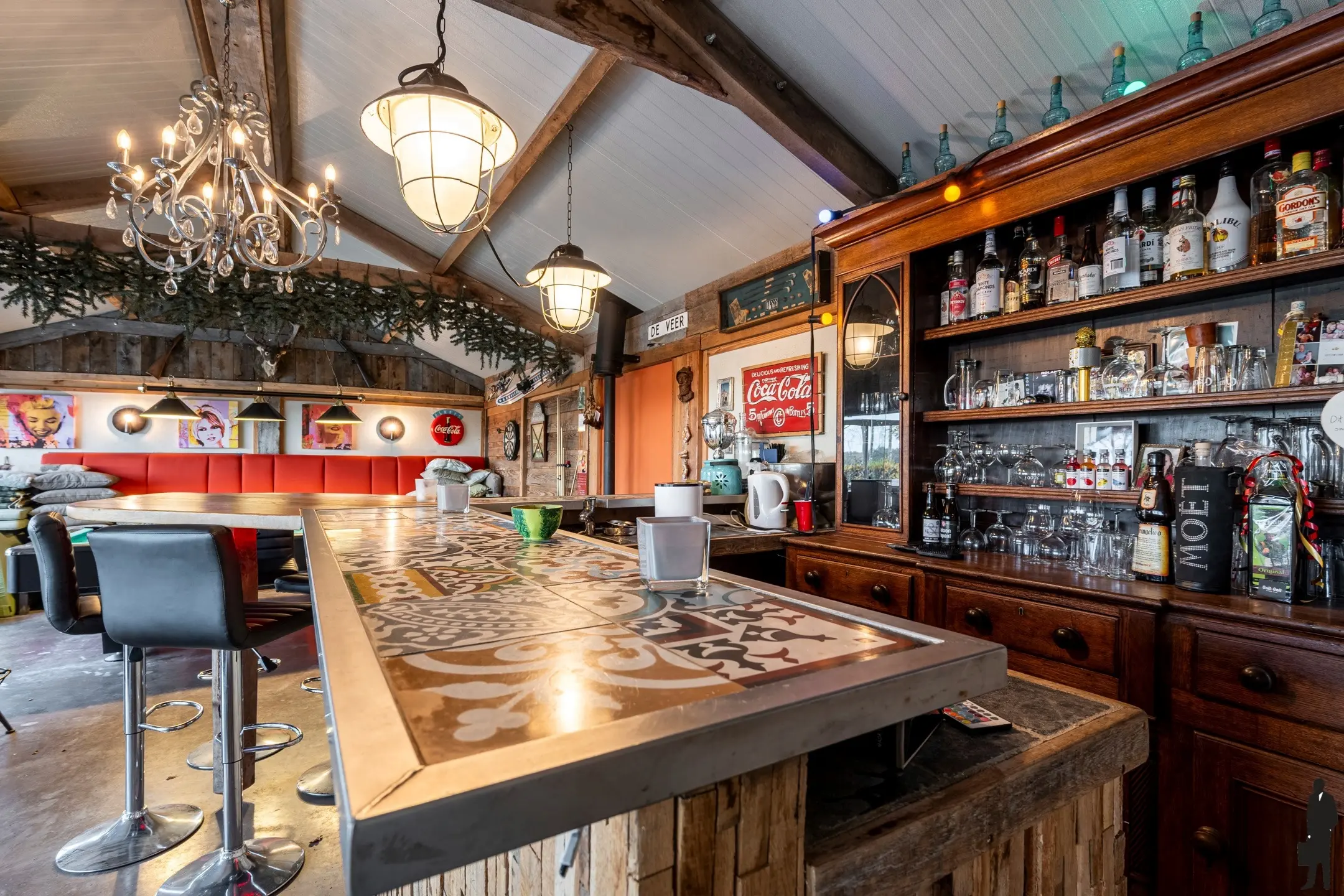 Het gebouw is momenteel ingericht als bar/relaxruimte, heeft glazen schuifdeuren, volledig ingerichte bar, toilet en voor de verwarming een palletkachel. In dit gebouw is tevens de installatie voor het zwembad geplaatst.