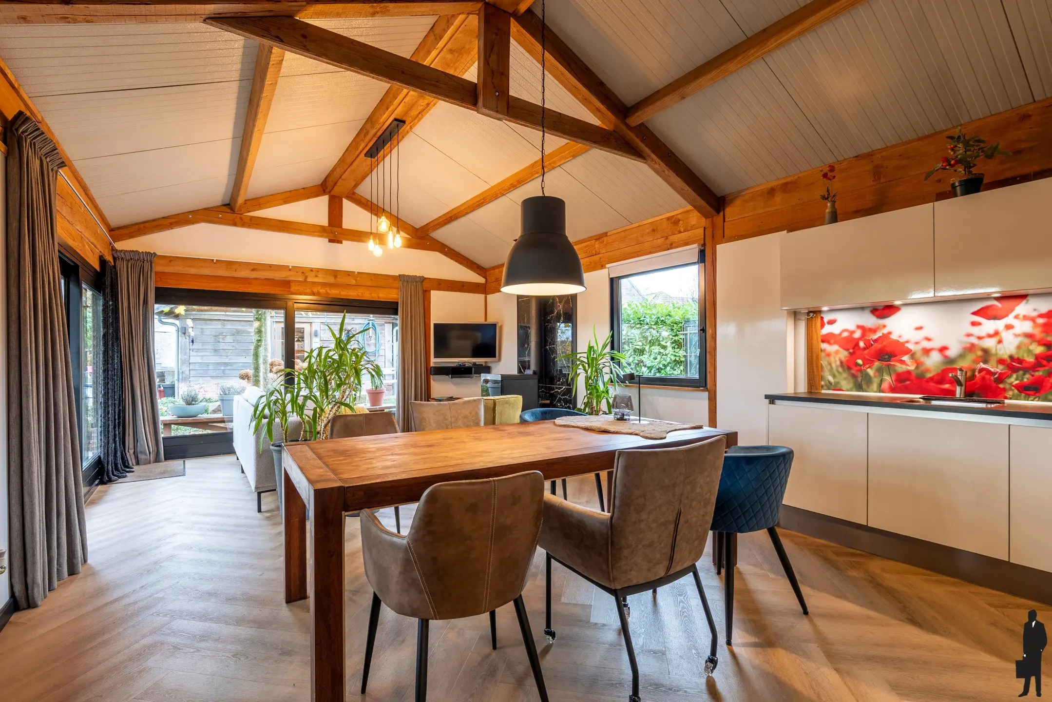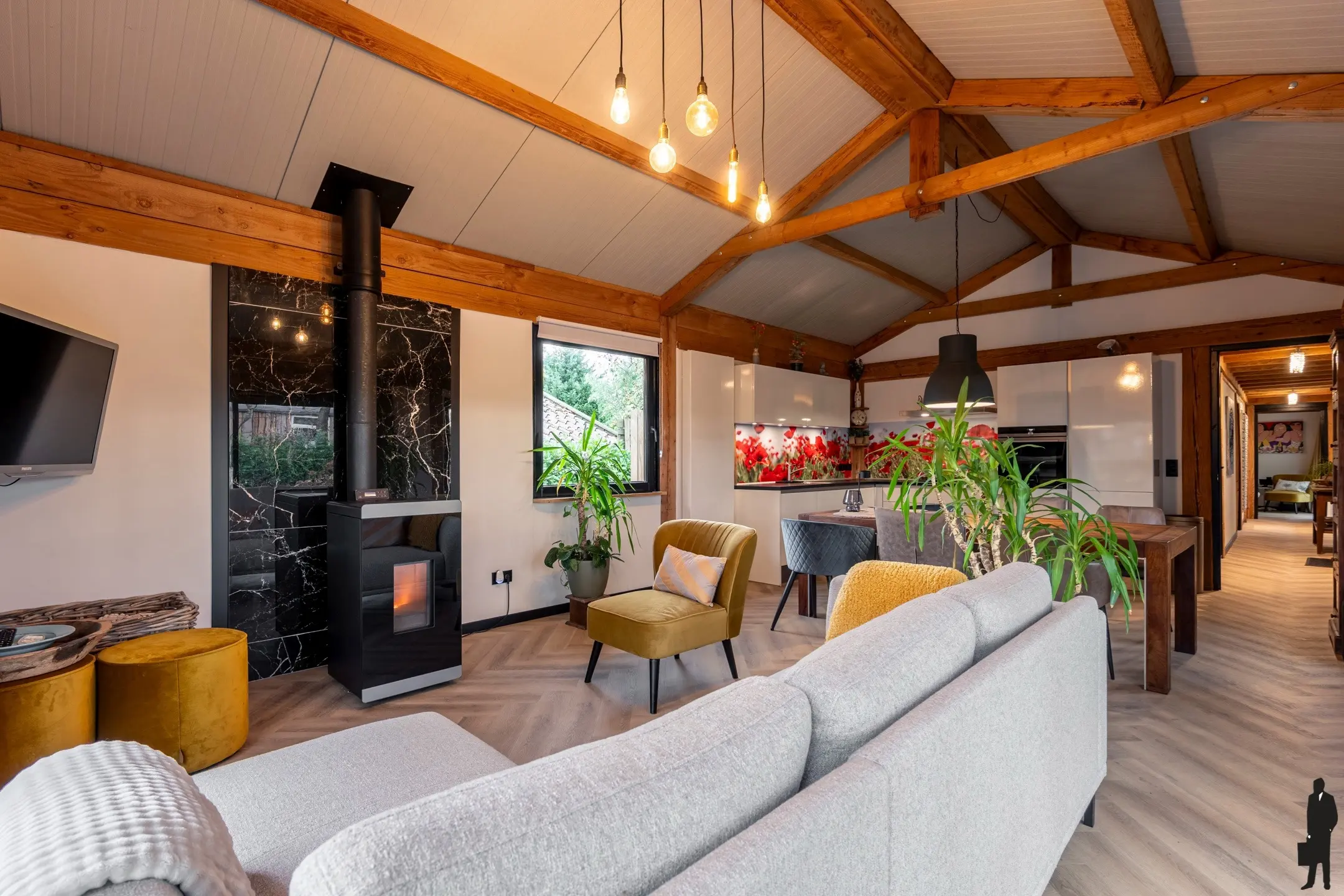 Via de entree aan de zijkant bereikt u de leefruimte met palletkachel. Open keuken voorzien van inbouwapparatuur.