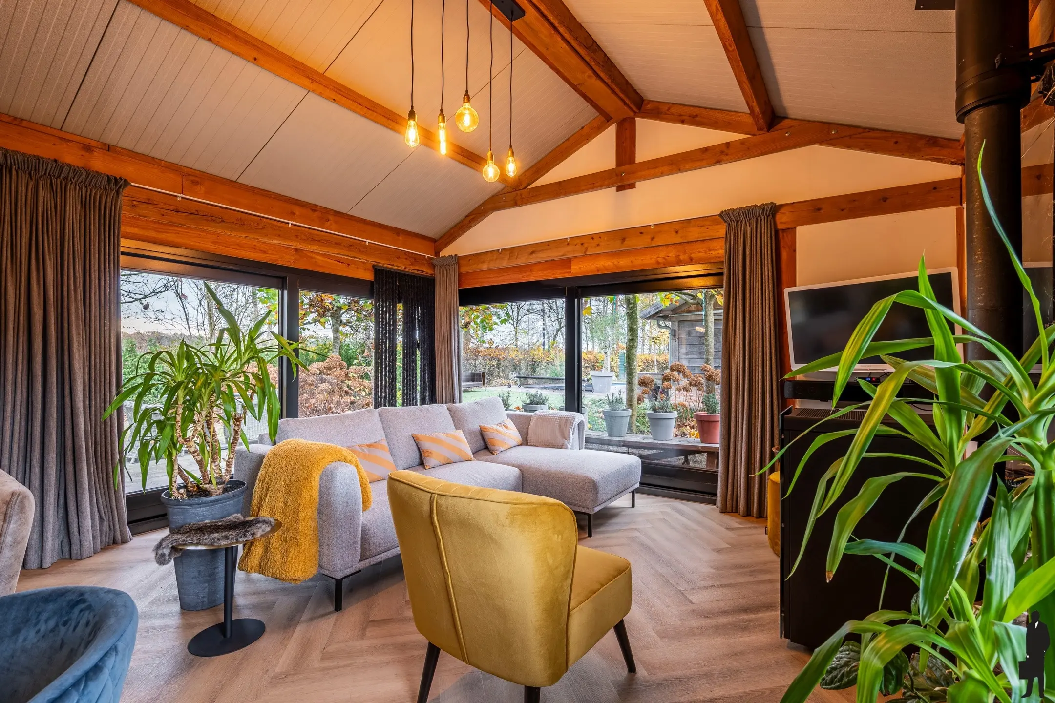De lichte woonkamer heeft een schuifpui naar het terras en er is een gezellige paletkachel.