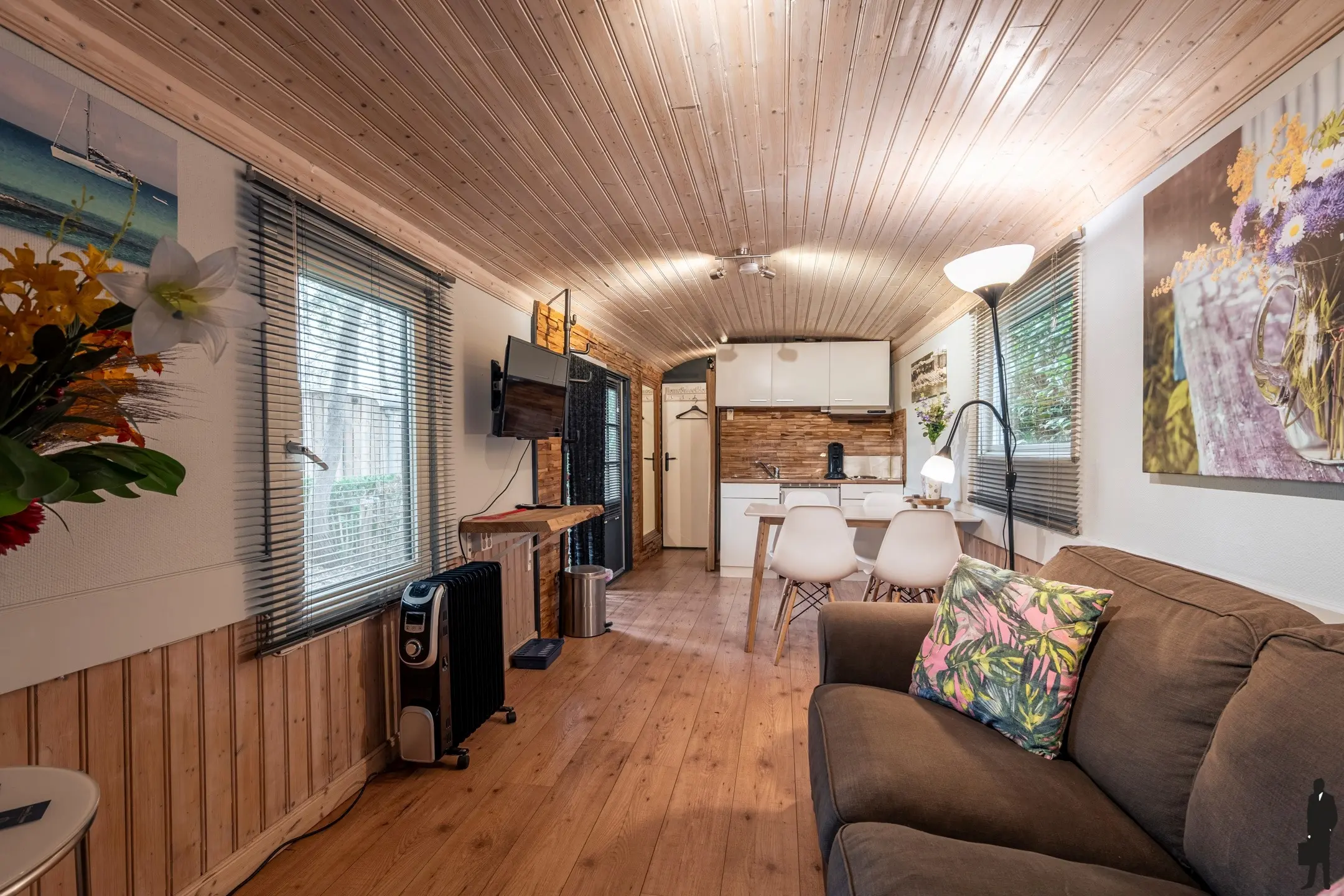 Deze '' wagen'' is geheel ingericht met slaapkamer en een leefruimte met keukenblok en een badkamer met douche, wastafel en toilet.