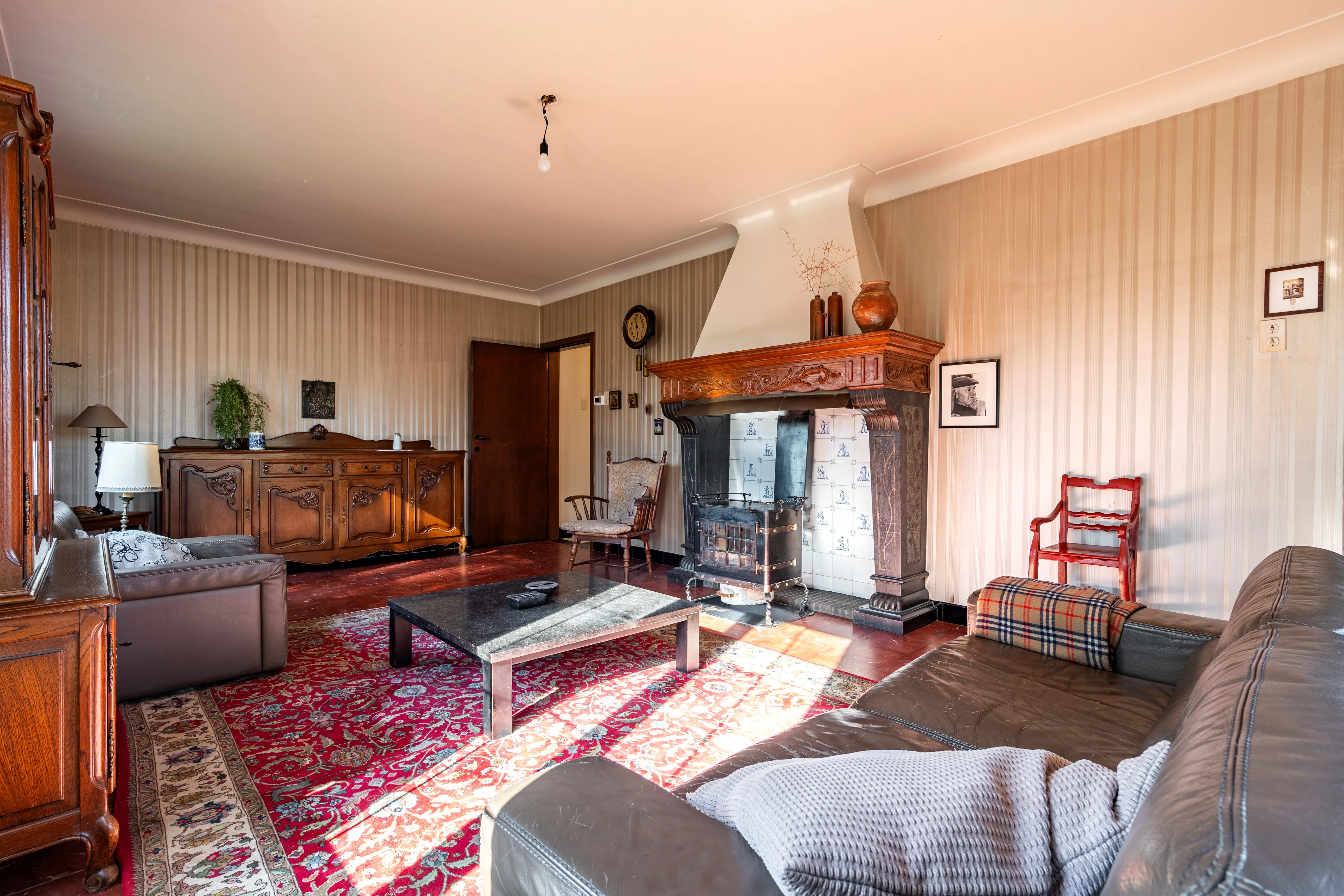 De leefruimte op tegel beschikt over een nostalgische schouwmantel in arduin en hout met fraai, gedetailleerd gravurewerk.