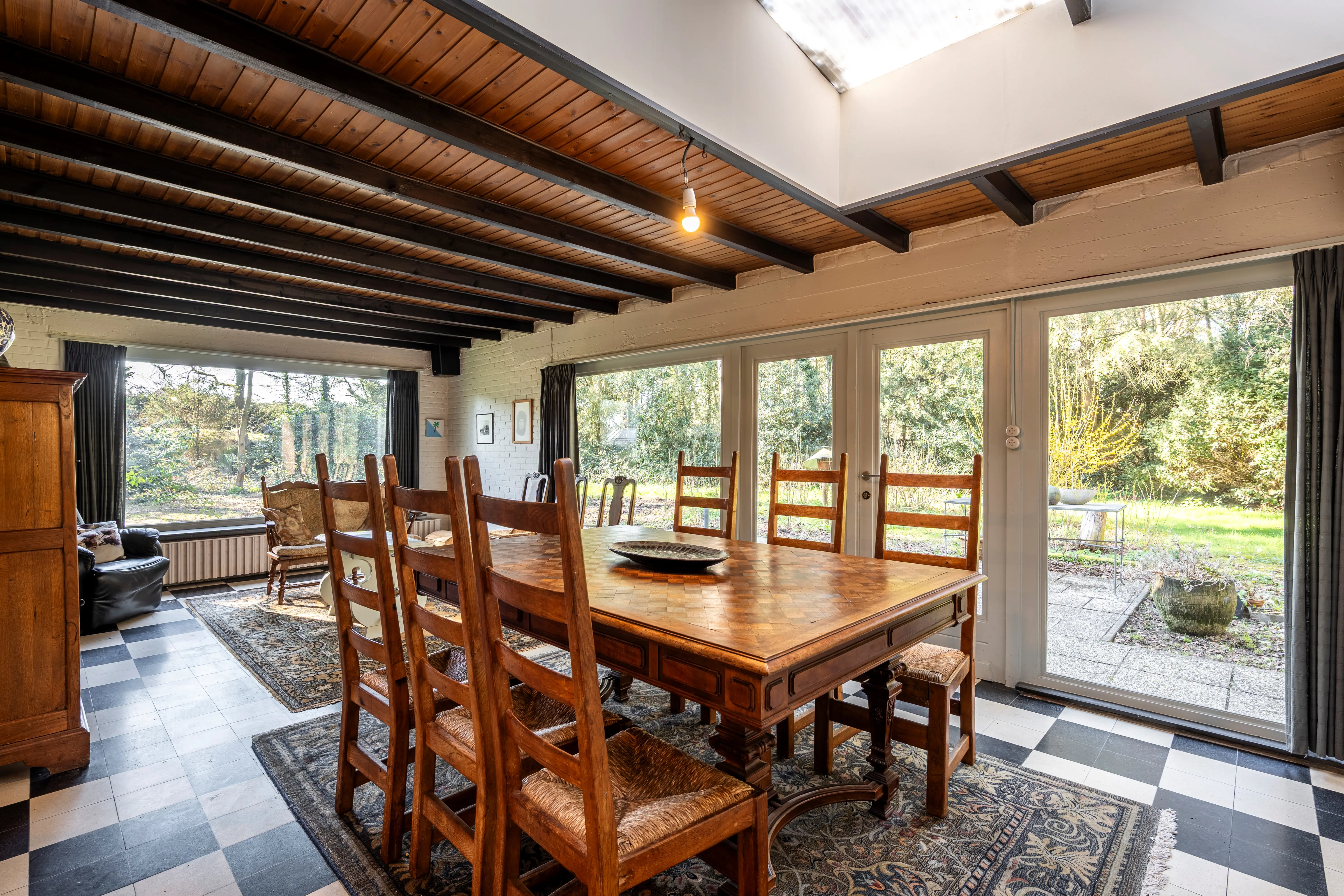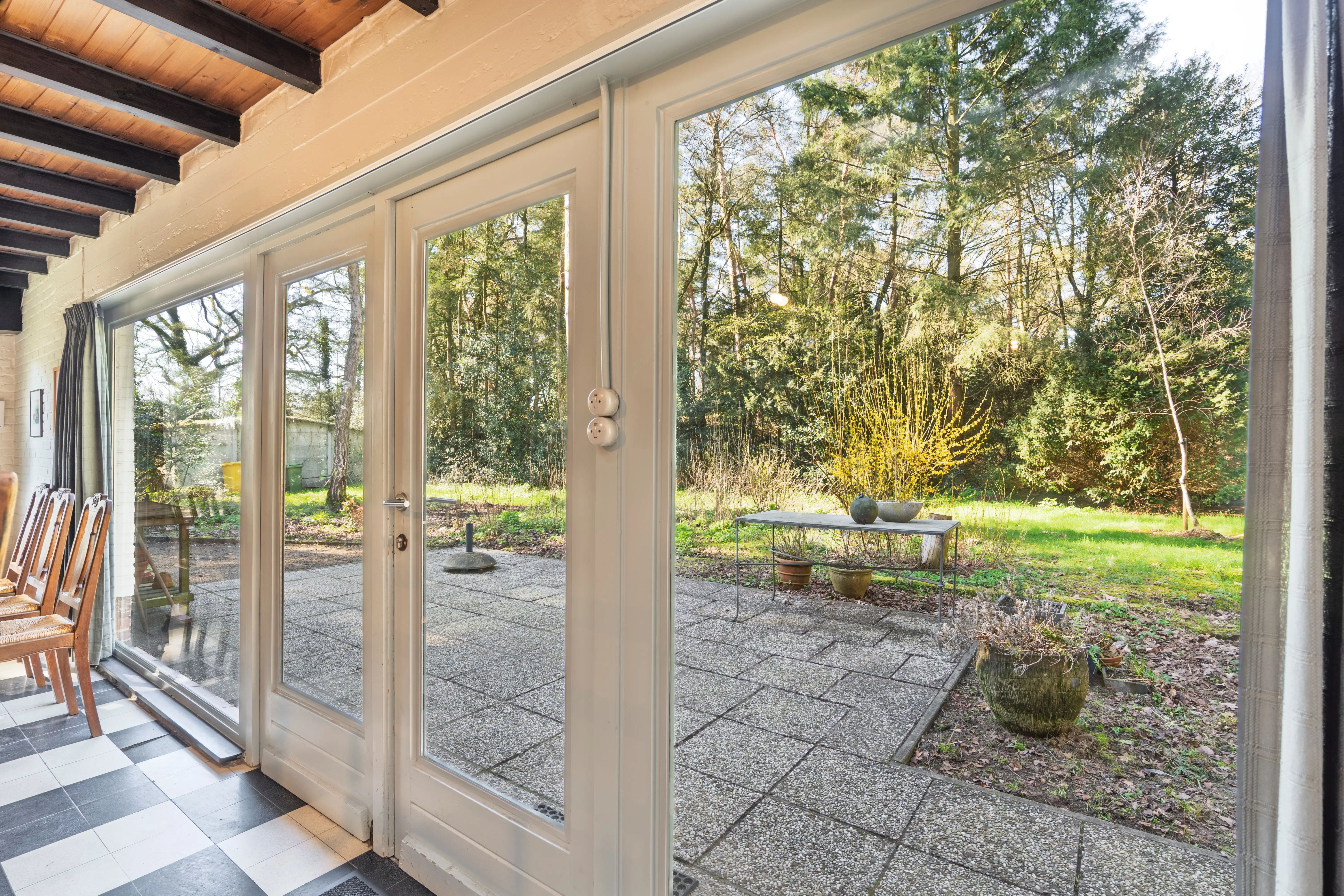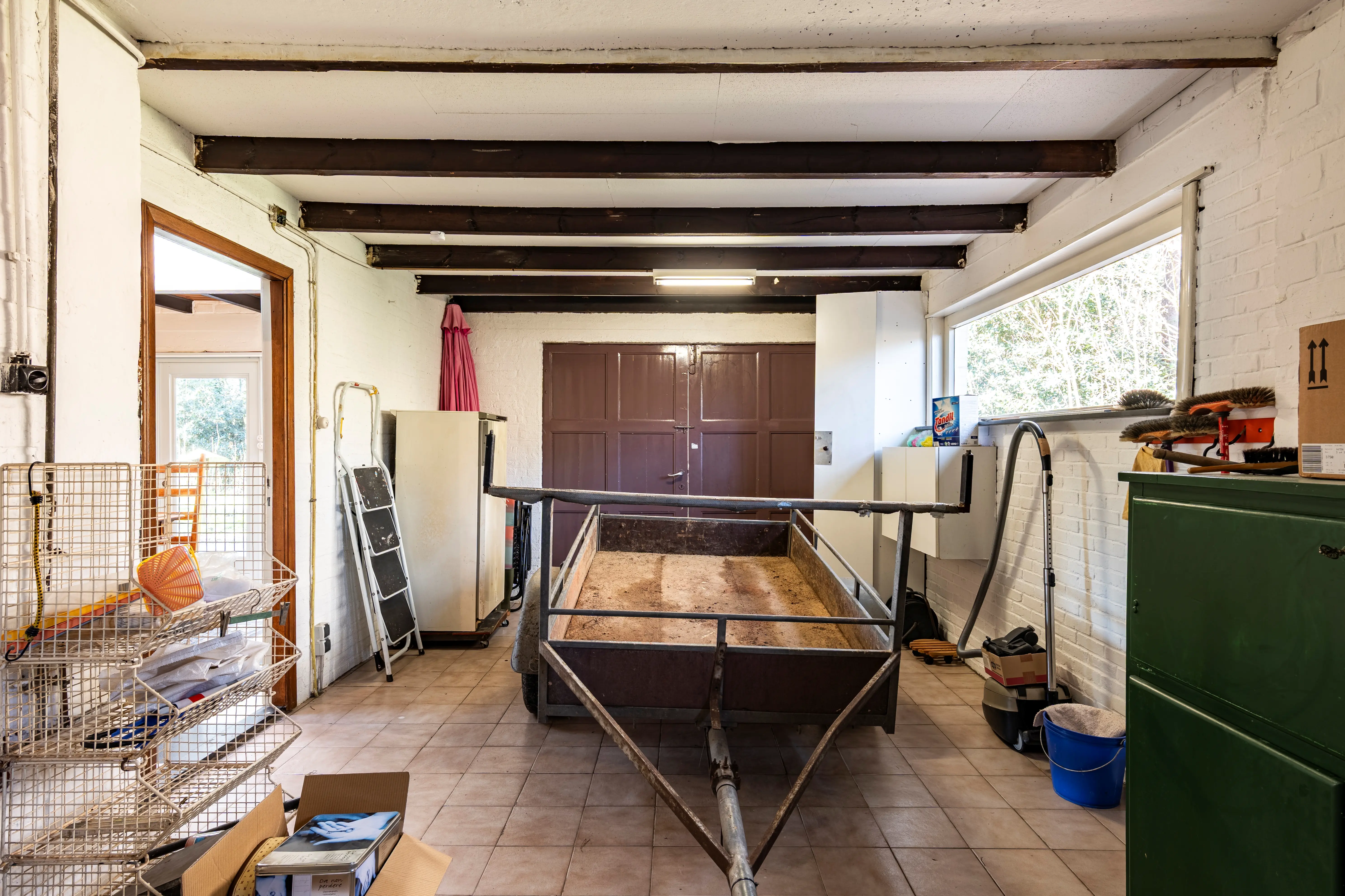 Via de leefveranda (die gelet op haar grootte dienst kan doen als bijkomende leefruimte) heeft u toegang tot de riante garageruimte / bergruimte. Beide ruimtes geven uit op de bosrijke achtertuin en het omliggend (eigen) groen.