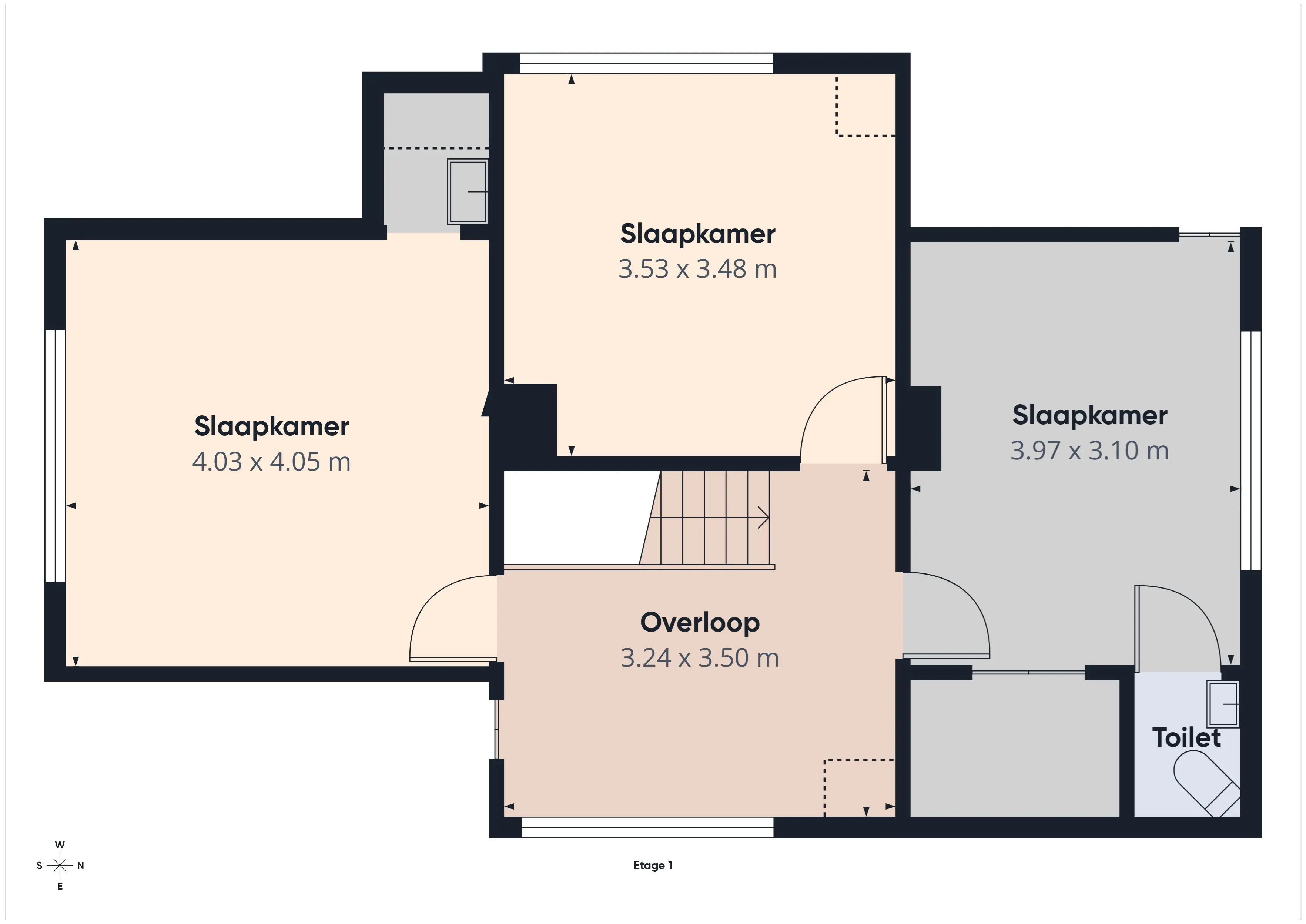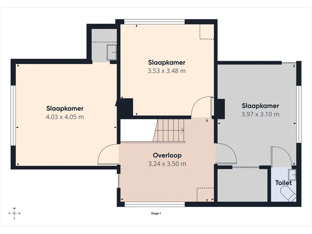 Hier bevinden zich 3 ruime slaapkamers, allen voorzien van wastafel (één ervan is bovendien voorzien van eigen toiletruimte).