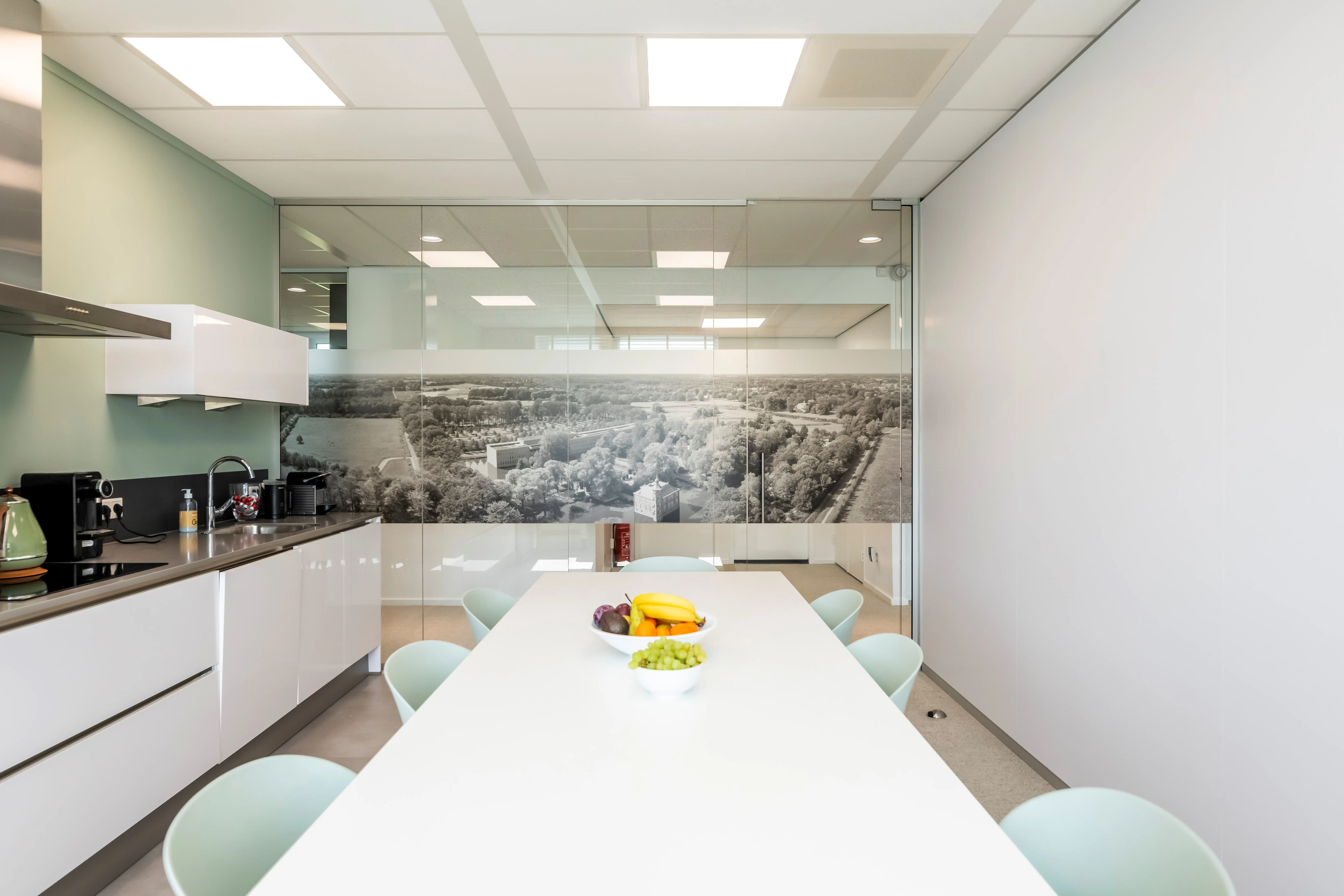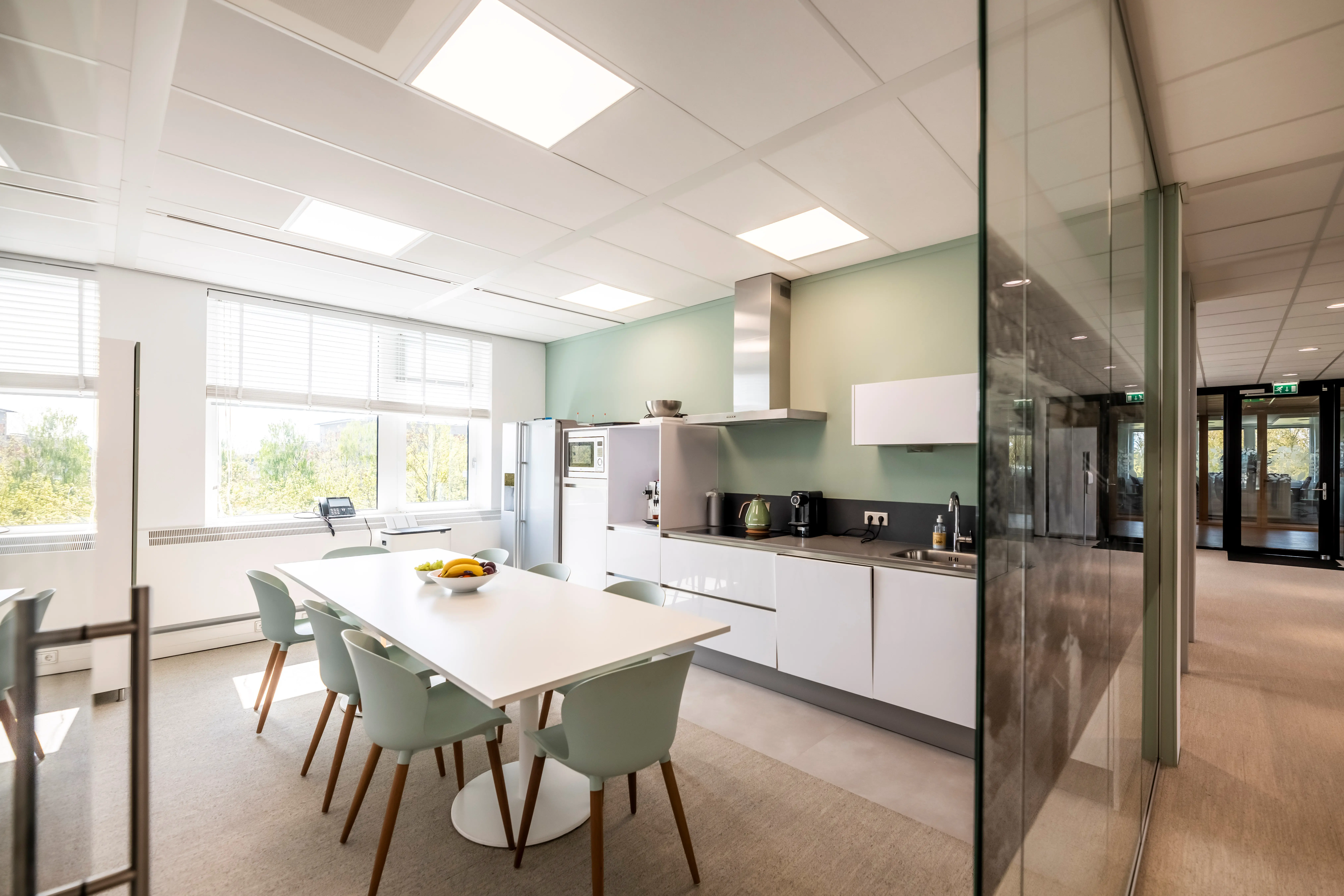 De kantoorruimtes zijn opgedeeld in twee tegenover elkaar liggende ruimtes:
