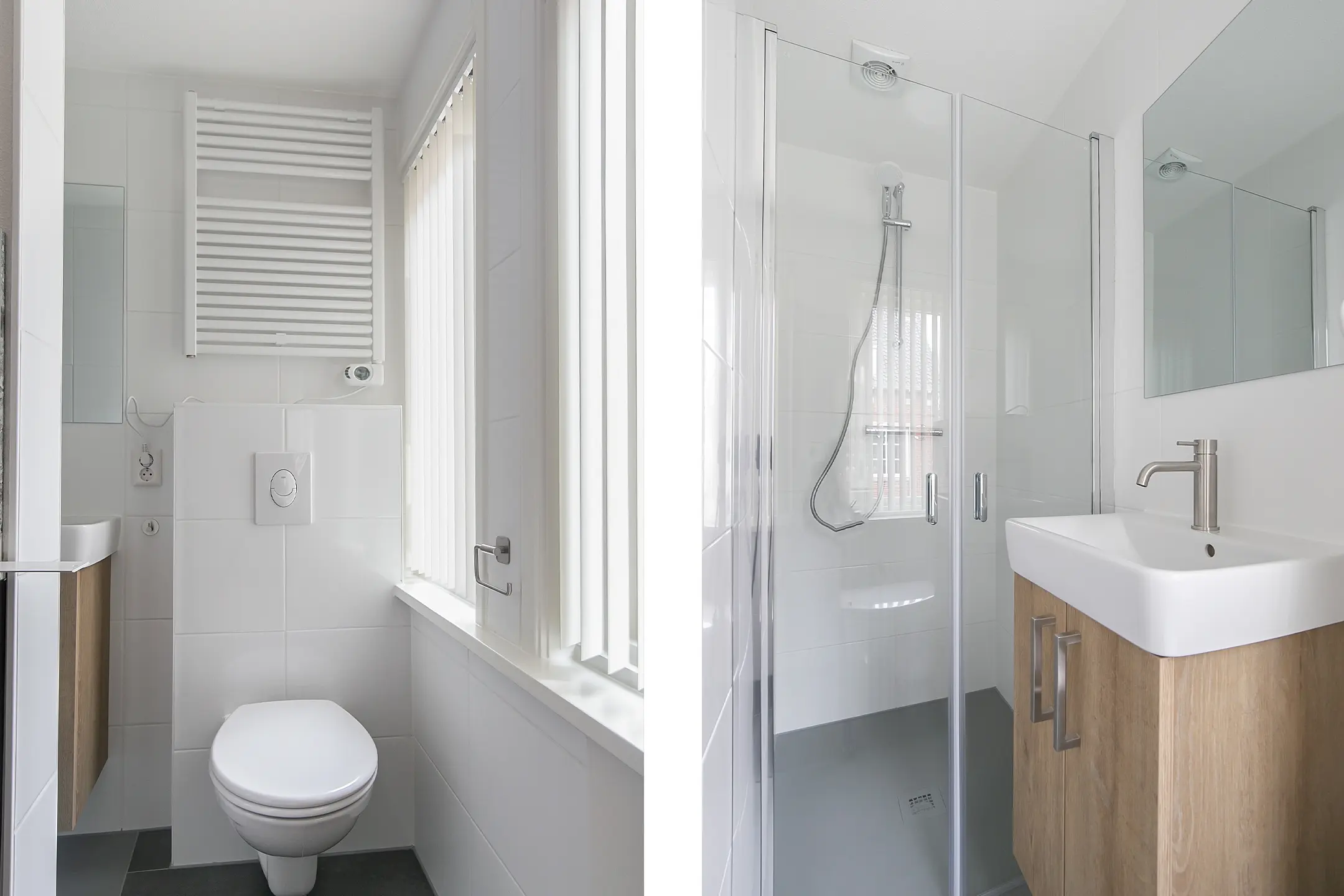 - Badkamer met wastafel, badkamermeubel, douche, toilet, handdoekradiator,