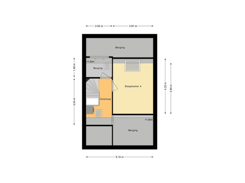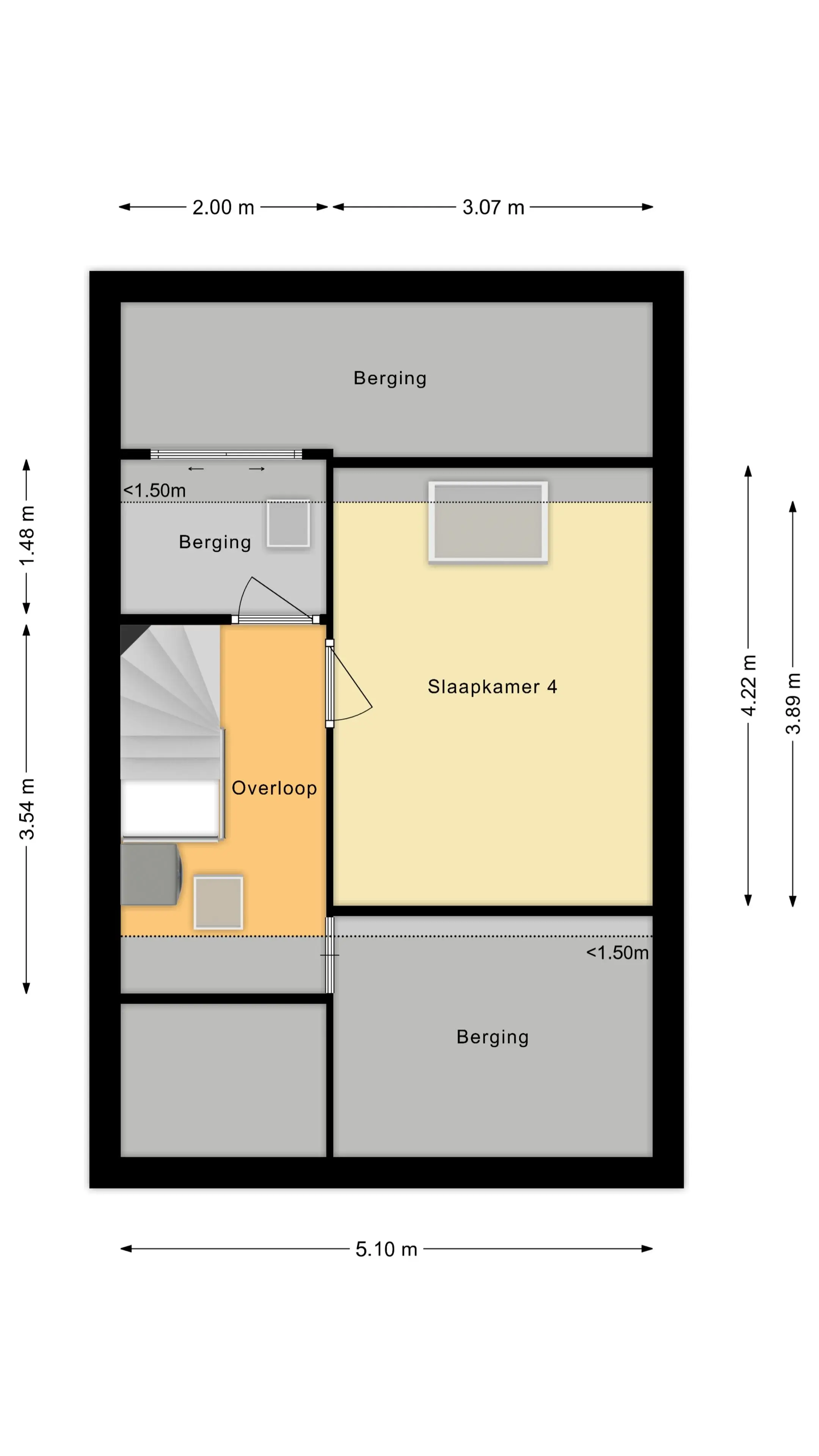 Een grote slaapkamer met dakraam, een berging met knieschotten en ruimte voor wasmachine en droger.