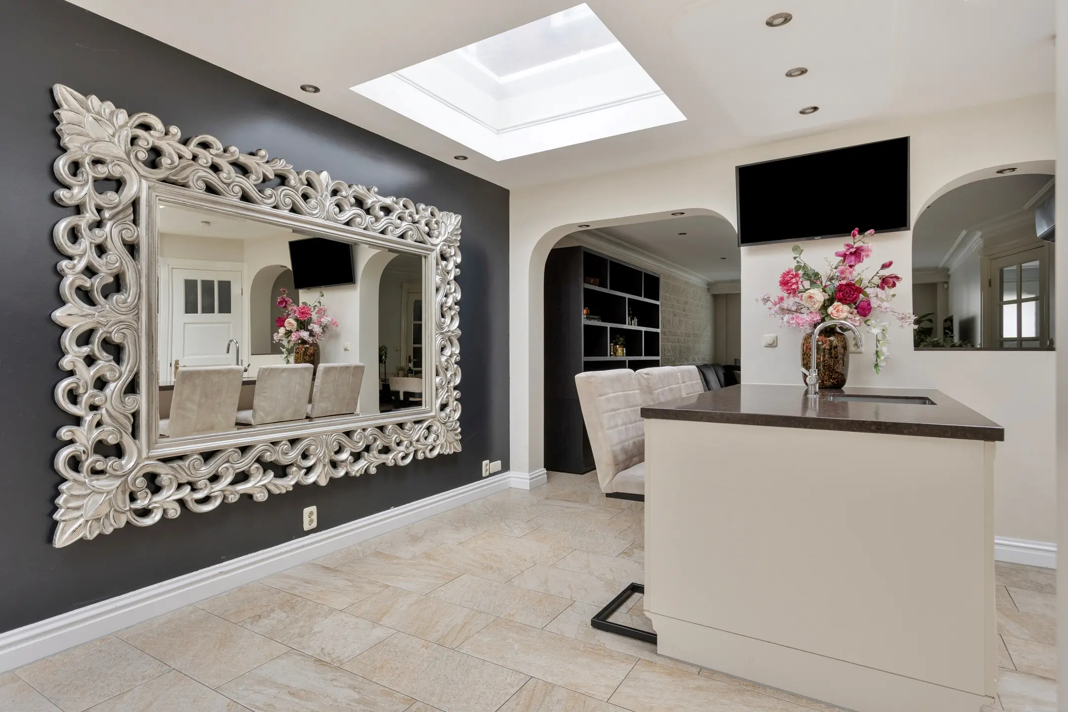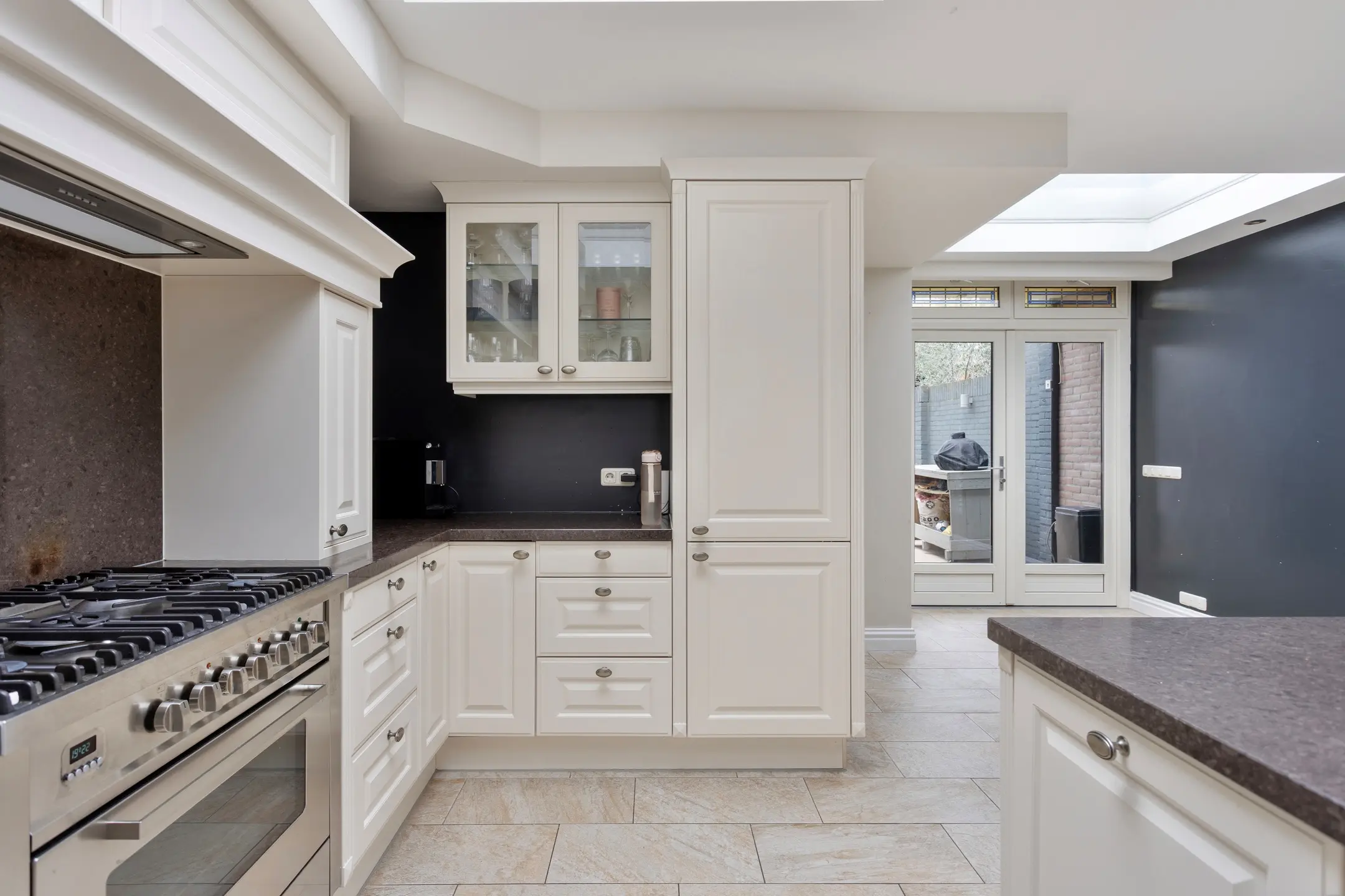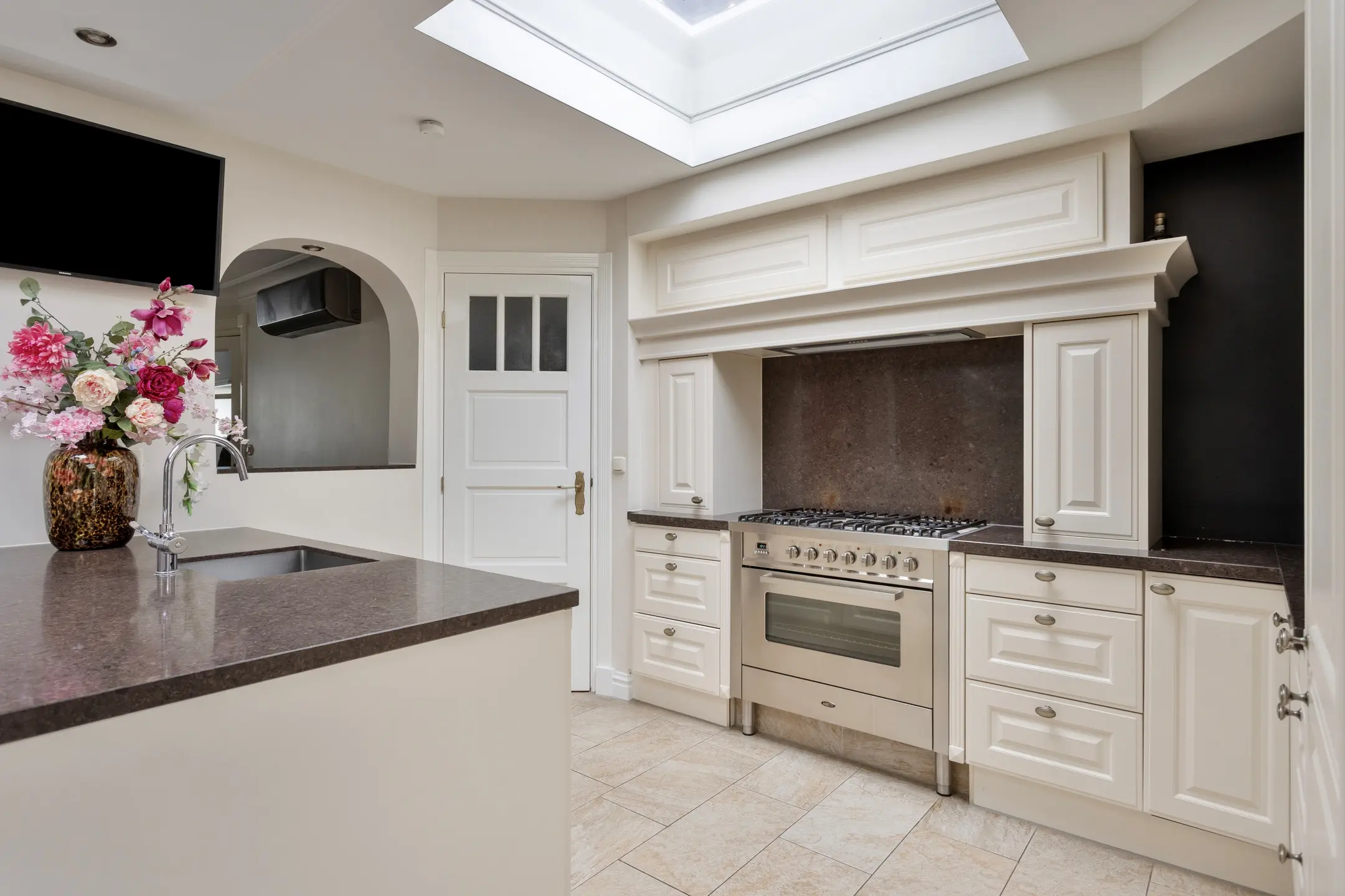Aansluitend loopt u de woonkeuken in – een ruimte die direct indruk maakt. De lichtkoepel zorgt voor extra veel daglicht en versterkt het open karakter. De keuken is uitgevoerd in een lichte opstelling met een stijlvol stenen werkblad. Het prachtige fornuis is een echte eyecatcher en maakt koken hier tot een beleving. Aan de bar is plek om gezellig aan te schuiven voor een ontbijt of een glas wijn terwijl er gekookt wordt. Uiteraard is de keuken voorzien van een koelkast, vaatwasser en een Cooker voor direct kokend water.