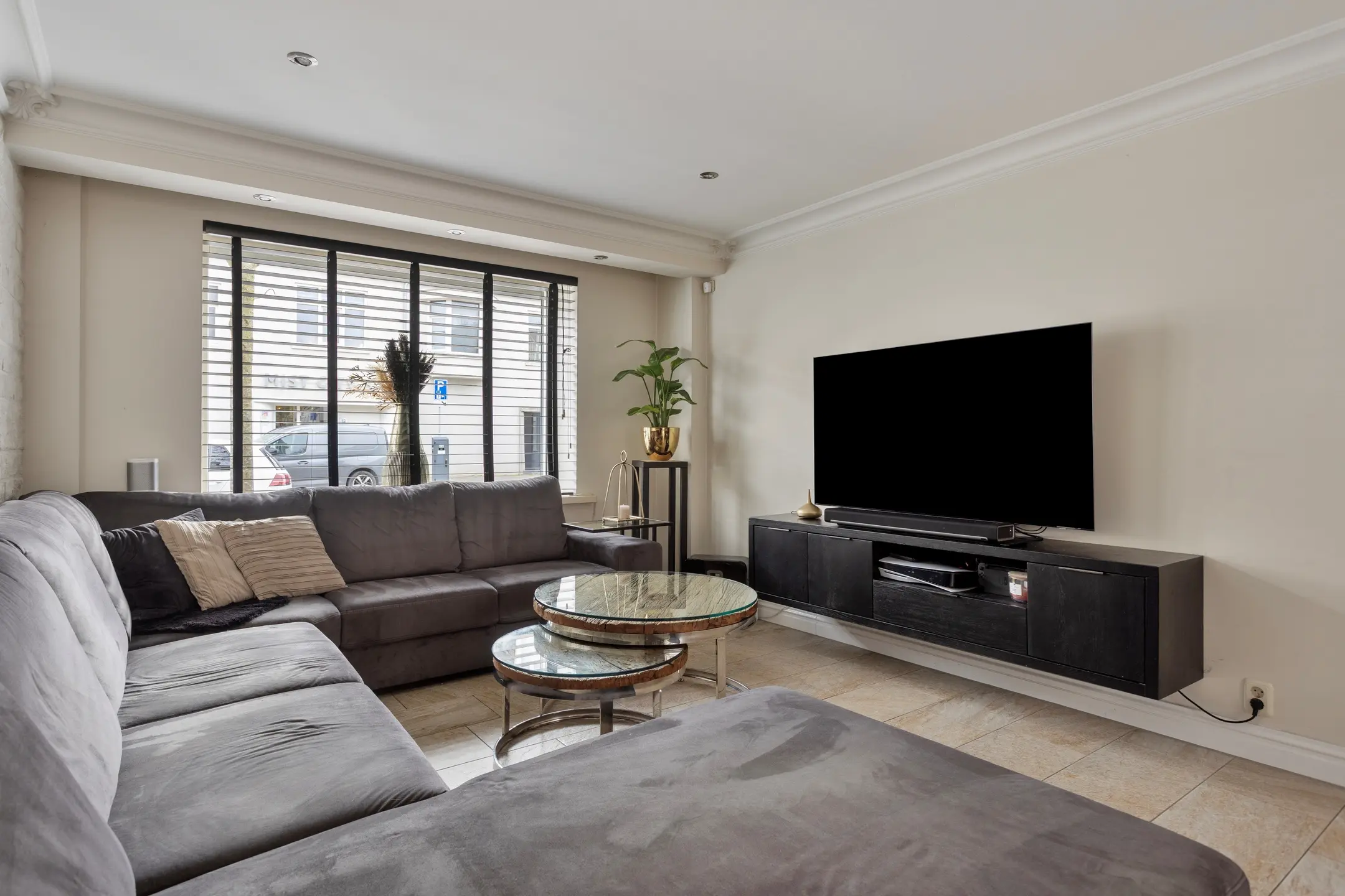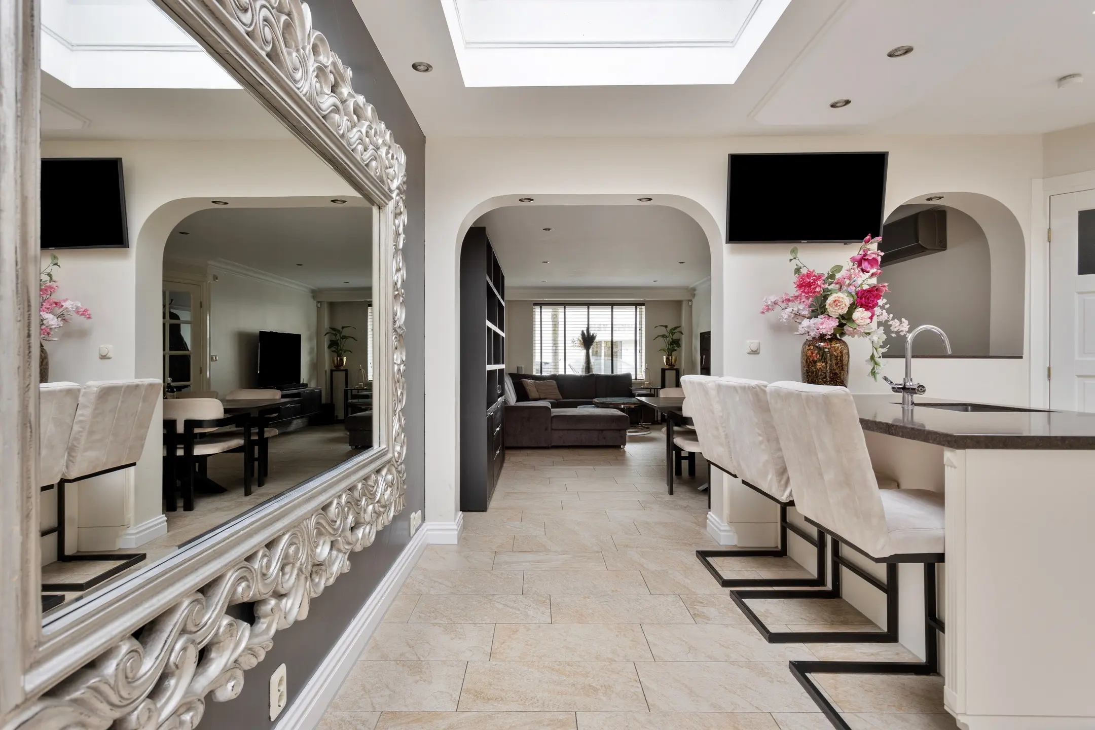De woonkamer is ruim, licht en comfortabel. De lichte muren en lichte tegelvloer met vloerverwarming vormen een rustige basis. Grote raampartijen en openslaande deuren aan de achterzijde laten het daglicht rijkelijk binnenstromen en verbinden binnen moeiteloos met buiten. Dankzij de airconditioning is het hier in elk seizoen aangenaam verblijven.