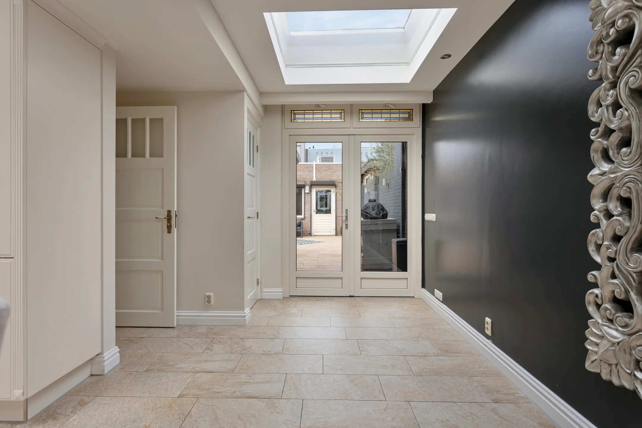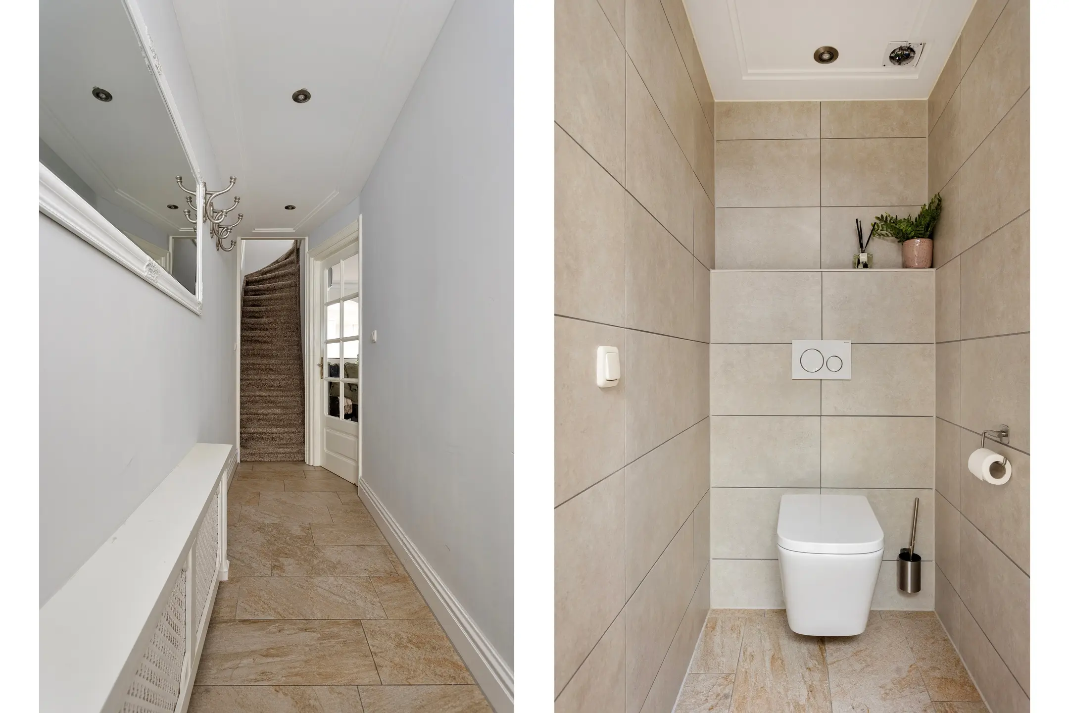 U stapt binnen in een lange, lichte hal die direct een verzorgde en stijlvolle indruk geeft. De mooie binnendeuren en rustige kleurstelling zorgen voor een warm welkom. Vanuit hier heeft u toegang tot de woonkamer en de trapopgang naar de eerste verdieping.