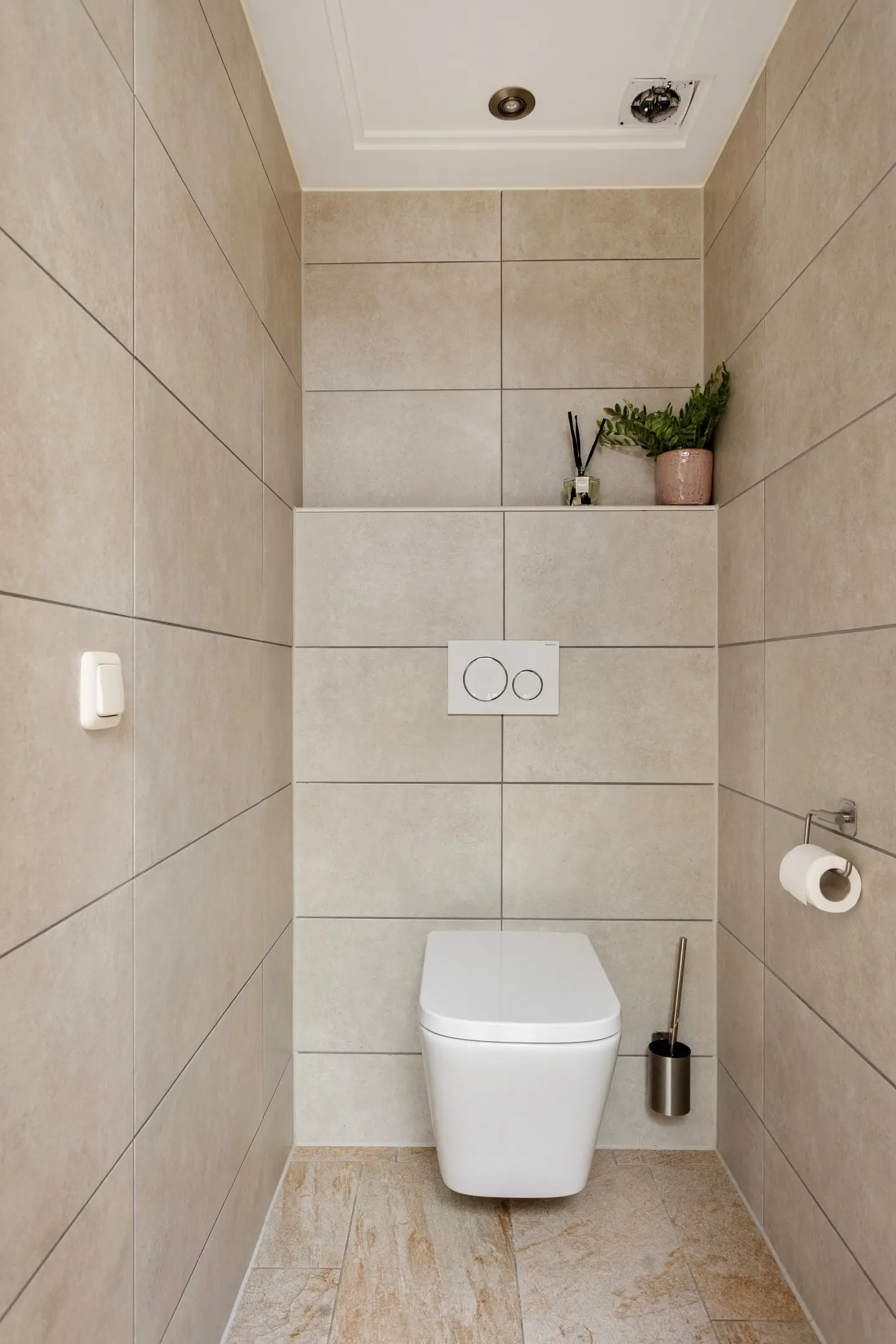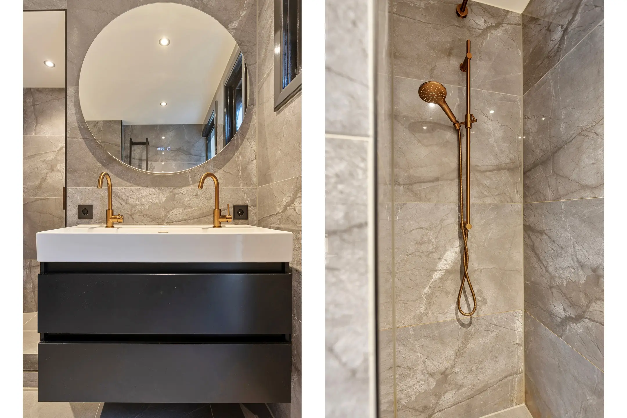 Via de keuken bereikt u het moderne toilet en de luxe badkamer, beide gelegen op de begane grond. De badkamer is in 2025 vernieuwd en straalt hotelgevoel uit dankzij de marmerlook tegels en goudkleurige kranen. Hier geniet u van een ligbad, een ruime inloopdouche en een stijlvol wastafelmeubel.