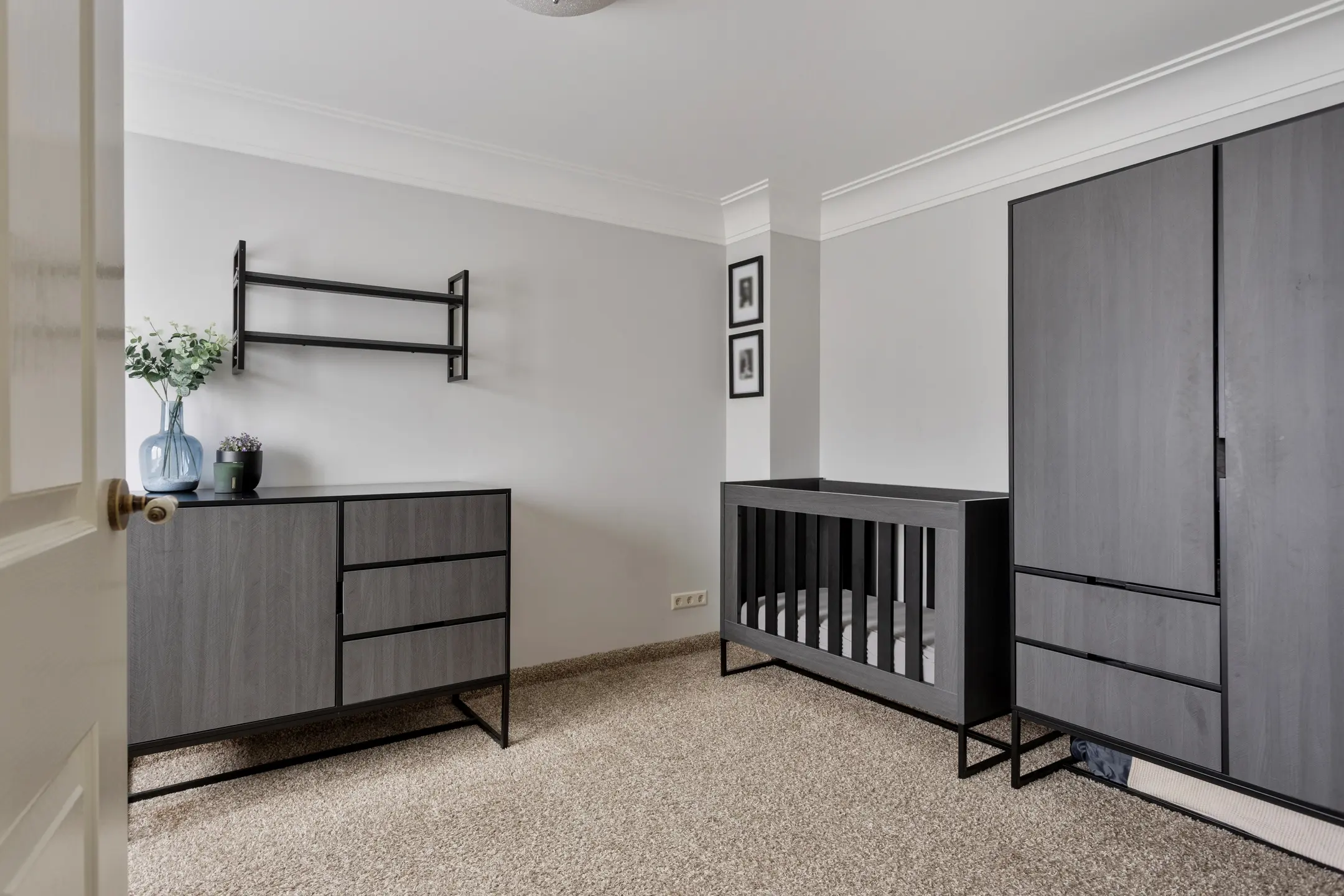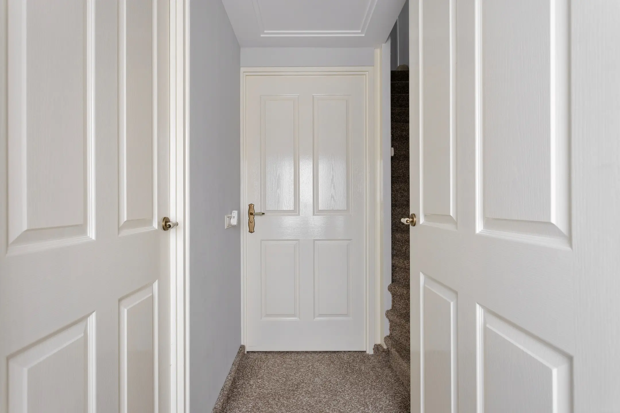 De trap brengt u naar de overloop van de eerste verdieping, voorzien van vloerbedekking die doorloopt over zowel de eerste als tweede verdieping en zorgt voor een warme, rustige uitstraling. Op de overloop bevindt zich een praktische trappenkast voor extra bergruimte.
