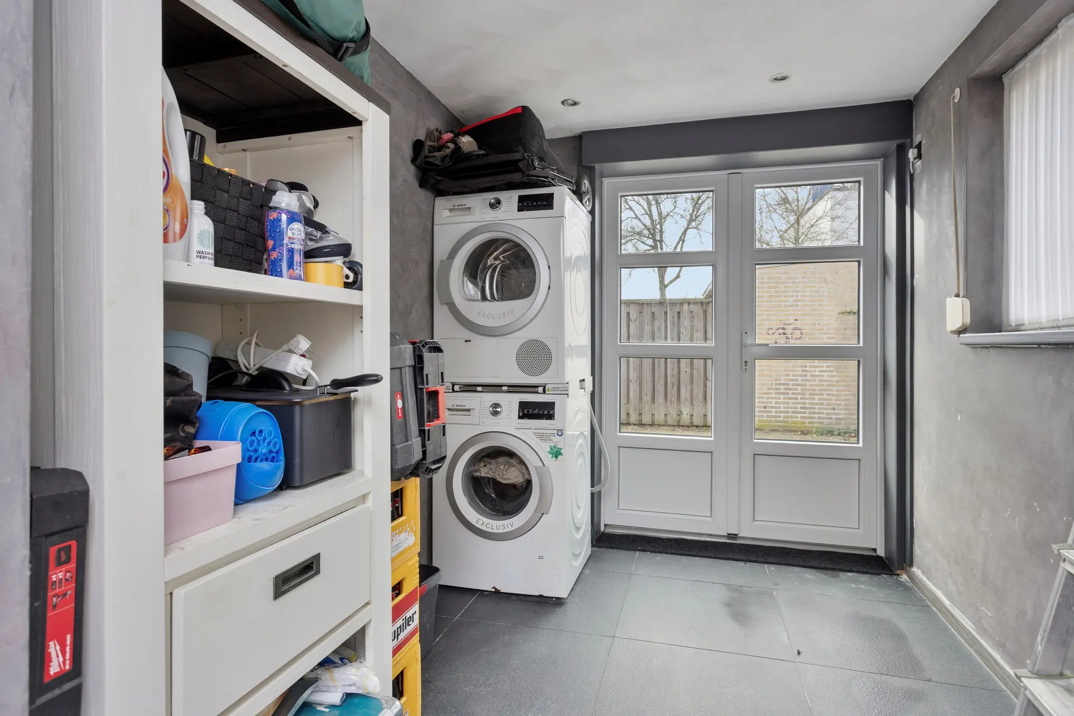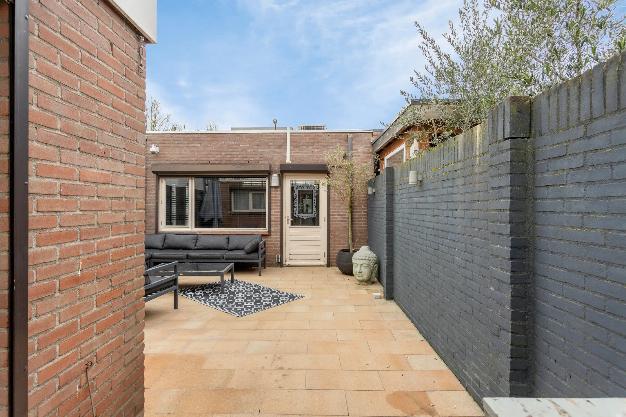 De achtertuin is bijna volledig bestraat en daardoor onderhoudsvriendelijk.