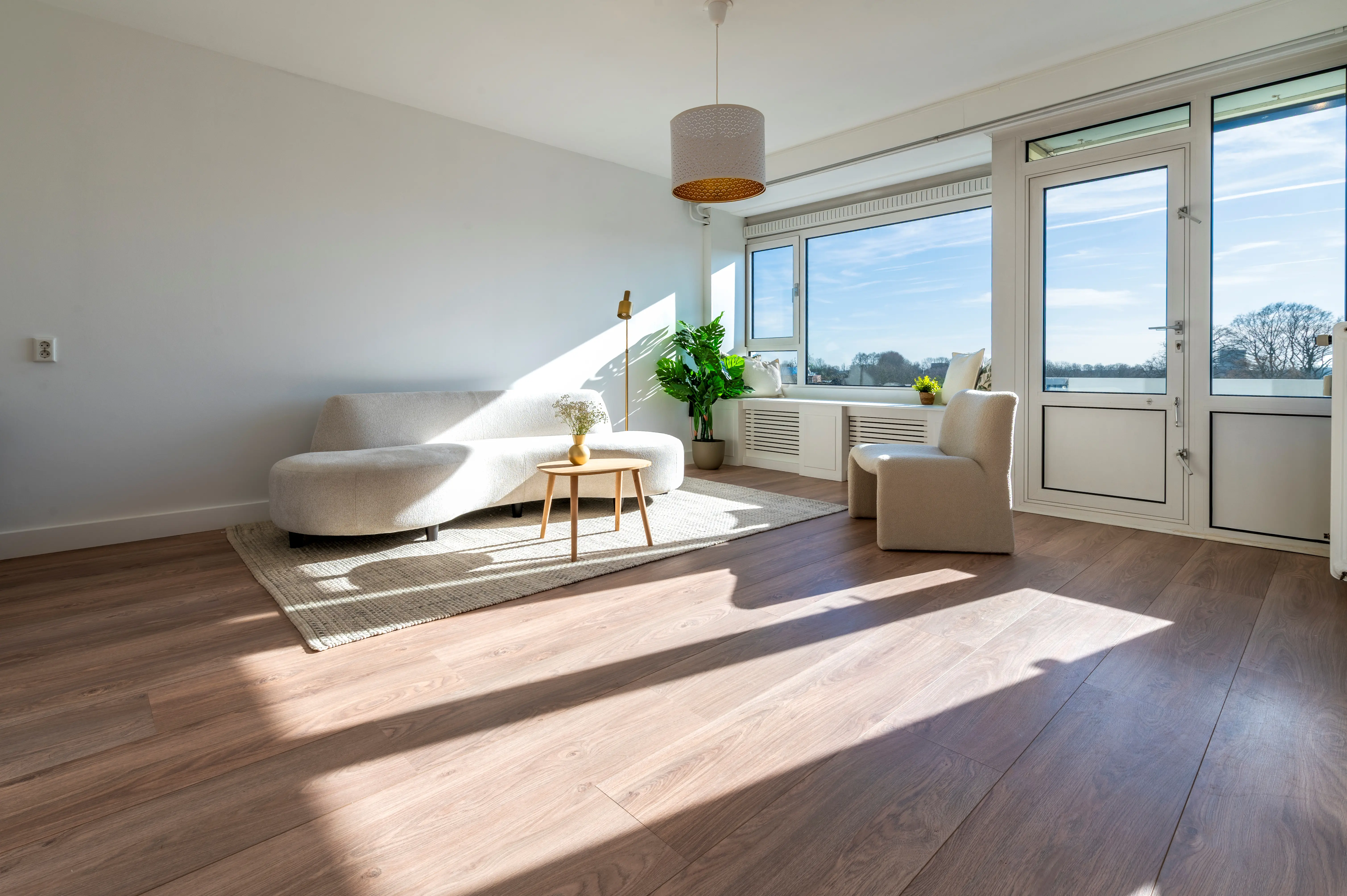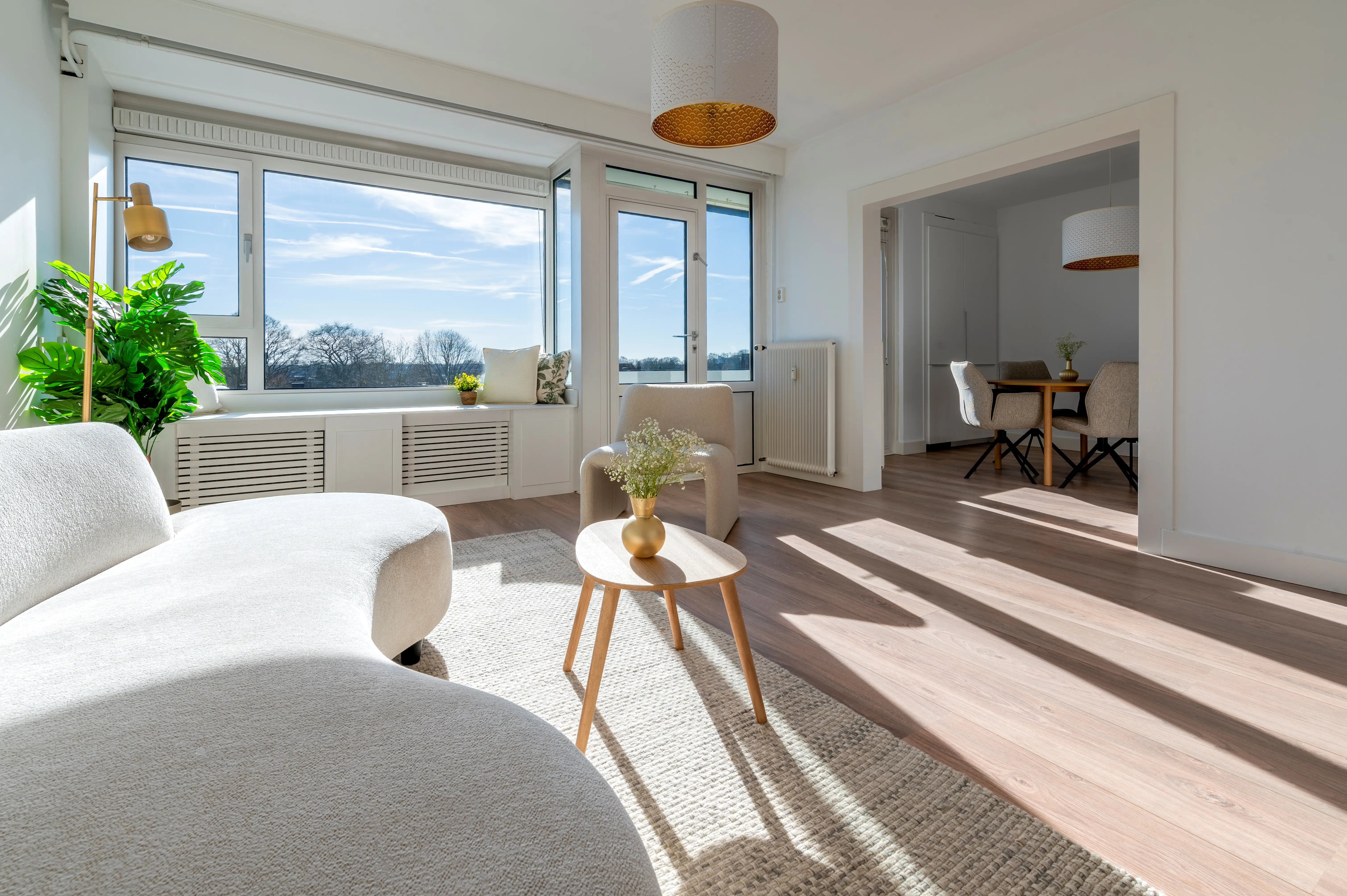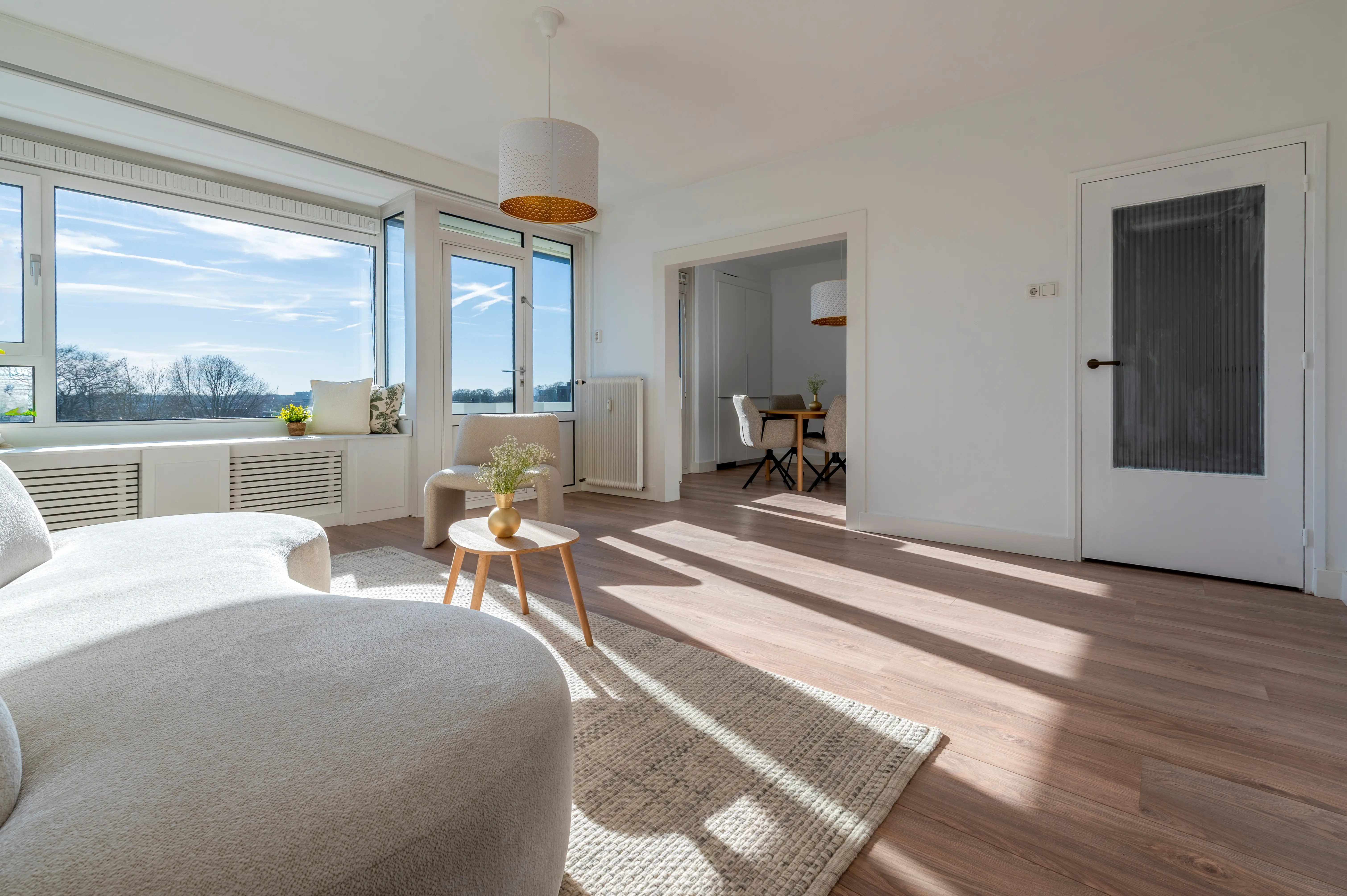 Dankzij de ligging op het zuidwesten baadt het appartement gedurende de dag in de zon, met prachtige lichtinval tot in de avonduren.