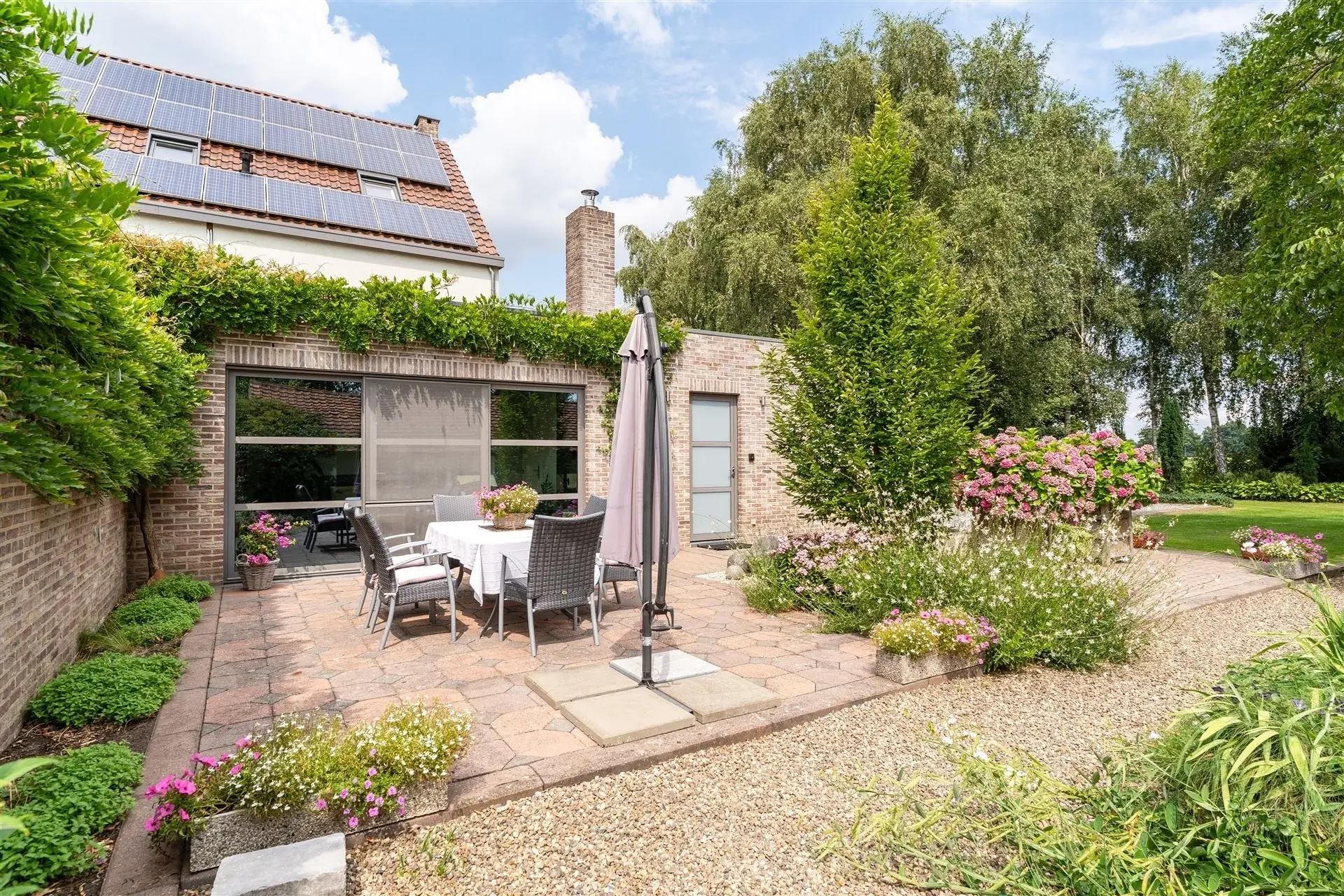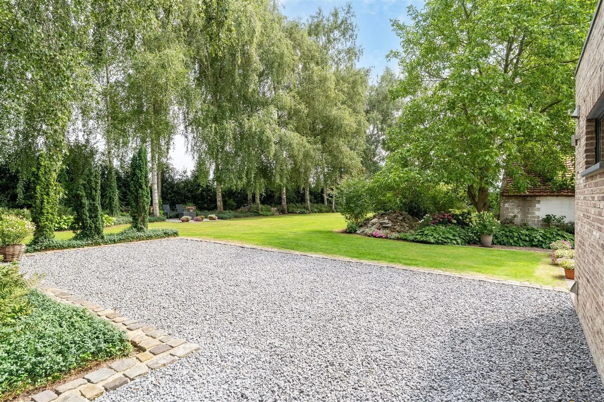 De tuin heeft een oppervlakte van 26a 34ca met een aangelegd terras, werkhuis en opslagplaats.
