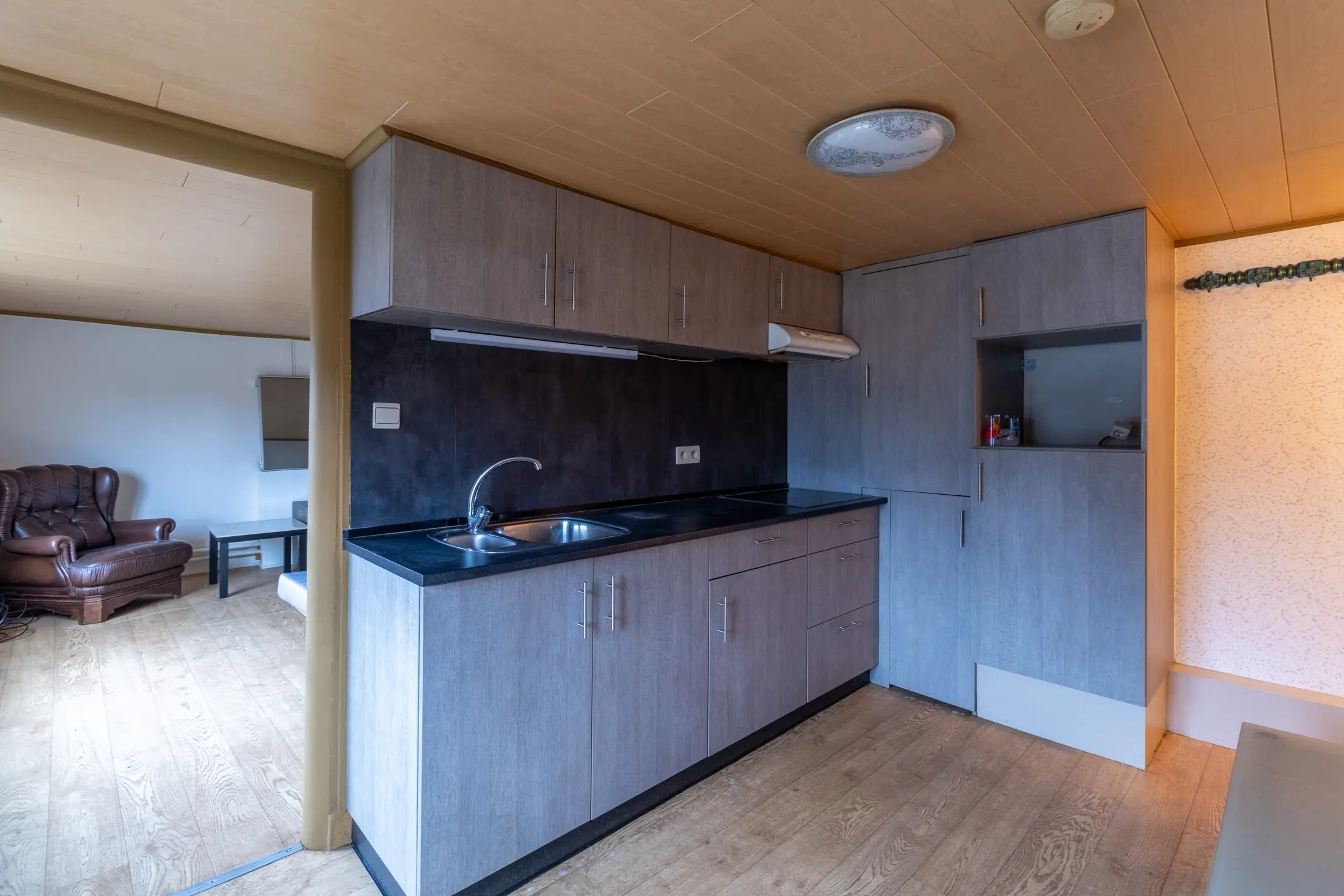 Noch op de eerste verdieping is er een studio, te bereiken via een aparte trap, en voorzien van een keukentje en leefruimte/slaapkamer.
