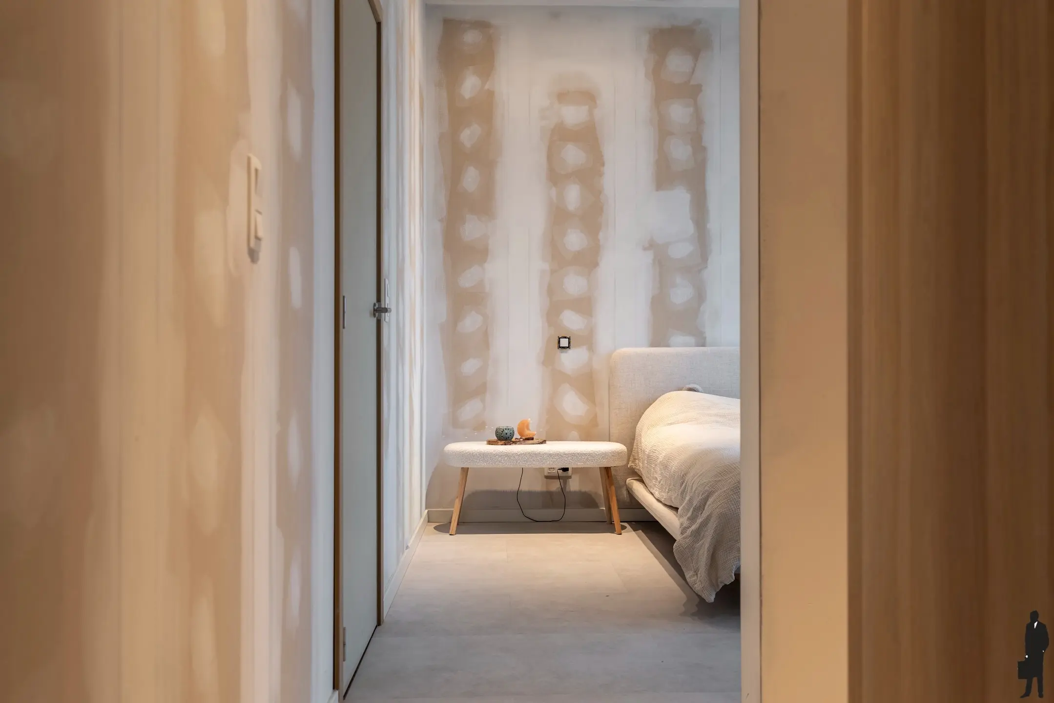 De hal leidt verder tot het privé-gedeelte (woonkamer, keuken, etc.).
