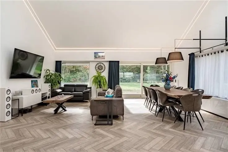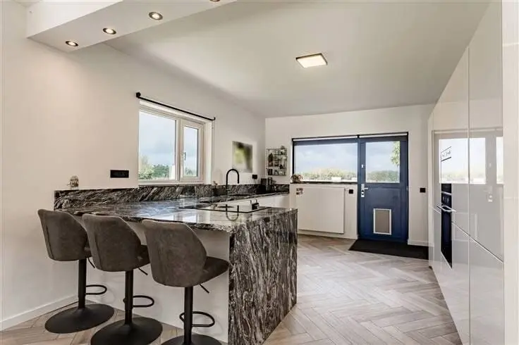 De ruime, lichtrijke leefruimte met open keuken vormt het hart van de woning en biedt een prachtig uitzicht op de groene omgeving.