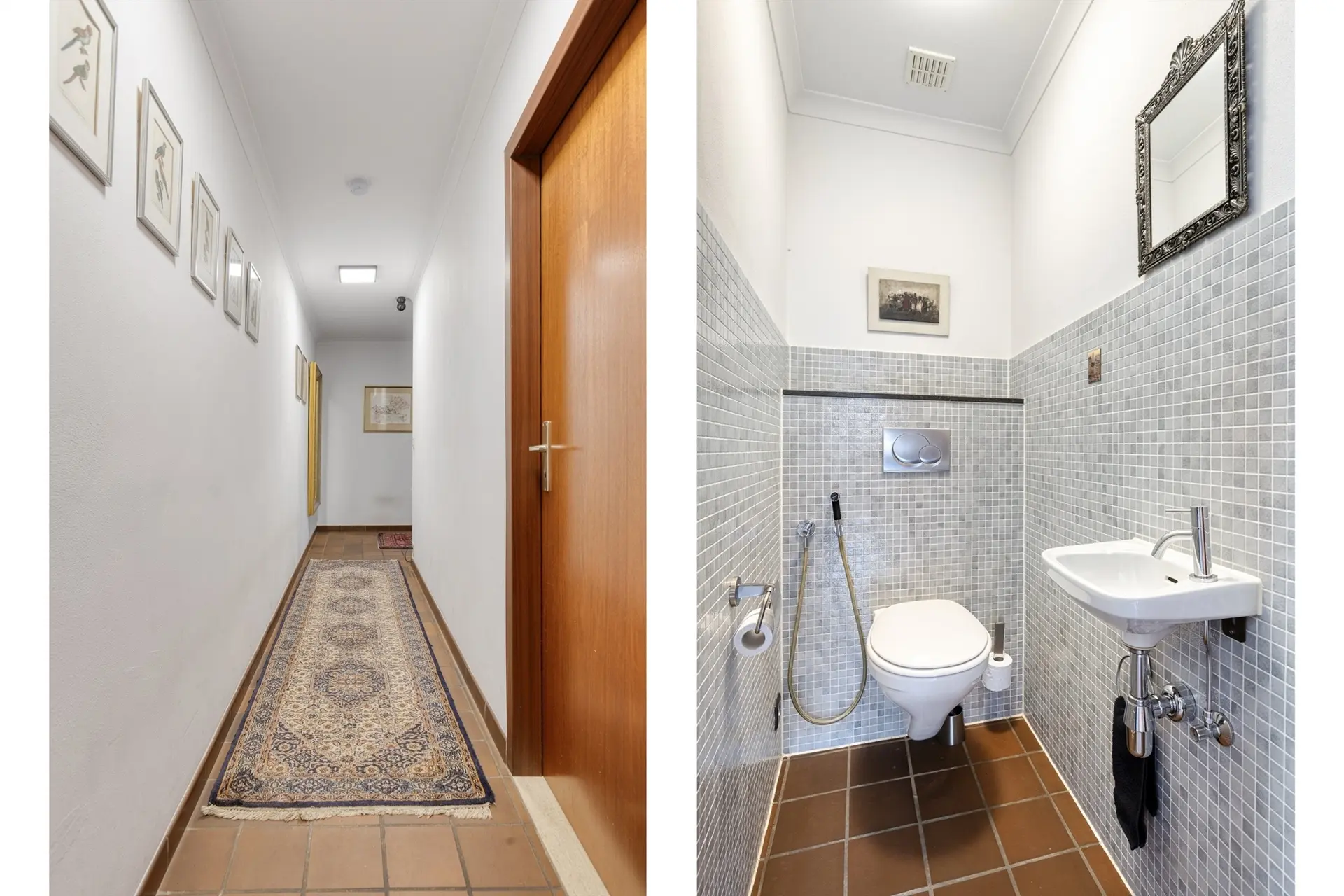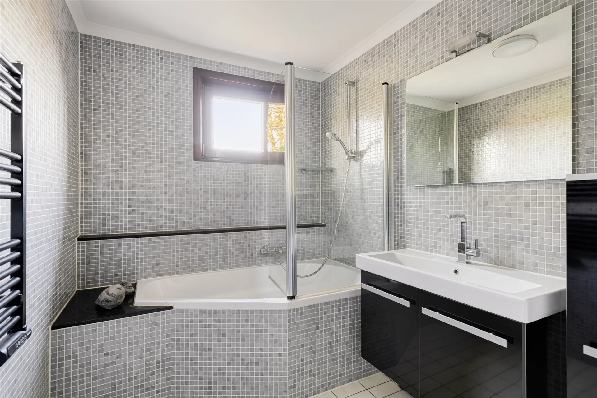 Op het gelijkvloers zijn er 2 slaapkamers, woonkamer, ingerichte keuken, badkamer met bad/douche, hal met gastentoilet, inpandige garage en berging met buitendeur.