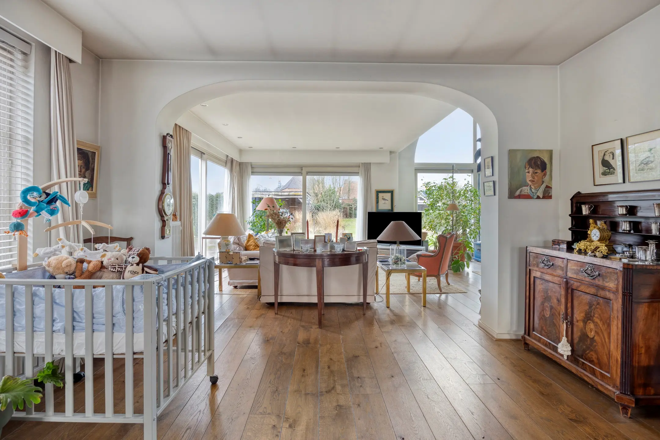 De gezellige leefruimte is afgewerkt met een warme parketvloer en beschikt over een prachtig hoog puntplafond en zeer grote raampartijen, die zorgen voor een fantastisch licht en ruimtelijk gevoel en een prachtig uitzicht op de ruime tuin.