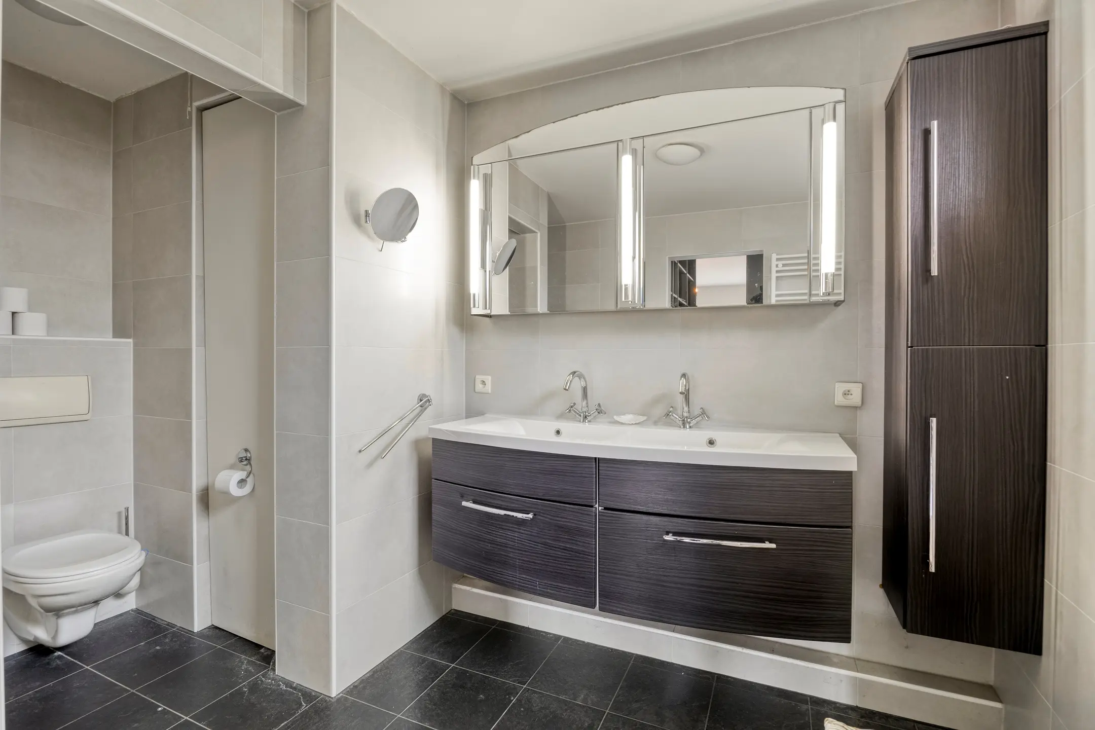 De badkamer op deze verdieping is volledig uitgerust met een ligbad, inloopdouche, toilet en dubbele wastafel.