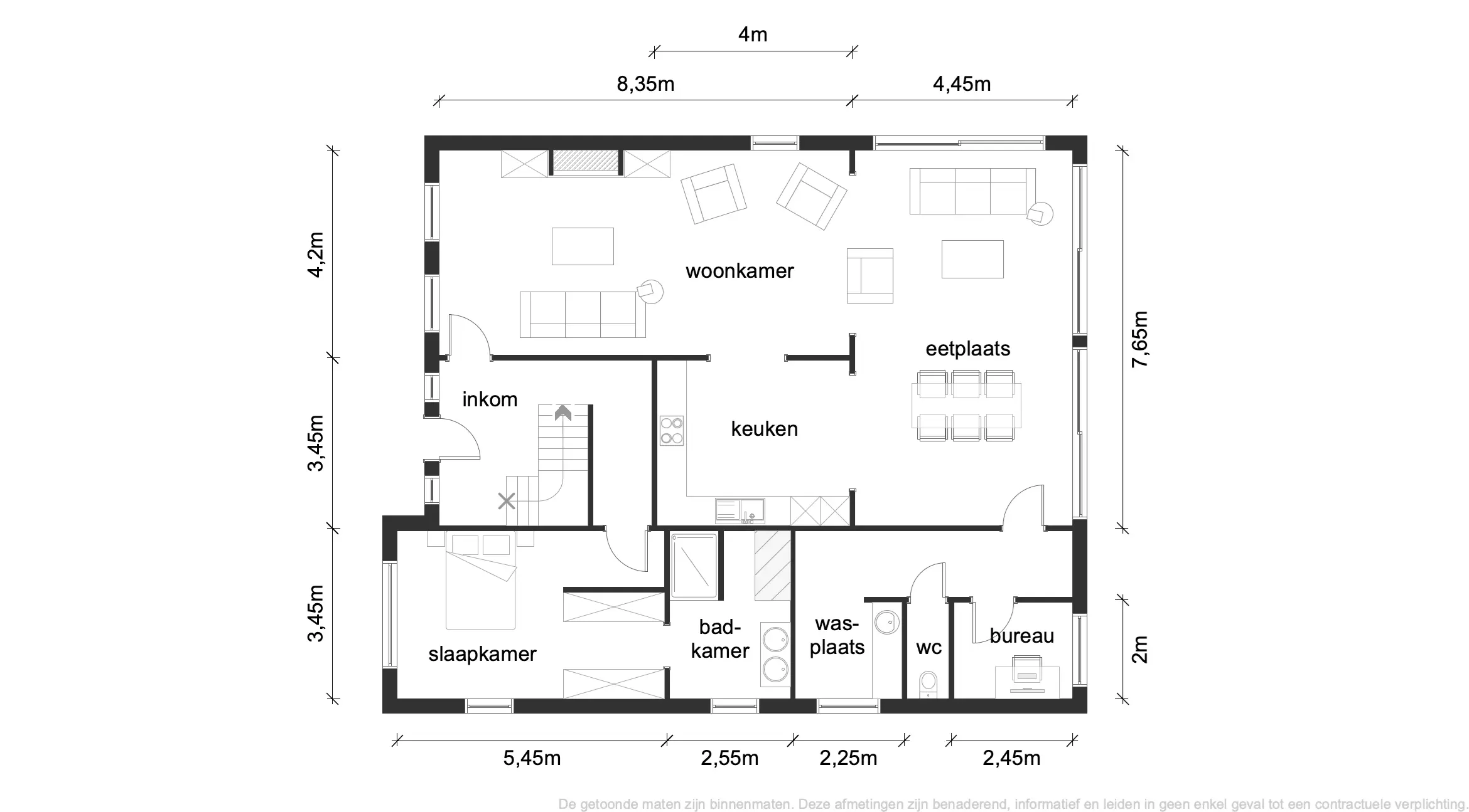 Verder is er een achterinkom met berging, een apart gastentoilet met wastafel en een praktische wasruimte met inbouwkasten en aansluitingen voor was- en droogmachine.