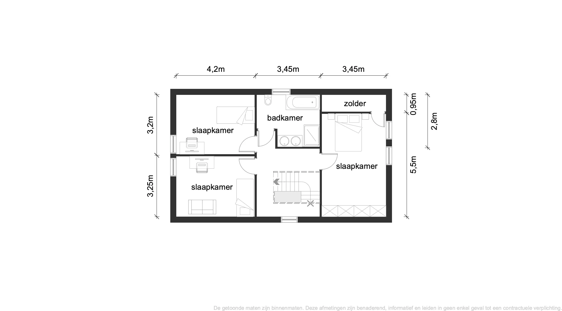 Hier bevinden zich 3 ruime slaapkamers(voorzien van inbouwkasten) en een aparte badkamer.