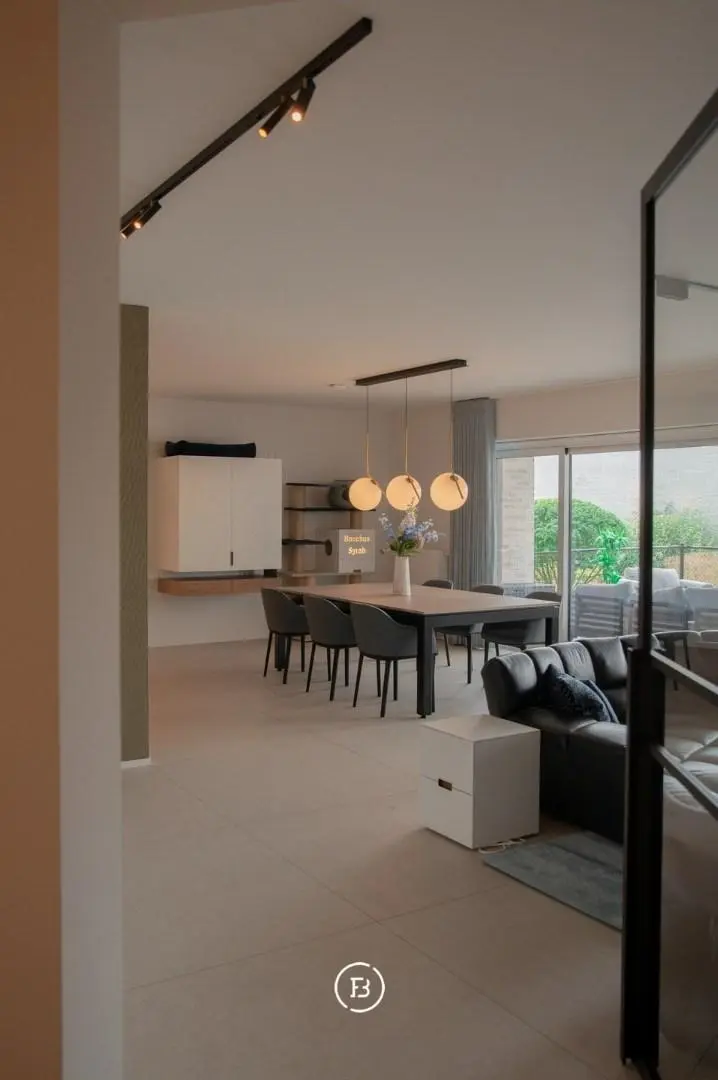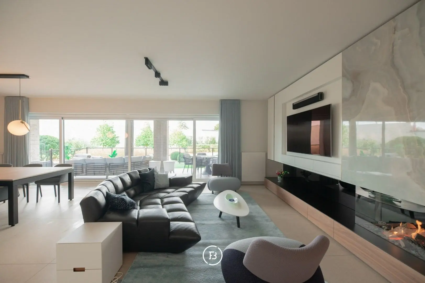 De lichtrijke leefruimte is voorzien van maatkasten, discreet geïntegreerde technieken en een gezellige gashaard.