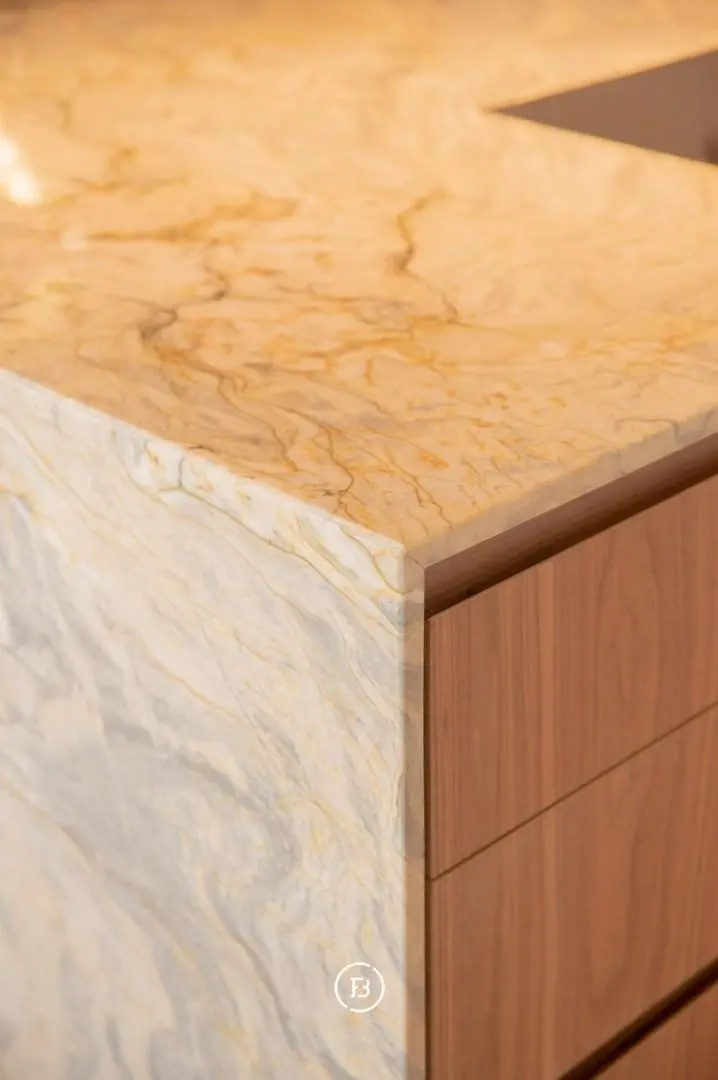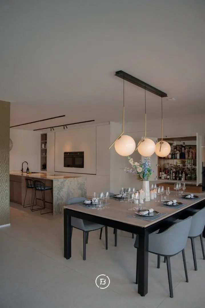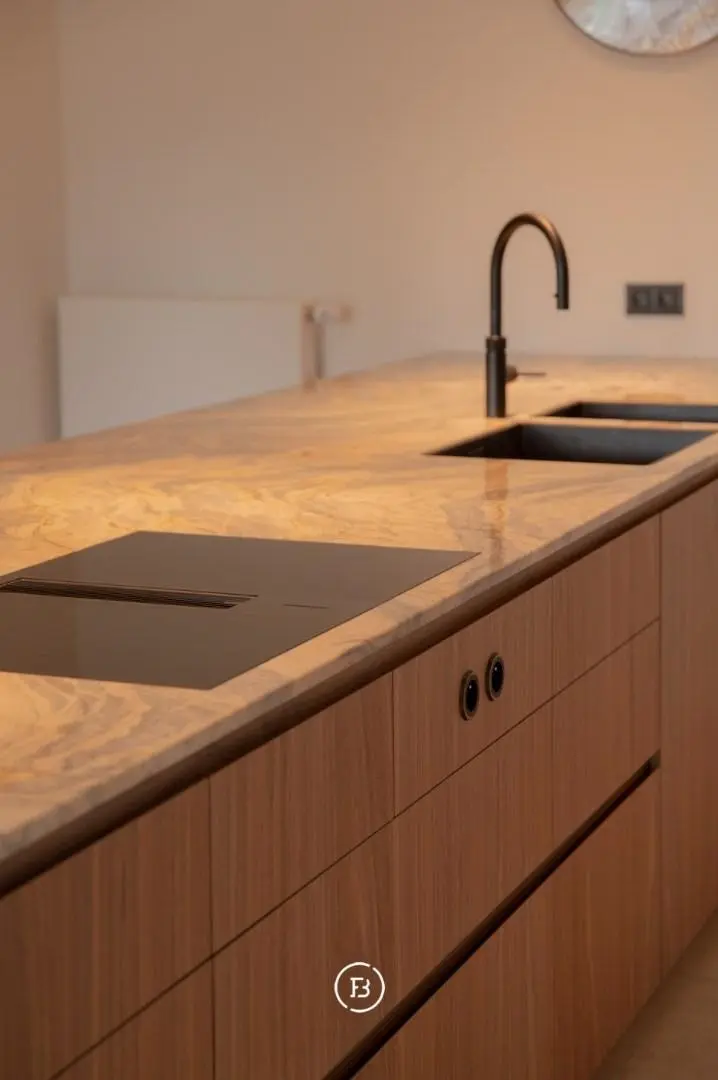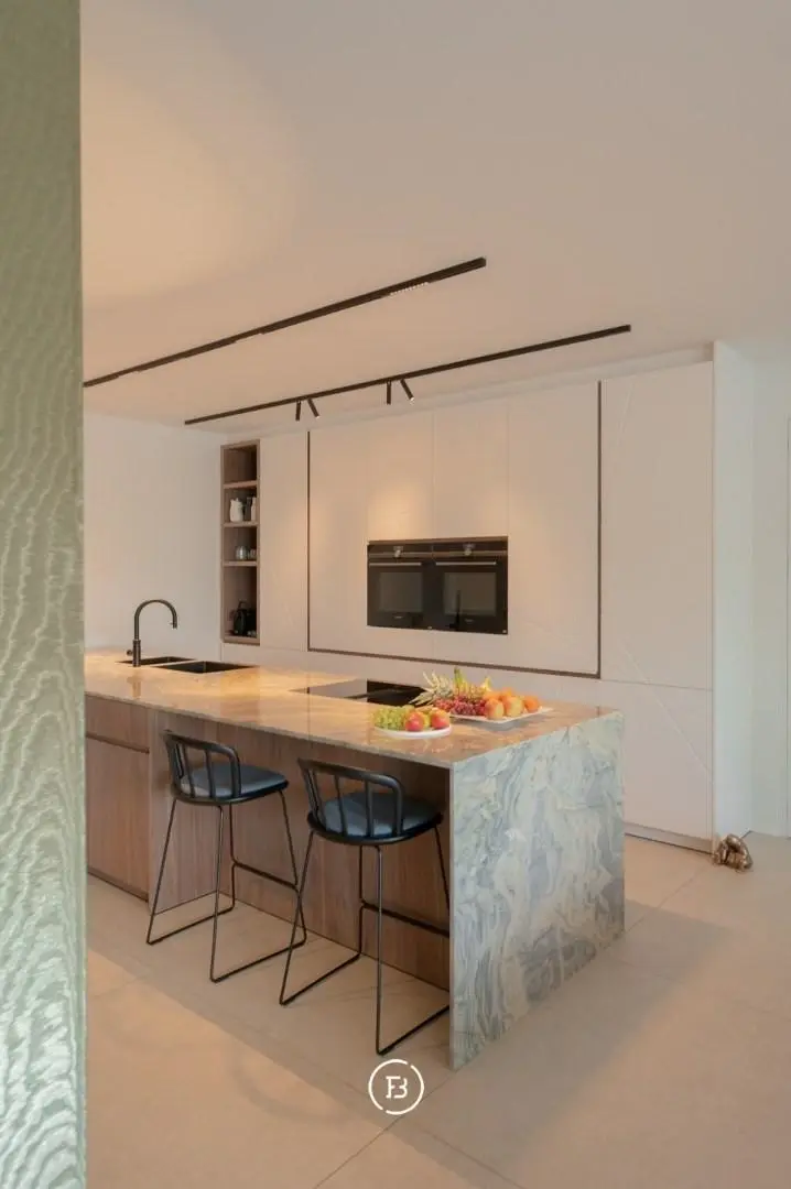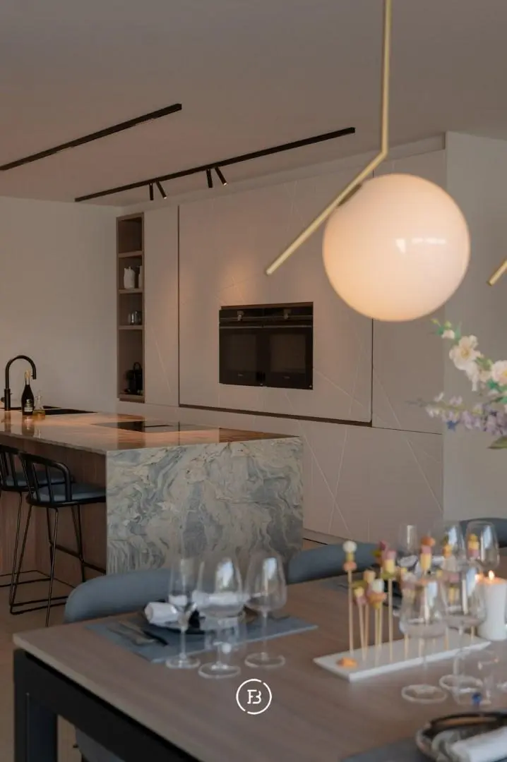 In het hart van het appartement is er een kookeiland voorzien van een prachtige kwartsiet natuursteen.