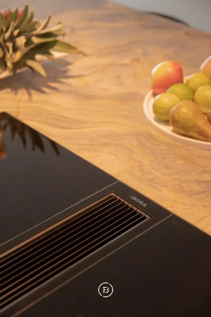De uitrusting voldoet aan de hoogste verwachtingen: BORA kookplaat, Siemens oven(-steamer), Quooker-kraan, Liebherr koelkast met ijsblokjesfunctie en een ingebouwde wijnfrigo.