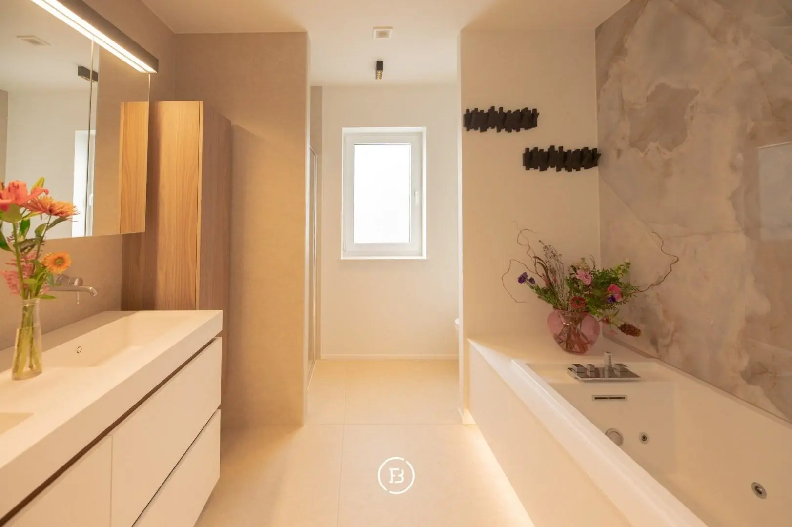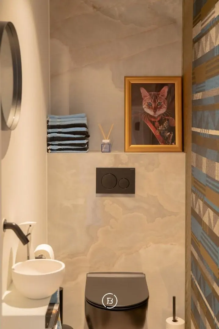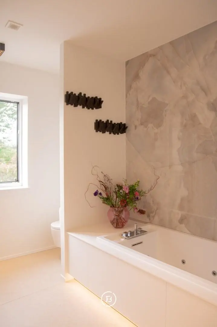 De stijl is volledig doorgetrokken in elke ruimte met een harmonieuze compositie van noten hout, lakwerk en natuursteen.