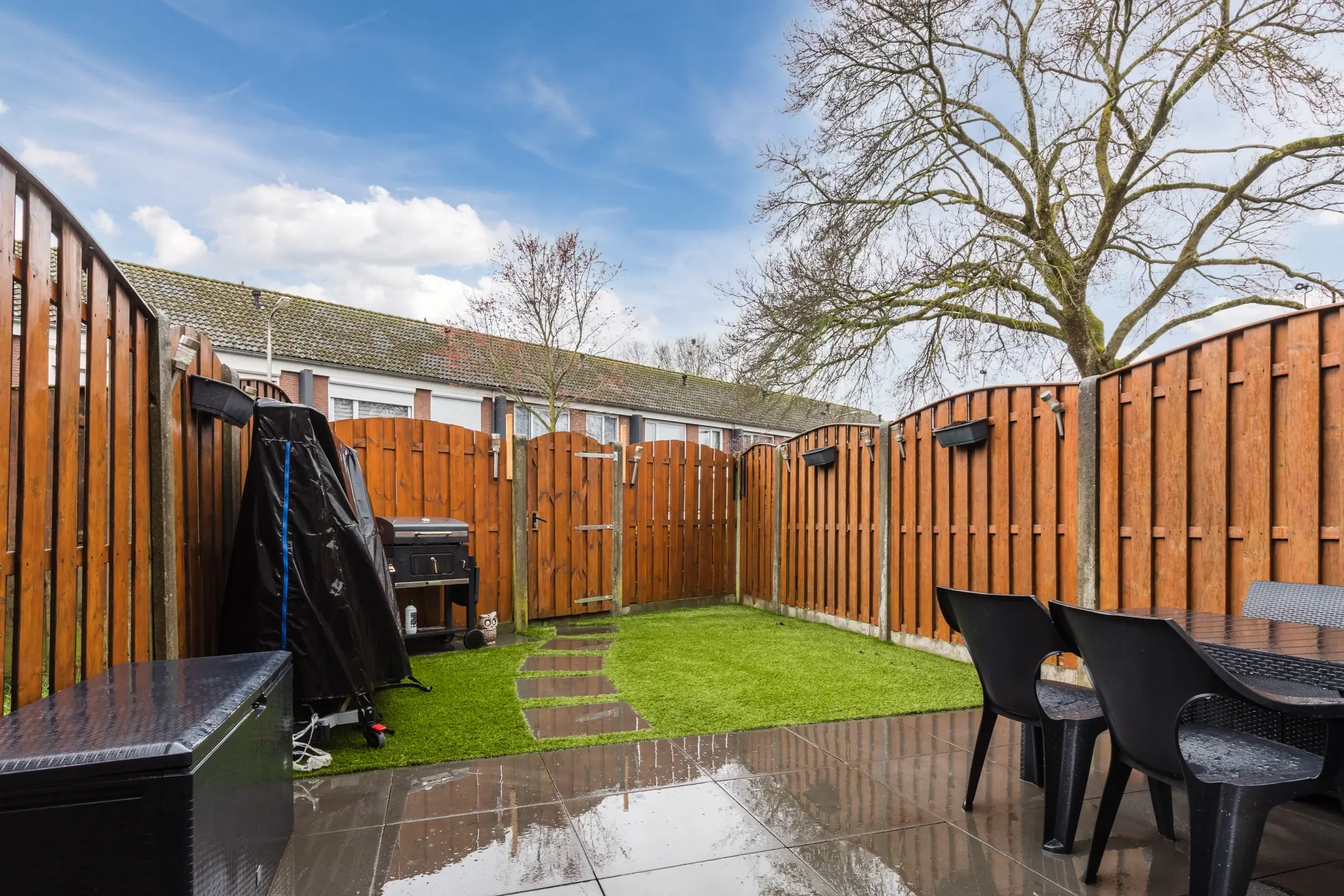 De achtertuin biedt veel privacy en diverse mogelijkheden voor inrichting en gebruik.