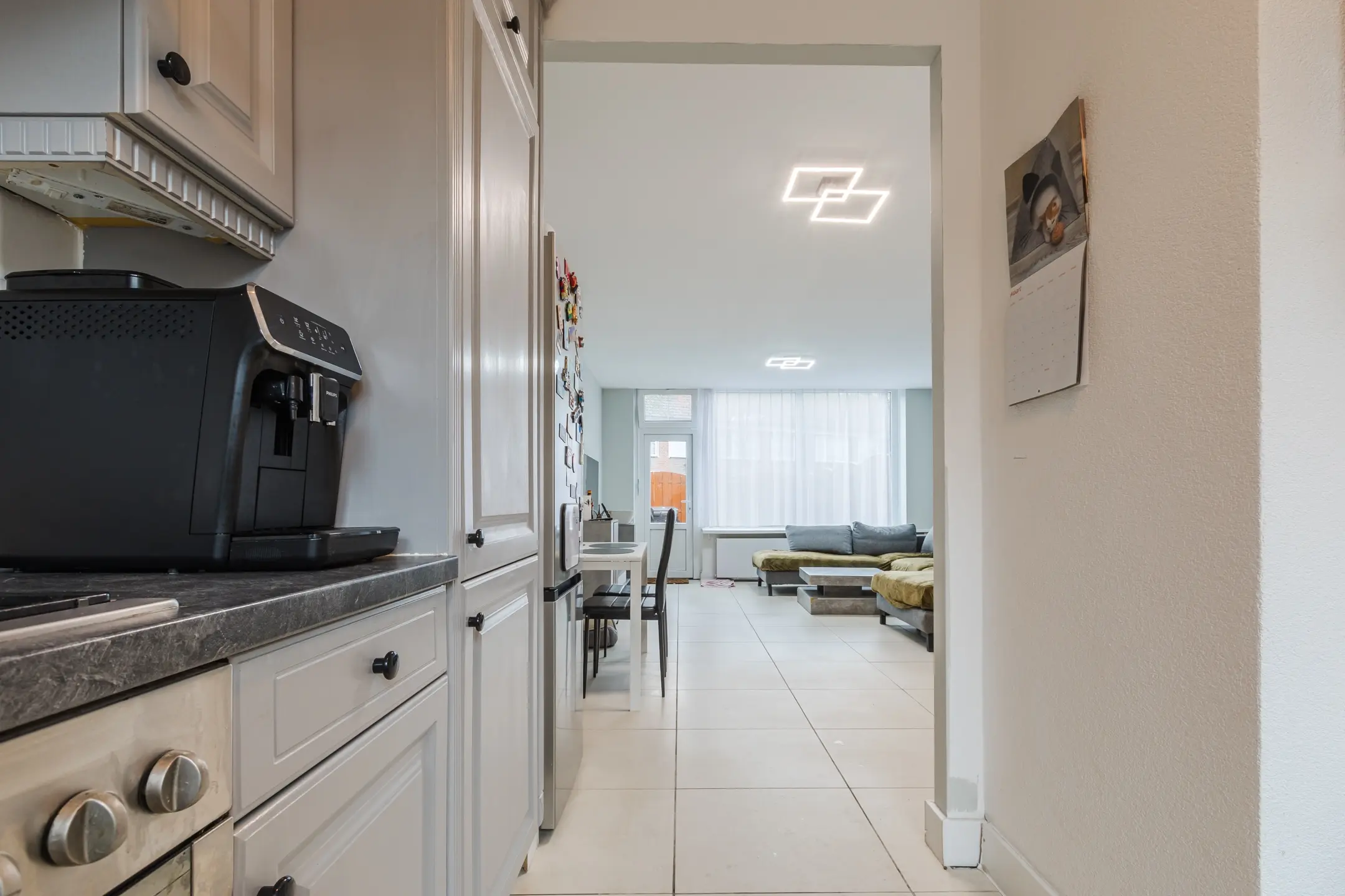 Entree, hal met toilet, lichte woonkamer met uitzicht op de tuin en toegang tot de keuken.