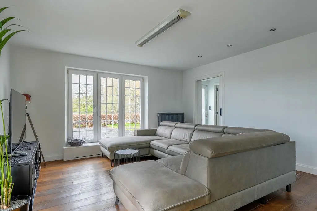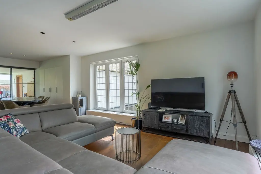 De lichtrijke woonkamer is afgewerkt met een parketvloer en voorzien van inbouwkasten.