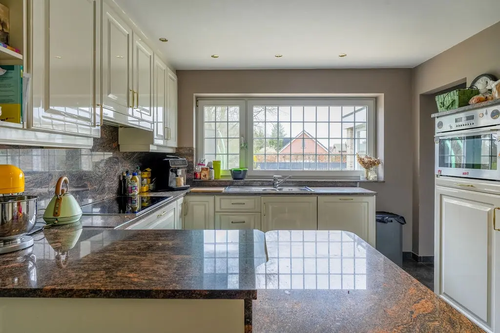 De keuken is functioneel ingericht en uitgerust met een Miele-inductiekookplaat, een ATAG combi-oven en een vaatwasser.