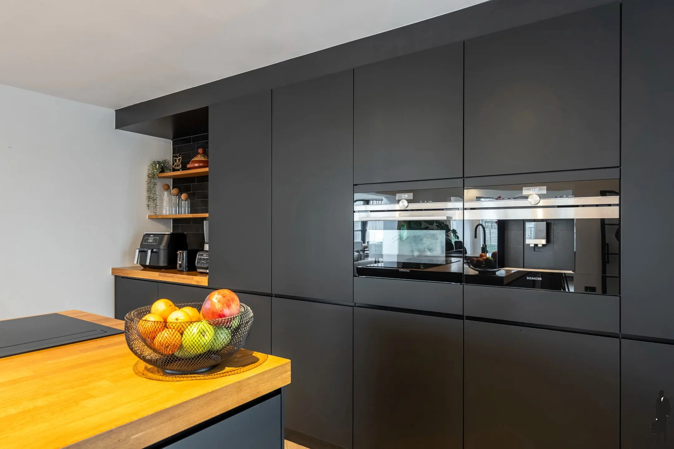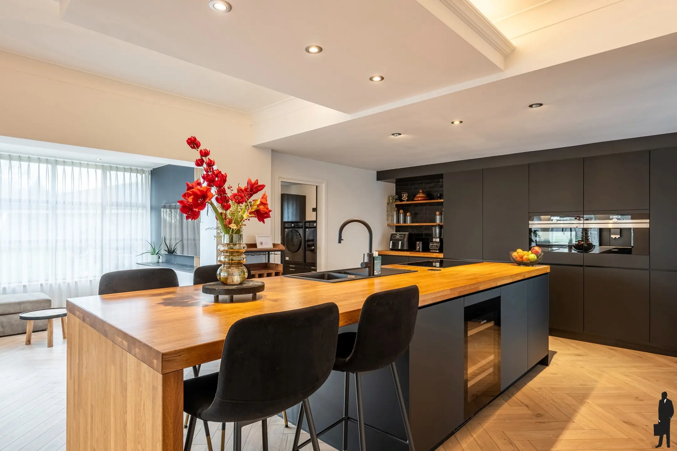 De open leefkeuken is uitgerust met hoge kwaliteit inbouwapparatuur, zoals een combi-oven (Siemens), een ingebouwde koffiemachine (Siemens), een vaatwasser (Neff), een wijnkoeler (Liebherr), een Quooker kraan, twee koelkasten en twee diepvriezers (Bosch) en een inductiekookplaat met afzuiging.