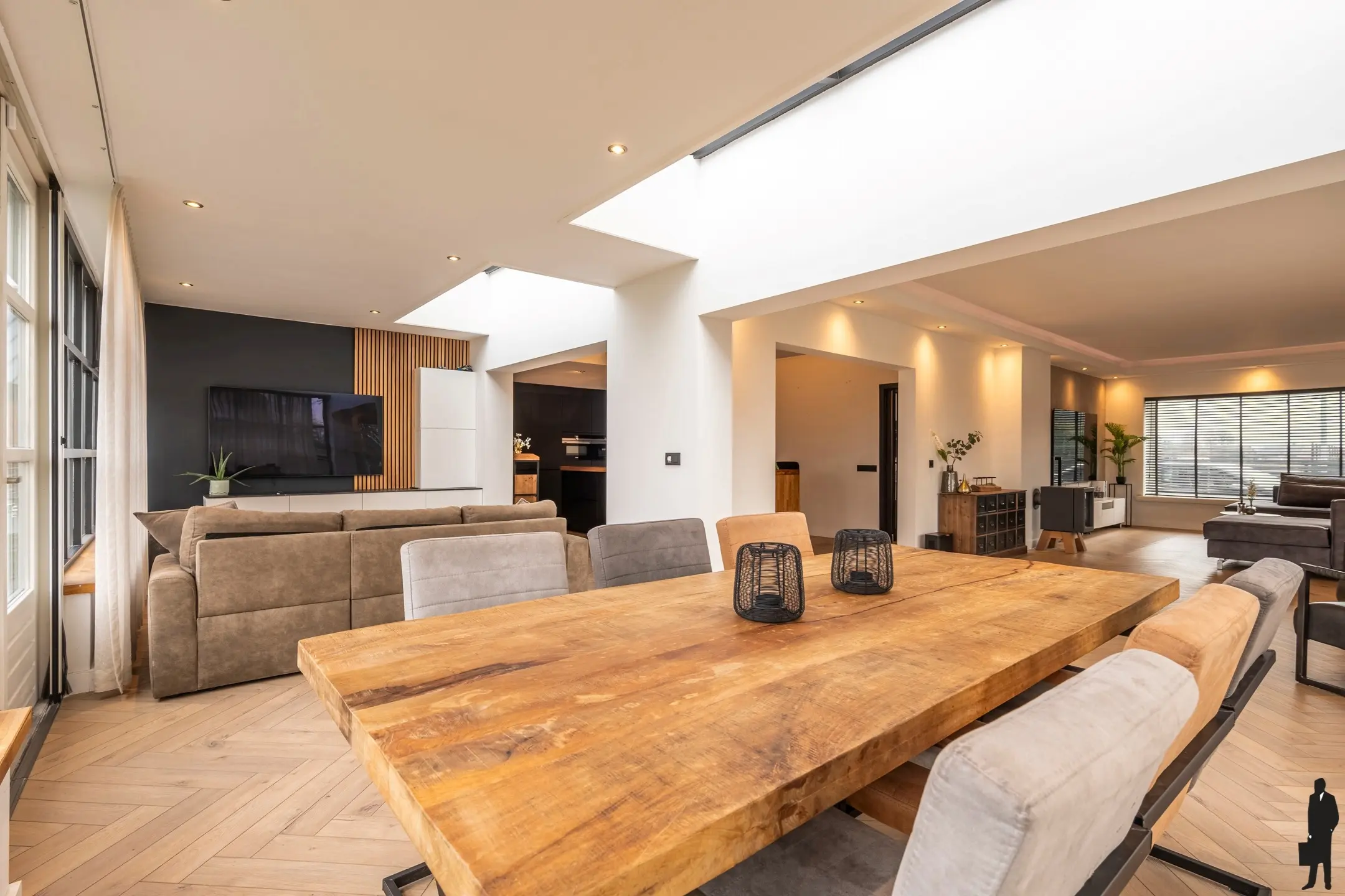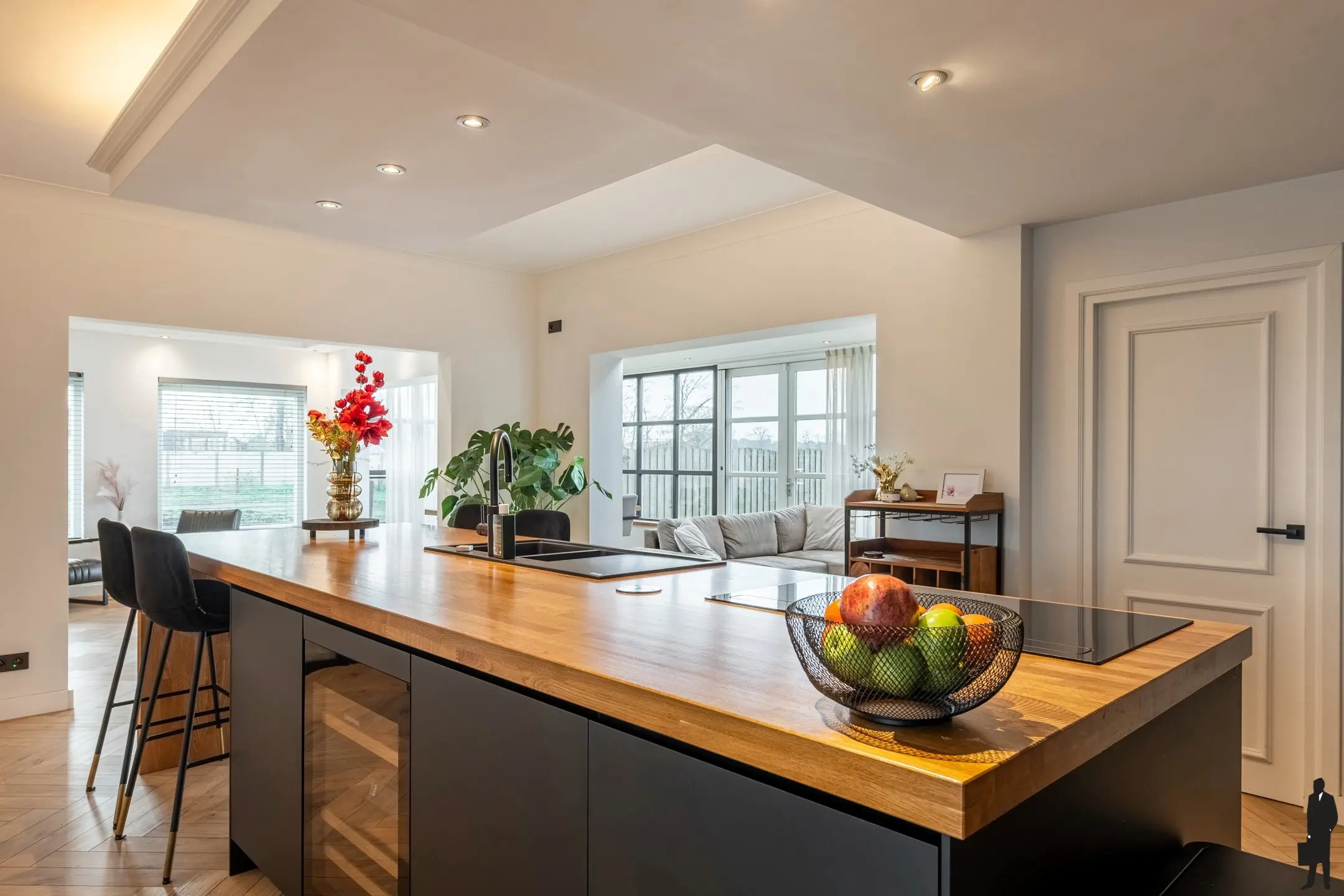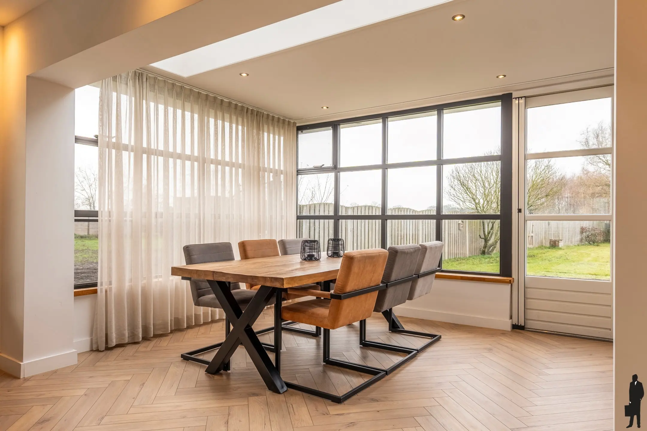 De grote raampartijen creëren een gevoel van ruimte en bieden een schitterend uitzicht over de tuin.