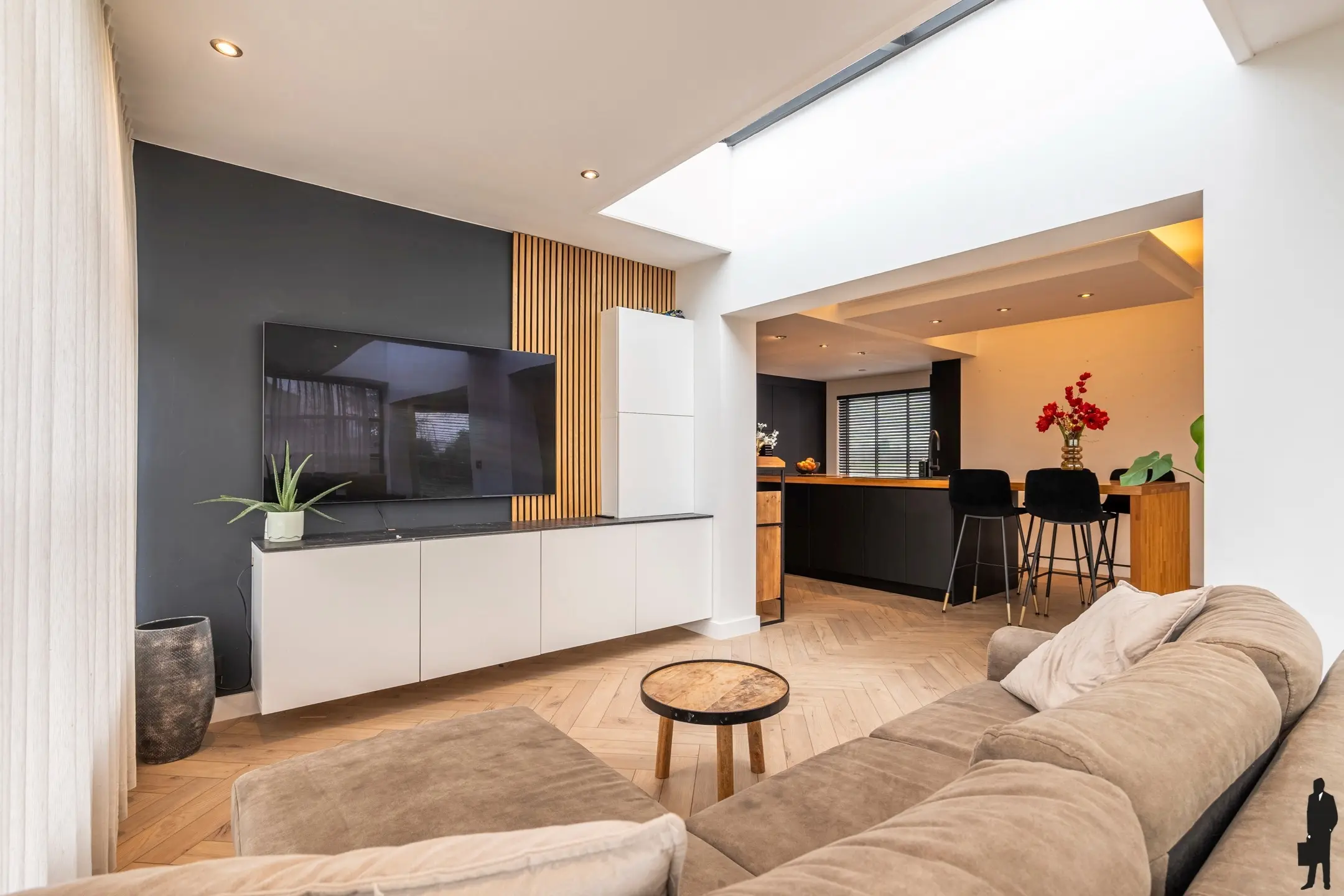 Gelijkvloerse verdieping: De woonkamer is ruim en geniet van veel natuurlijk daglicht.