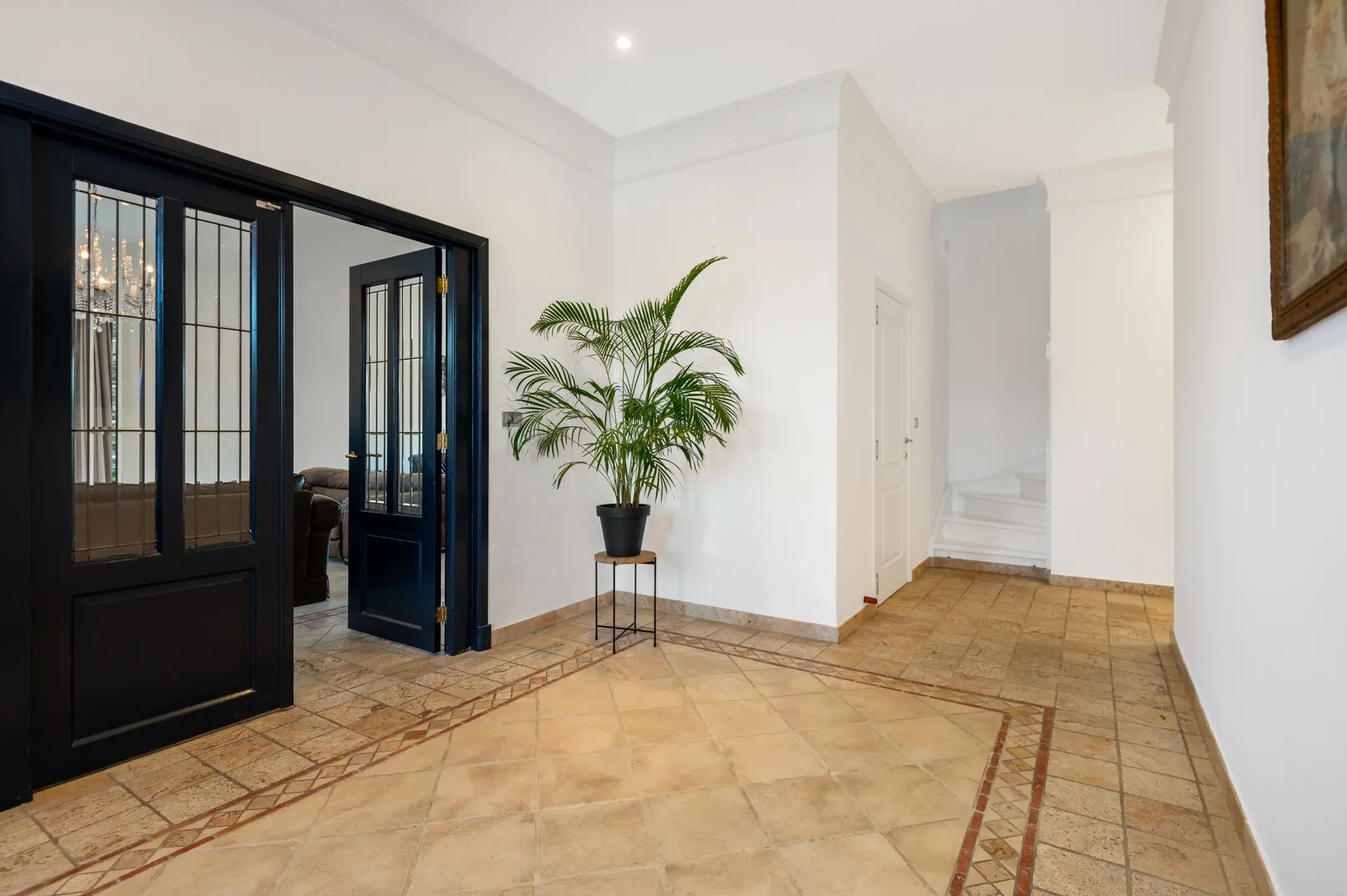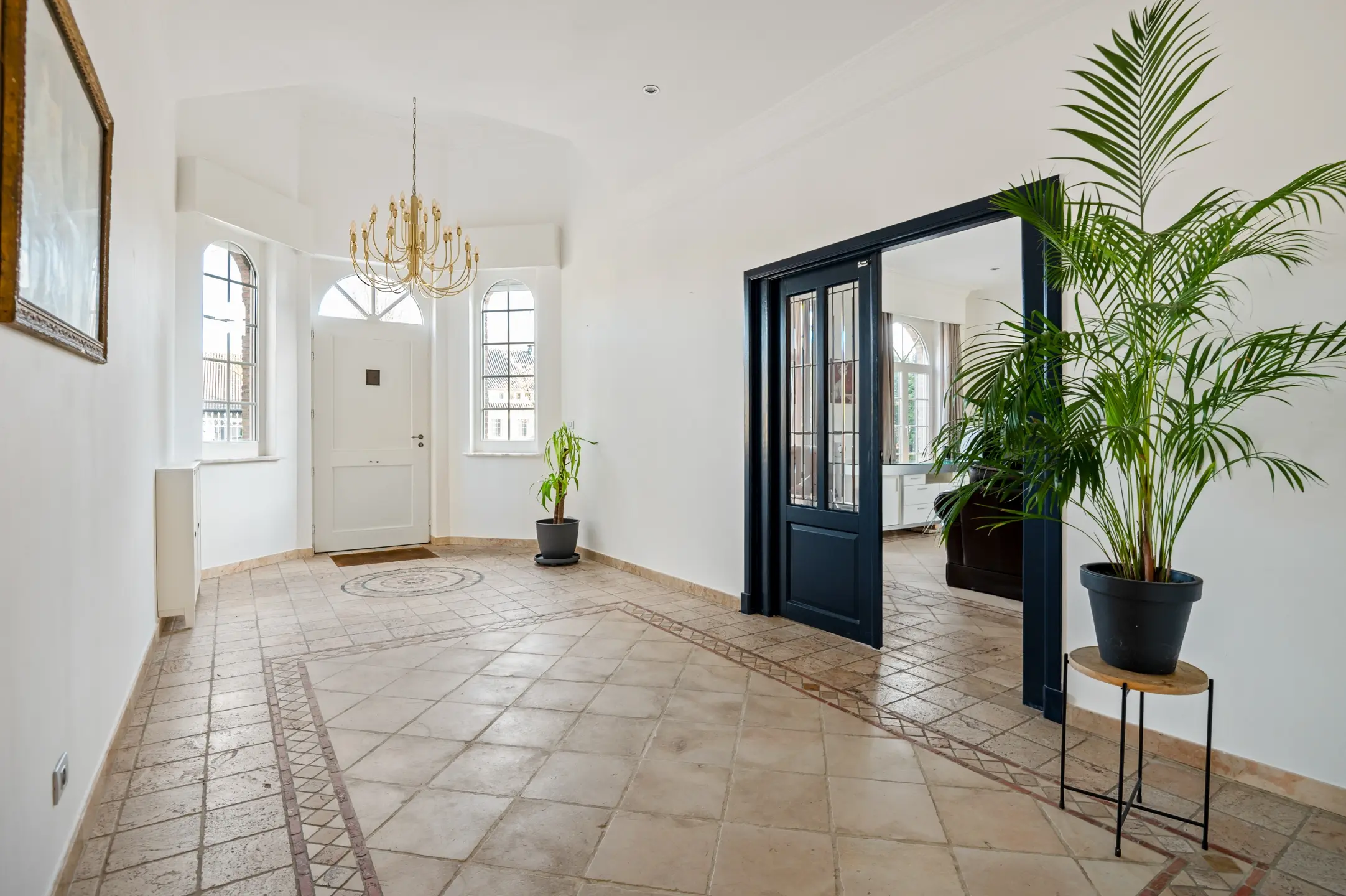 We betreden de woning via een royale inkomhal met apart gastentoilet, die naadloos overgaat in de leefruimte. De volledige gelijkvloerse verdieping geniet van een indrukwekkende plafondhoogte van 3 meter, wat het gevoel van ruimte en luxe versterkt.