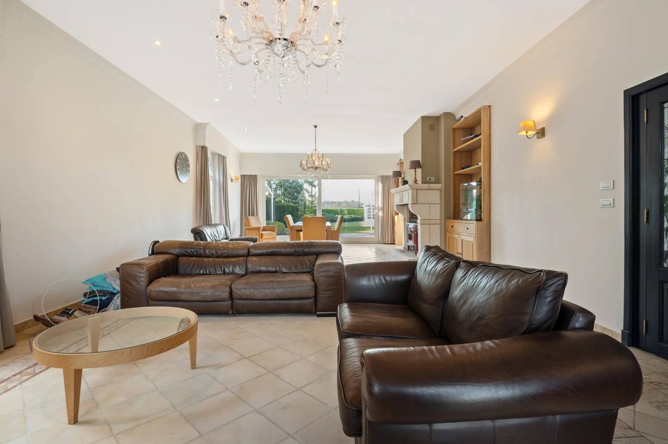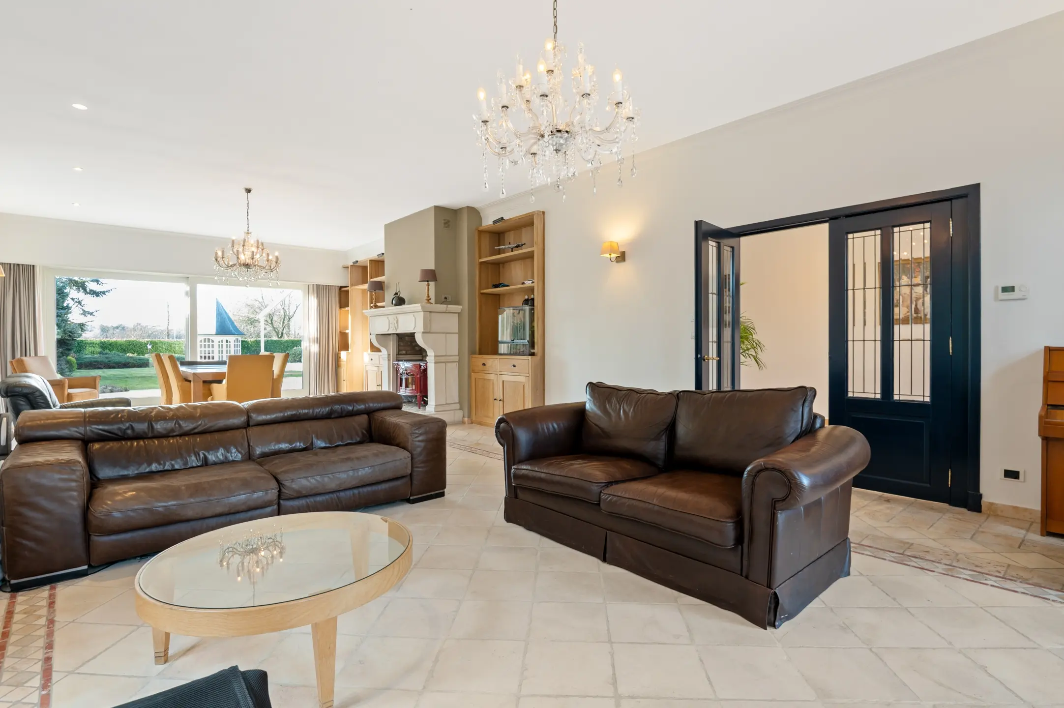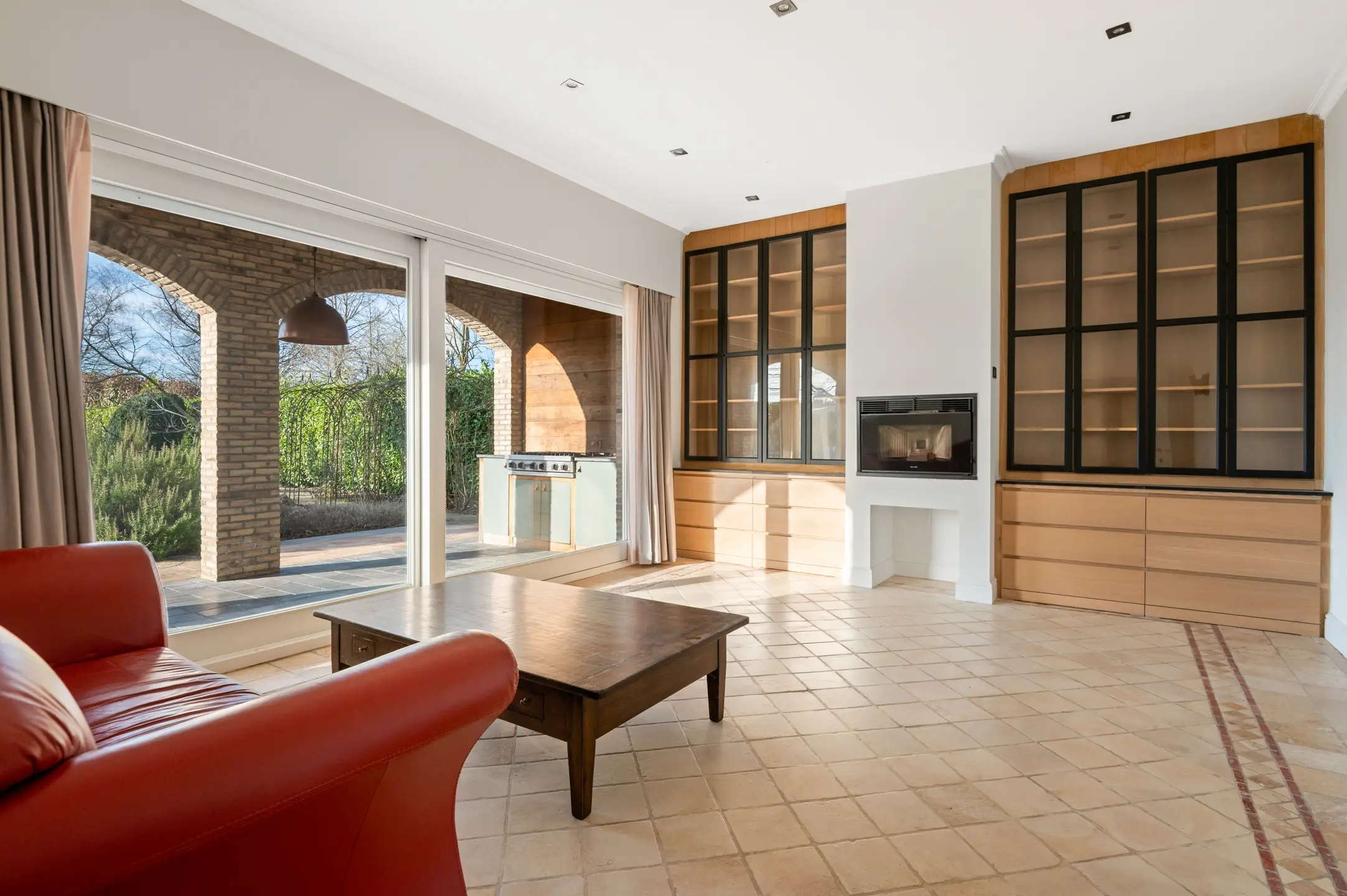 De lichtrijke leefruimte combineert een stijlvolle zithoek met een ruime eethoek en wordt dankzij de grote glaspartijen overspoeld met natuurlijk licht. Een elegante houtkachel voegt warmte en sfeer toe, waardoor deze ruimte het hart van de woning vormt.