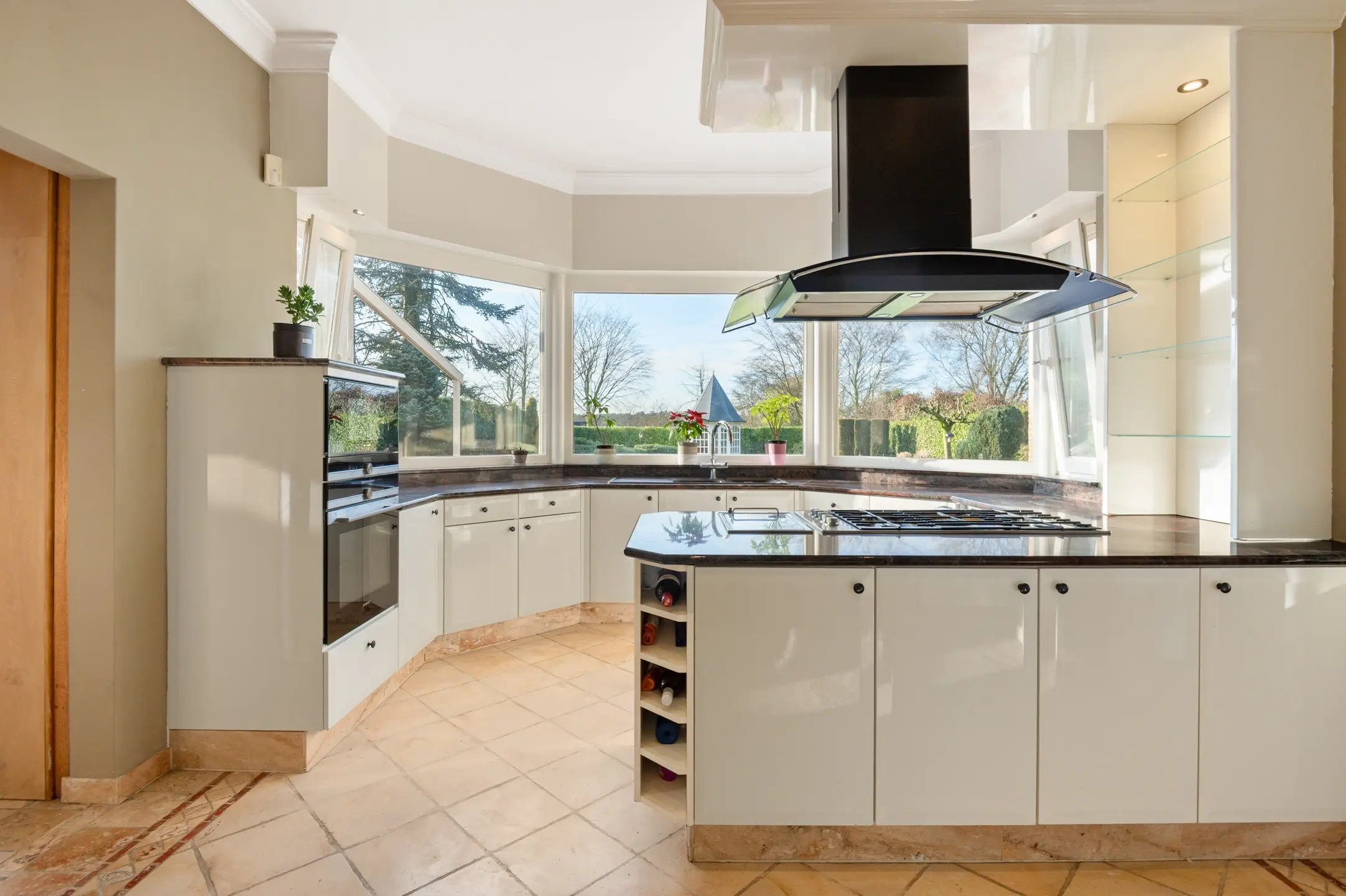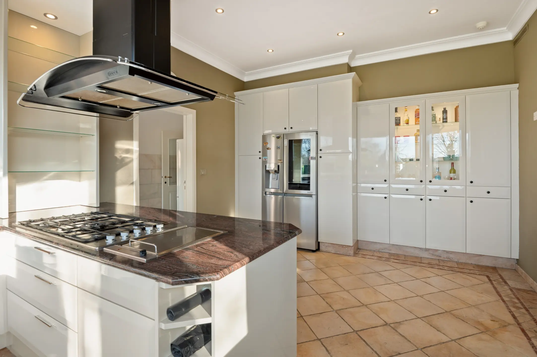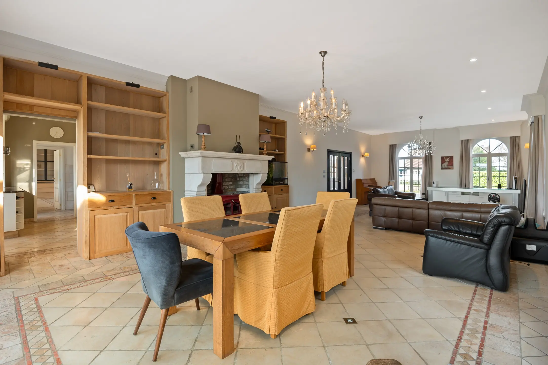 Aansluitend bevindt zich de riante keuken met tuinzicht, uitgerust met hoogwaardige inbouwkasten en moderne toestellen (2022): een gasvuur, koelkast, Quooker-kraan, oven, microgolfoven, vaatwasser en zelfs een ingebouwde frietketel.