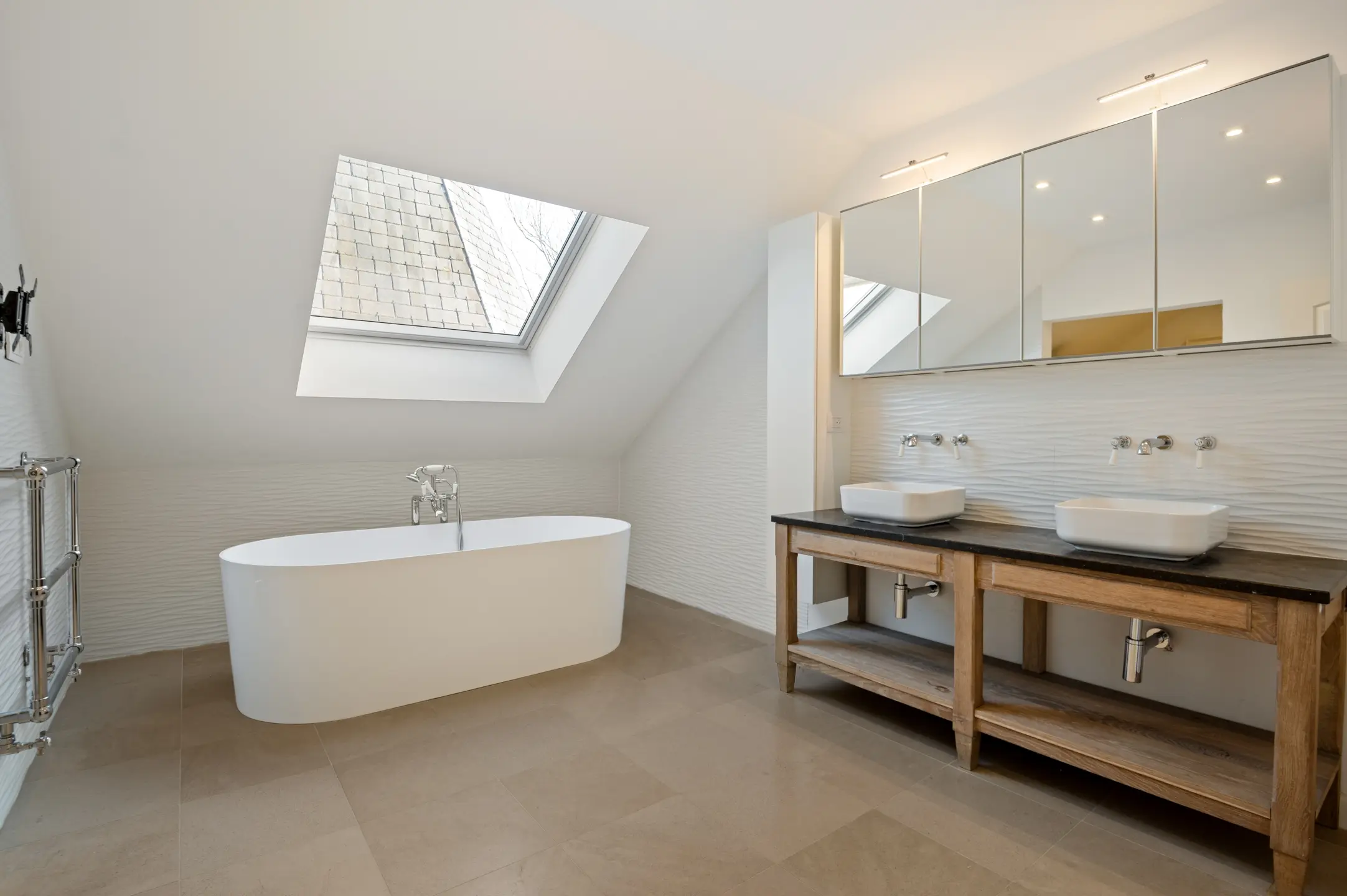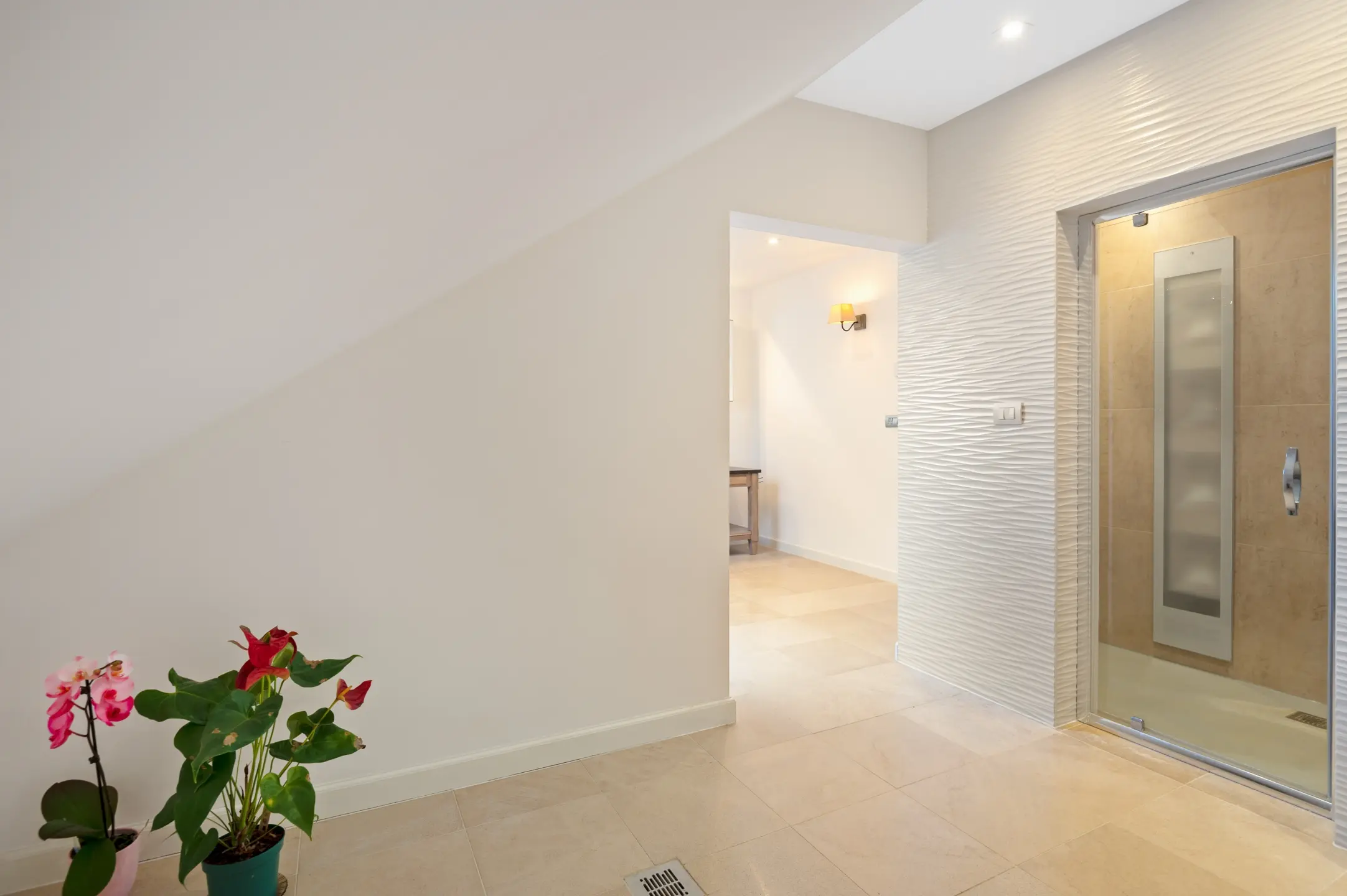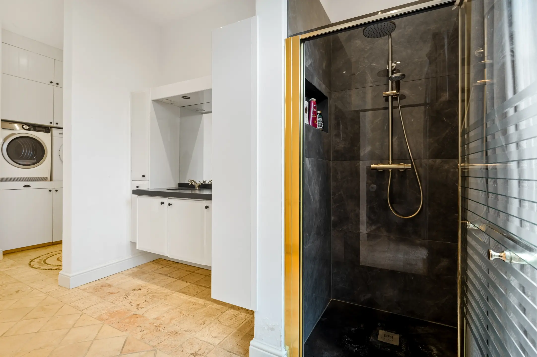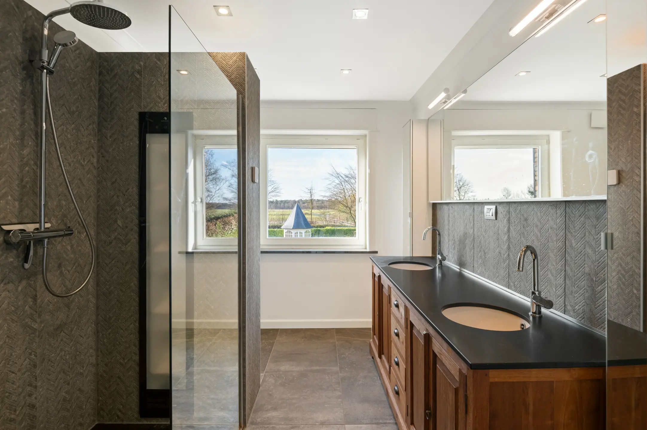 De badkamer straalt pure luxe uit met een stijlvolle natuurstenen vloer en aangename vloerverwarming. Ze is uitgerust met dubbele inloopdouche met regendouche en sunshower, een elegant ligbad, een dubbele wastafel, een geïntegreerde televisieaansluiting en een wasluik naar de wasplaats. Bovendien zijn de aansluitingen voor een sauna en stoomcabine reeds voorzien, waardoor deze ruimte een exclusieve wellnessbeleving biedt.