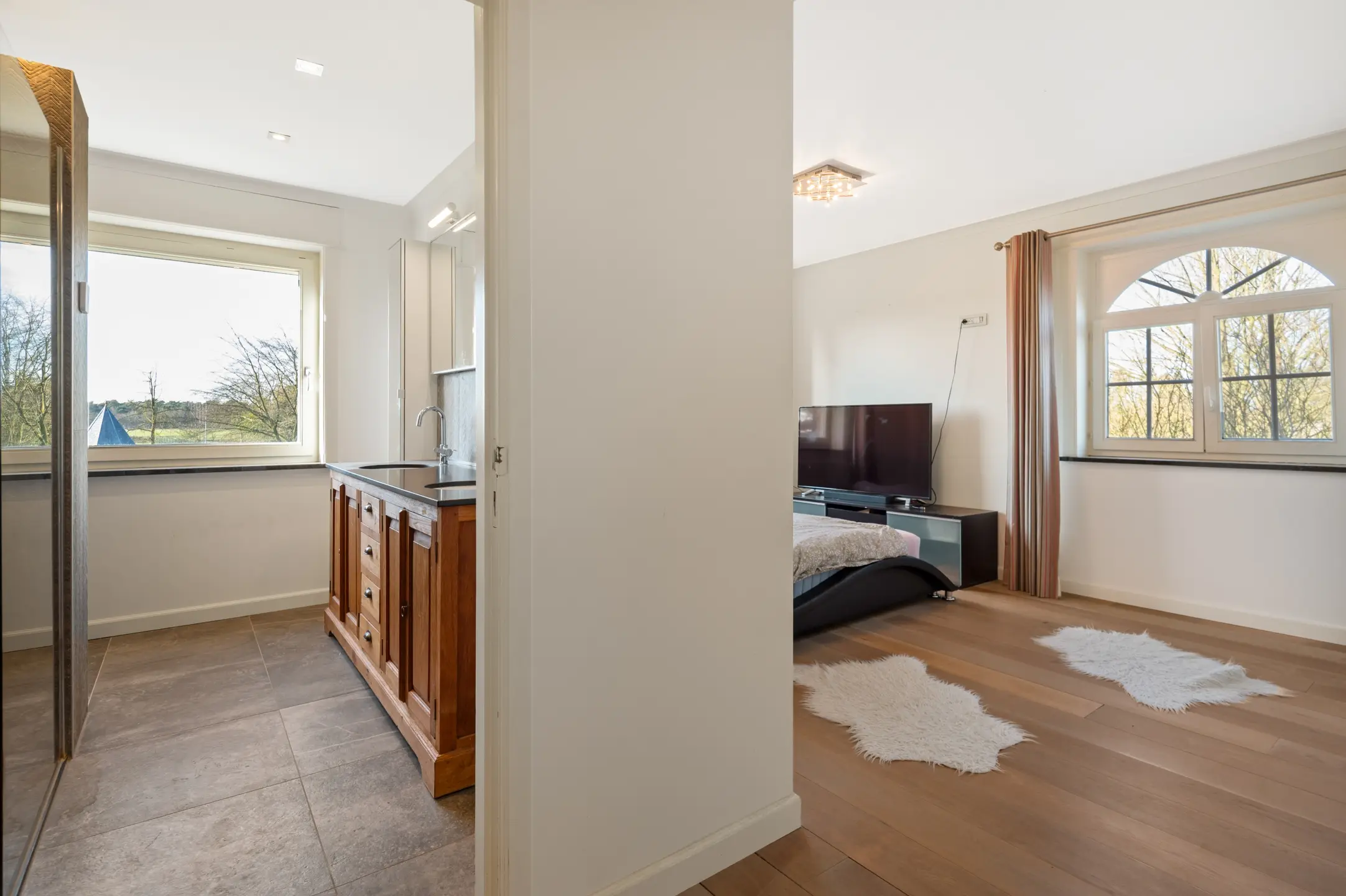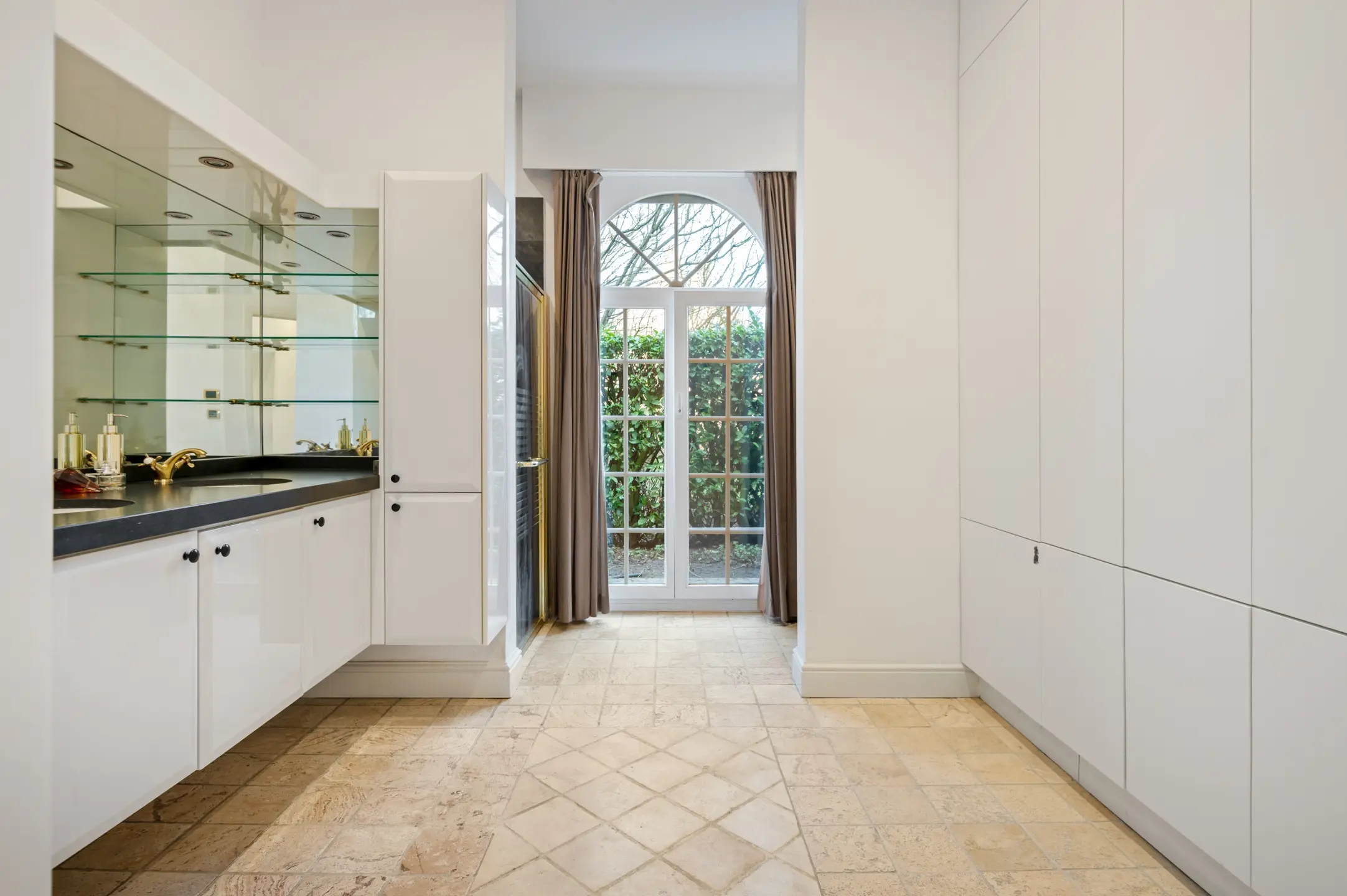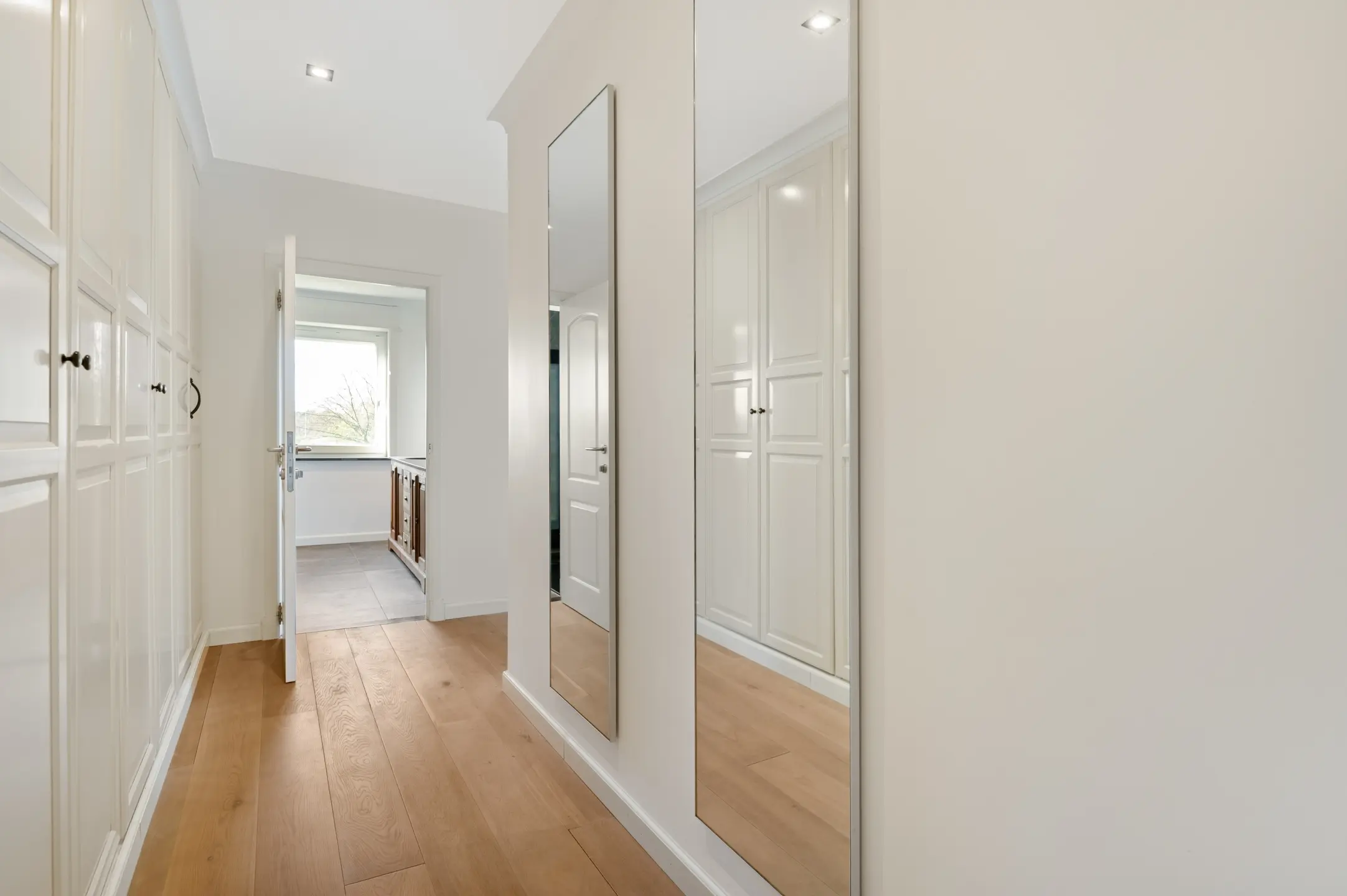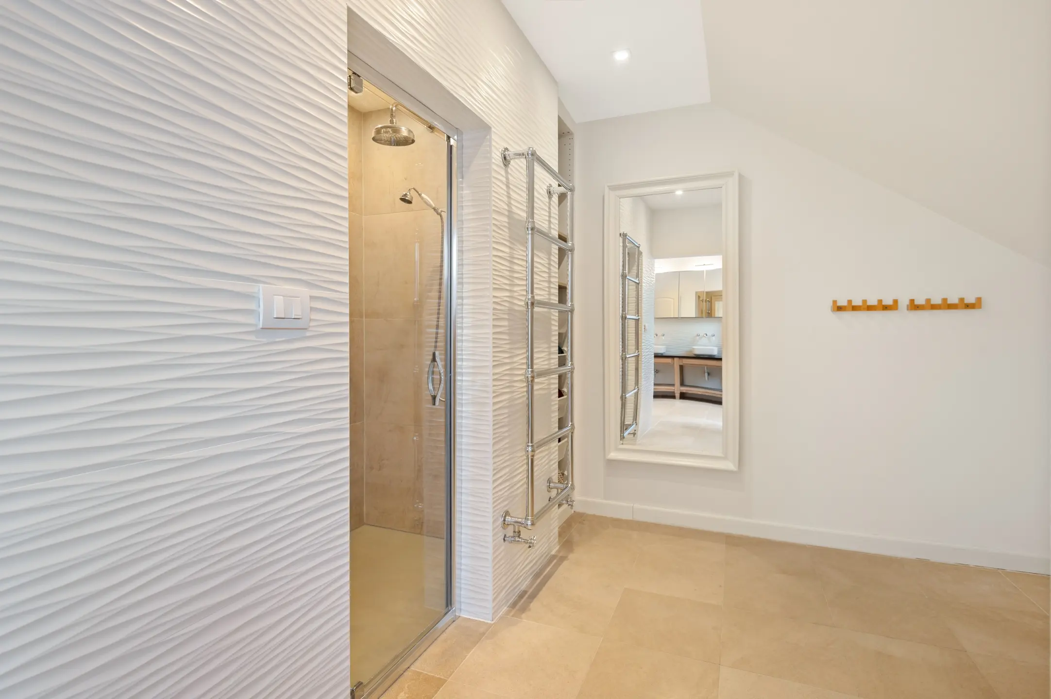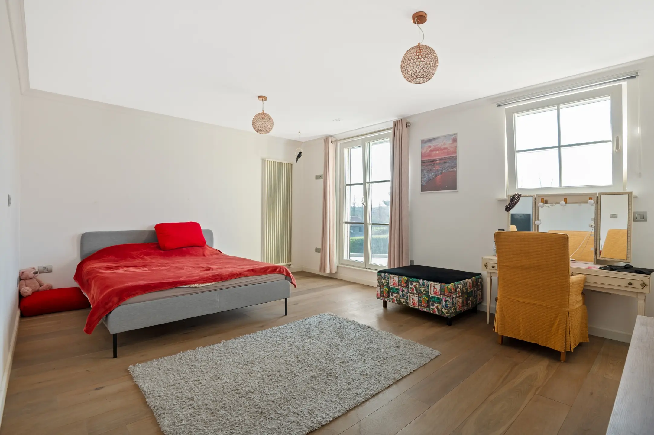 De indrukwekkende masterbedroom beschikt over een op maat gemaakte dressing met een praktische waskoker naar de benedenverdieping en een exclusieve ensuite badkamer. Deze is voorzien van een dubbele wastafel, een luxueuze inloopdouche met sunshower en vloerverwarming, wat bijdraagt aan een gevoel van comfort.