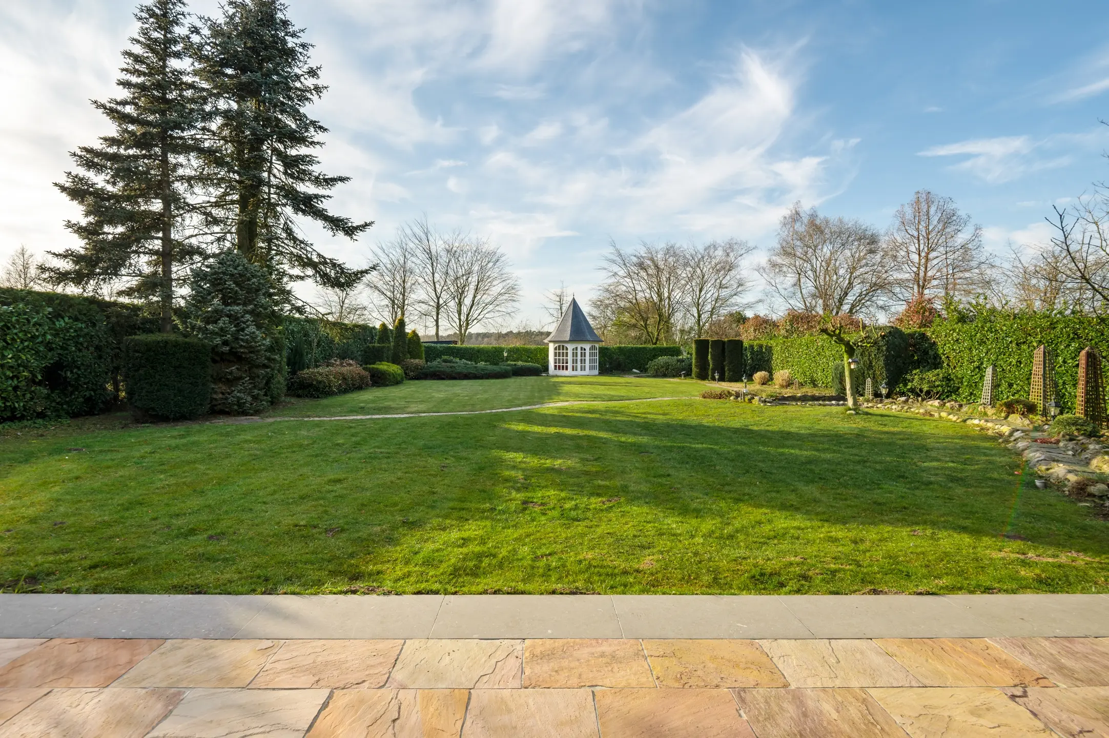 Als kers op de taart wordt deze idyllische tuin verrijkt met twee bronzen beelden en een elegante fontein, wat zorgt voor een exclusieve en luxueuze uitstraling.