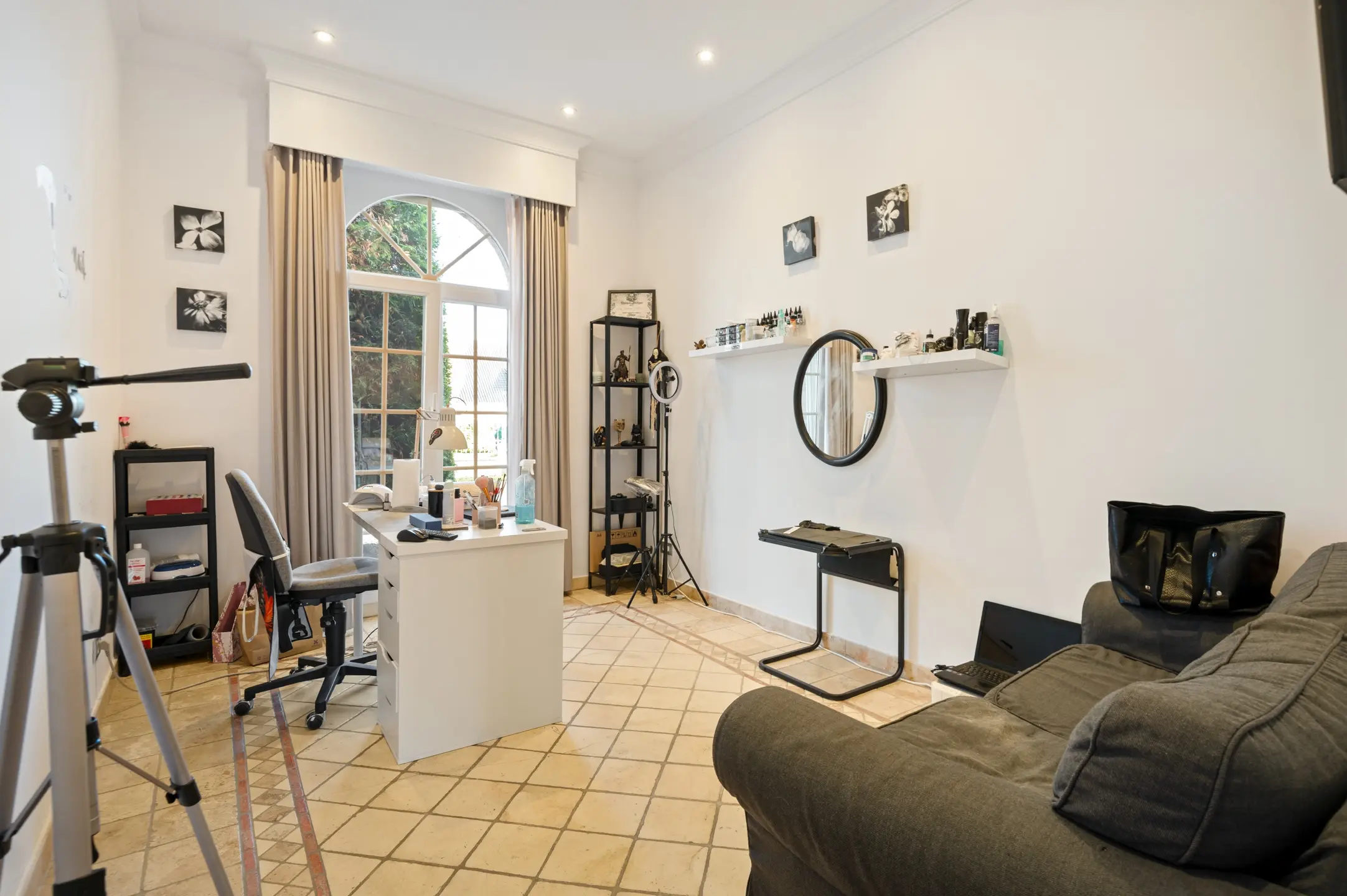 Via de hal bereiken we een functionele badkamer en een elegante bureauruimte met extra berging. De badkamer met wasplaats is uitgerust met ingebouwde kasten, een dubbele wastafel, een toilet en een douche. De badkamer beschikt over een waskoker die in verbinding staat met de masterbedroom op de eerste verdieping.