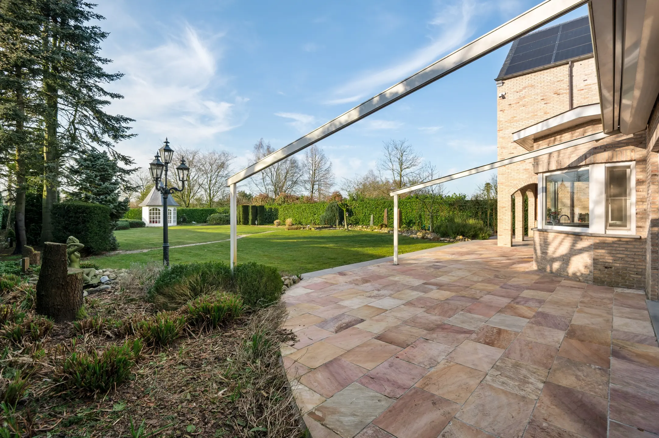 Achteraan het perceel bevindt zich een stijlvolle patio, afgewerkt met blauwe hardsteen en voorzien van stroomaansluitingen voor een jacuzzi. Hier grenst ook een elegante zonnekamer, waar u in alle seizoenen optimaal kunt genieten van de buitenruimte.