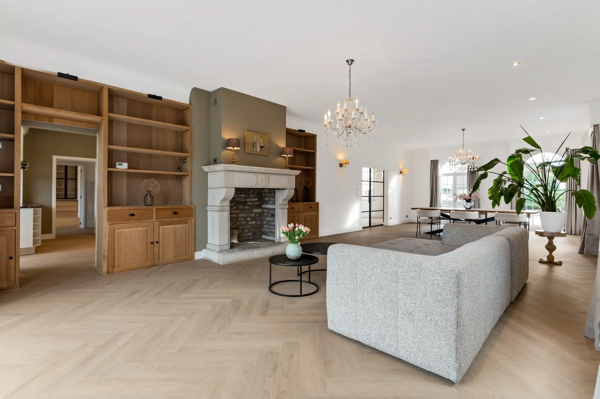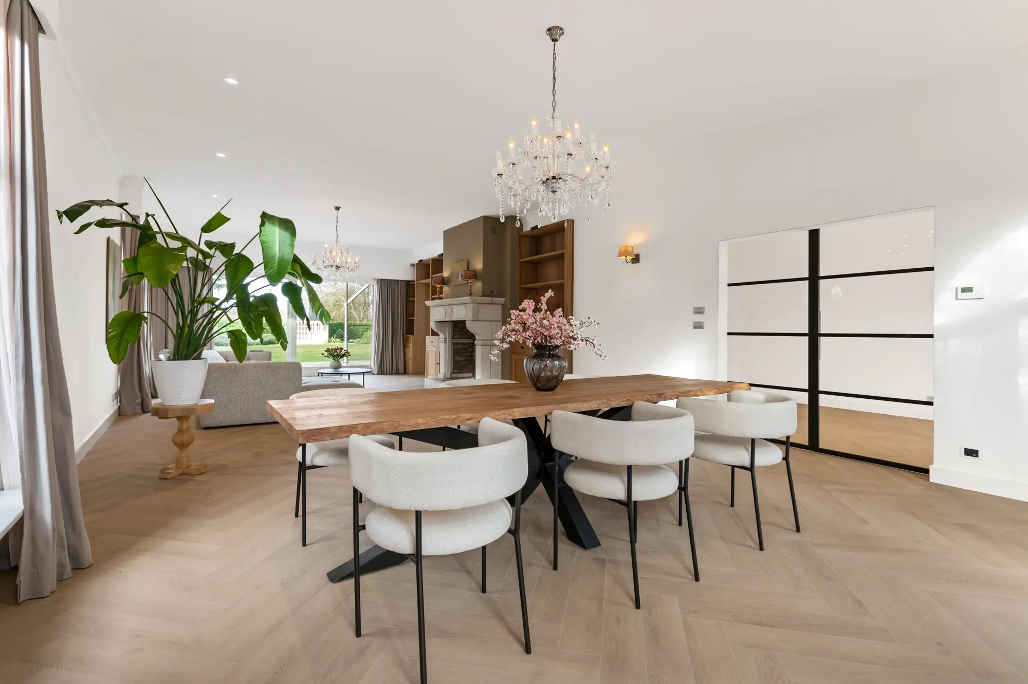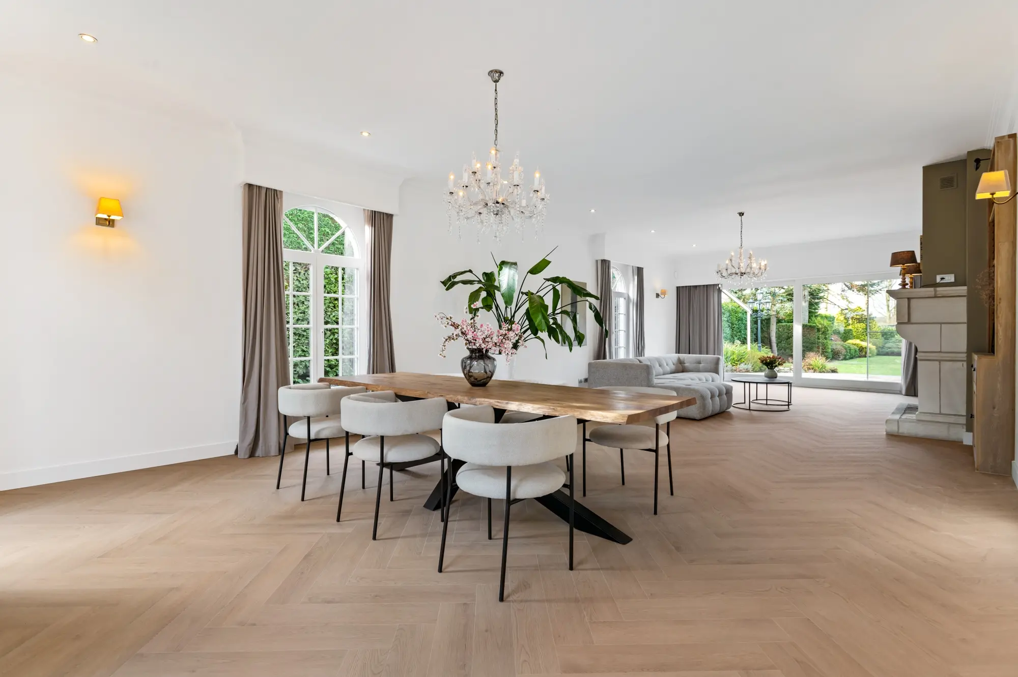 Zodra je deze deur passeert, valt de indrukwekkende plafondhoogte van 3 meter op, wat de hele gelijkvloerse verdieping een gevoel van ruimte en luxe geeft.