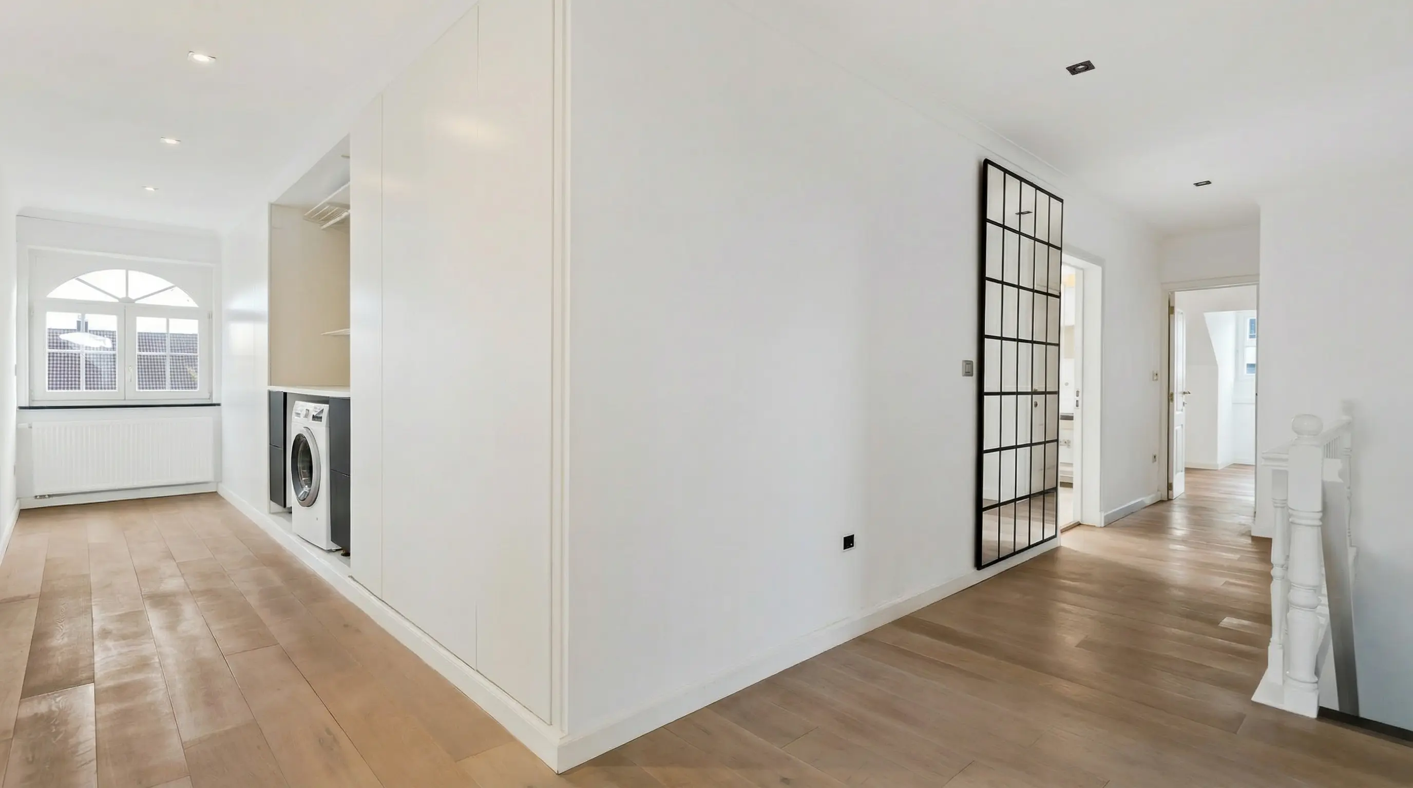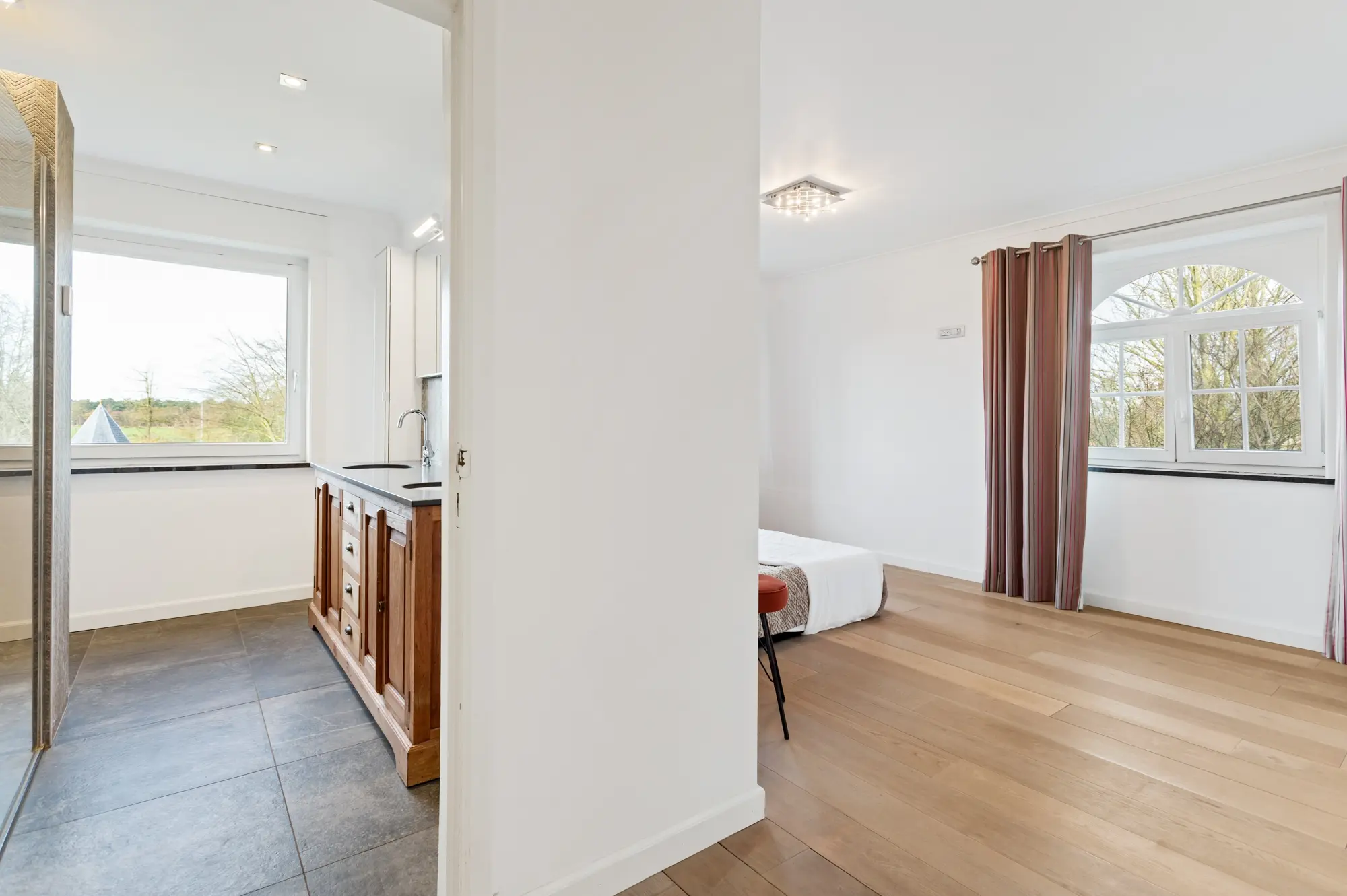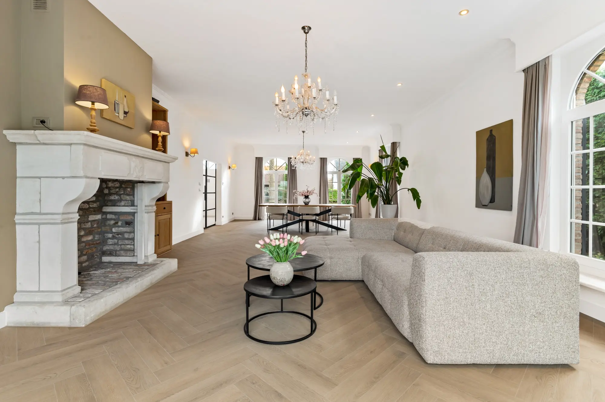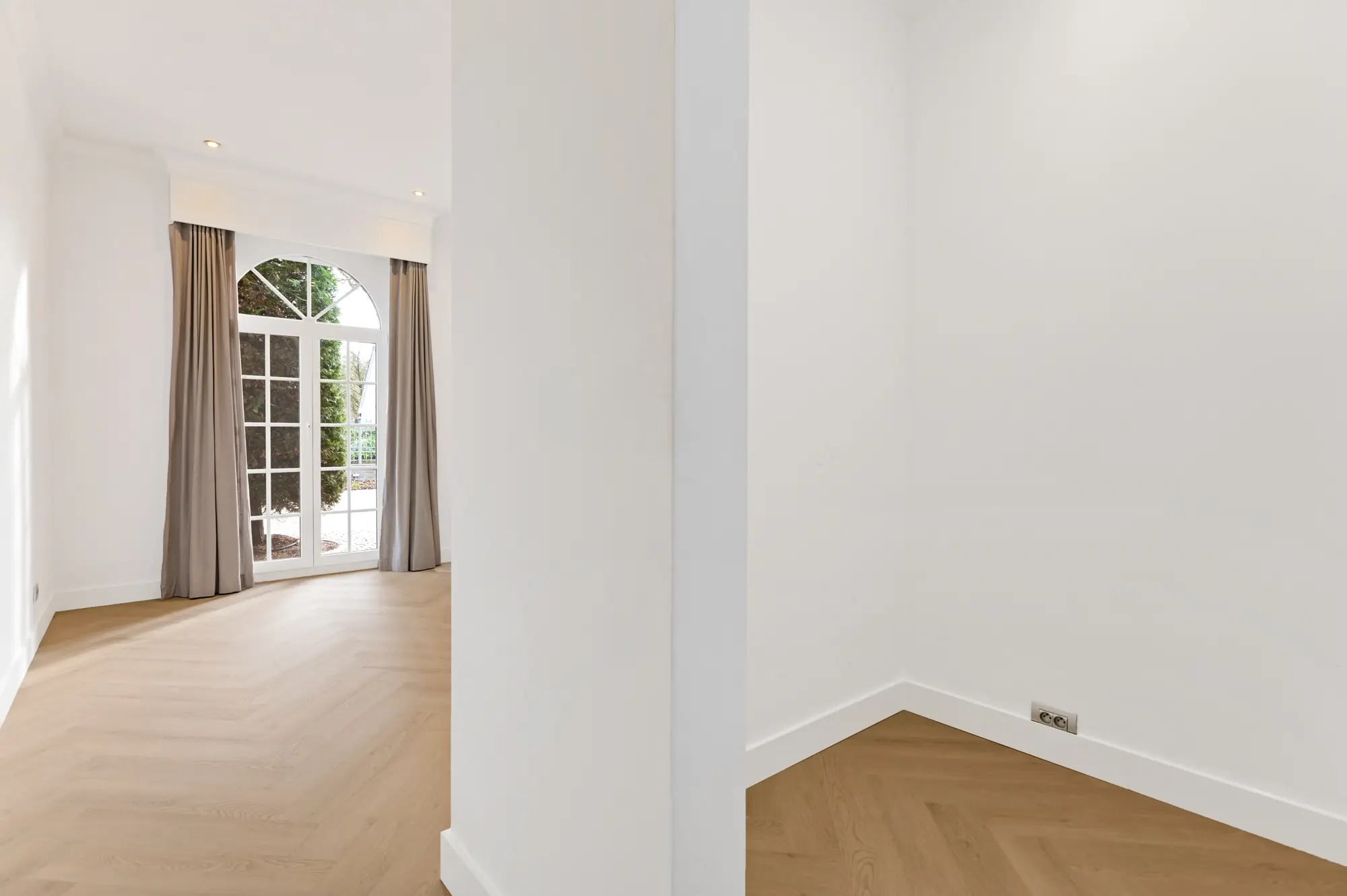 Zodra je deze deur passeert, valt de indrukwekkende plafondhoogte van 3 meter op, wat de hele gelijkvloerse verdieping een gevoel van ruimte en luxe geeft.